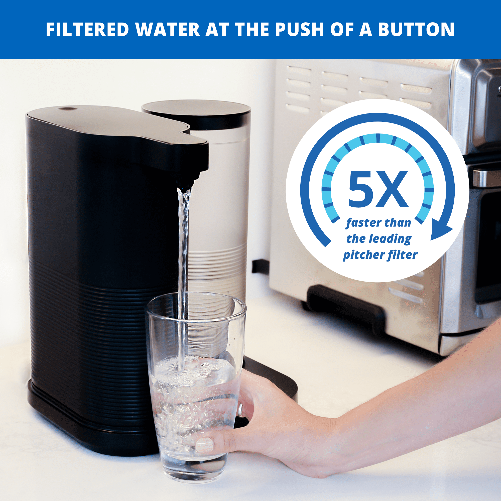 Our all-new Clean Water Machine instantly transforms ordinary tap water into clean, extraordinary water at the push of a button for 300 gallons. Traditional pitcher filters use gravity to slowly trickle water over filter granules, but the Aquasana Clean Water Machine uses power for super-fast and effective filtration, delivering an 8 ounce glass of clean, filtered water in only 8 seconds. The AQ-CWM is WQA tested and certified to NSF/ANSI Standards 42, 53 (includes P473), and 401 for the reduction of over 99% of lead, microplastics, and cysts; 97% of chlorine; 96% of mercury; and 95% of PFAS (specifically PFOA and PFOS) and VOCs. The system is also WQA tested and certified to reduce chloramine, asbestos, herbicides, pesticides, pharmaceuticals, and more while retaining naturally occurring beneficial minerals found in water like calcium, potassium, and magnesium. One Clean Water Machine filter lasts up to 7.5X longer than the leading pitcher filter, which means fewer filter replacements and more great-tasting water. The Clean Water Machine is made of sturdy, food-grade plastic that is 100% free of BPA. There is no need to disconnect or hook up water lines with this countertop water dispenser. Simply plug in, fill, and start enjoying clean, healthy water for all your needs. Use only genuine Aquasana replacements. Untested replacements are not certified for performance capacity or contaminant removal.