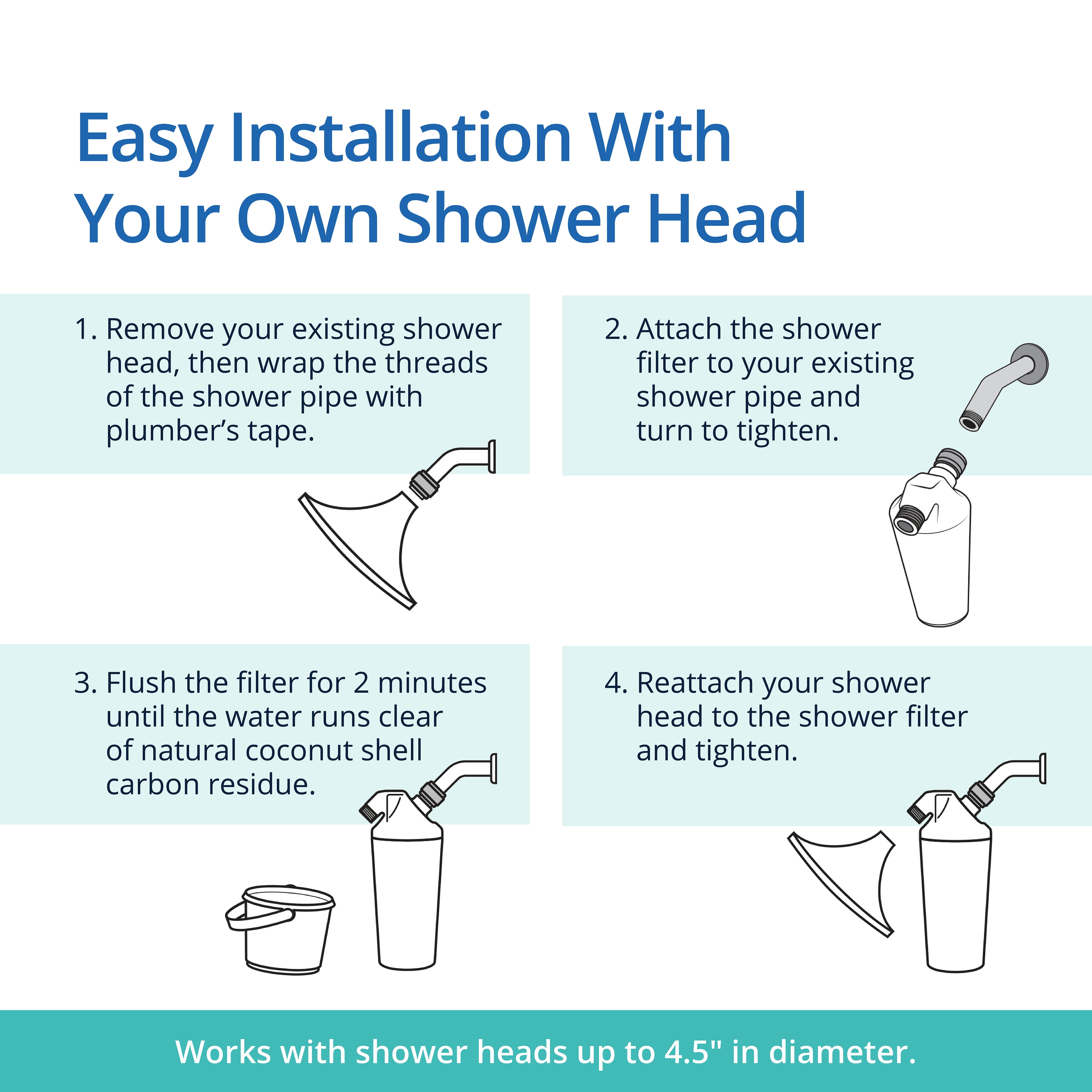 Dermatologist recommended for softer skin, luscious hair, and easier breathing Award-winning performance trusted by Women’s Health, Cosmopolitan, Elle and more Independently tested to NSF/ANSI Standard 177 to reduce 90%+ chlorine Each filter provides up to 6 months or 10,000 gallons of purified water Our eco-friendly shower filter uses coconut shell carbon and copper-zinc media DIY installation; fits standard ½” shower arms, replace every 6 months