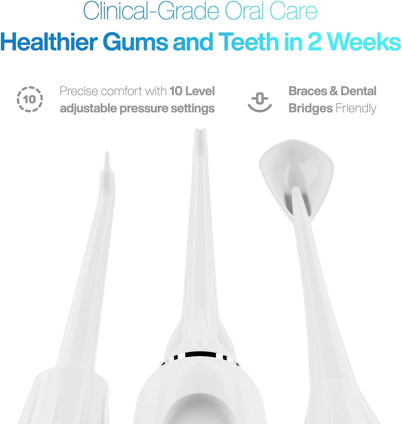 Flossing Made Easy: Aqua Flosser PRO has been clinically proven to be up to 5x more effective than traditional flossing in 90% less time. The extra large capacity water reservoir holds 20 oz. of water, which means less filling and more flossing. It includes 4 jet tips, has 2 usage modes, and 10 water pressure levels for a soft or strong micro jet stream. Compare Aqua Water Flosser PRO to more expensive competitors that aren’t nearly as effective. Go Beyond Brushing: 2 modes in 1 sleek, compact device. “Clean” mode flosses teeth were your toothbrush cannot reach, and “Massage” mode is designed to massage gums, boosting circulation and improving gum health. Aqua Flosser PRO comes with 2 micro jet-stream nozzles, 1 tongue scraper, and 1 periodontal tip. This clinical grade oral care device will provide your most confident smile ever. Cuts Flossing Time by 90%: We guarantee a more thorough clean in much less time compared to traditional string flossing. You’ll achieve healthier gums and teeth in as little as 2 weeks. You’ll notice fresher breath and whiter teeth by removing stubborn stains and food stuck between teeth. Aqua Flosser is more eco-friendly and saves money over time compared to string floss. Stylish, Convenient & Easy to Use: The modern, sleek and compact design of the Aqua Flosser PRO provides a stunning addition to any bathroom vanity. The large water reservoir eliminates the inconvenience of frequent refilling, the lightweight handle is easy to maneuver, and the clean interface is simple to use. Superior for Braces & Dental Work: Aqua Flosser PRO is ideal for those with braces or other dental devices as its 360 degree rotary tips can reach places that traditional floss cannot. The result is a superior and more thorough clean in half the time. Your dentist, orthodontist or prosthodontist will notice the difference.