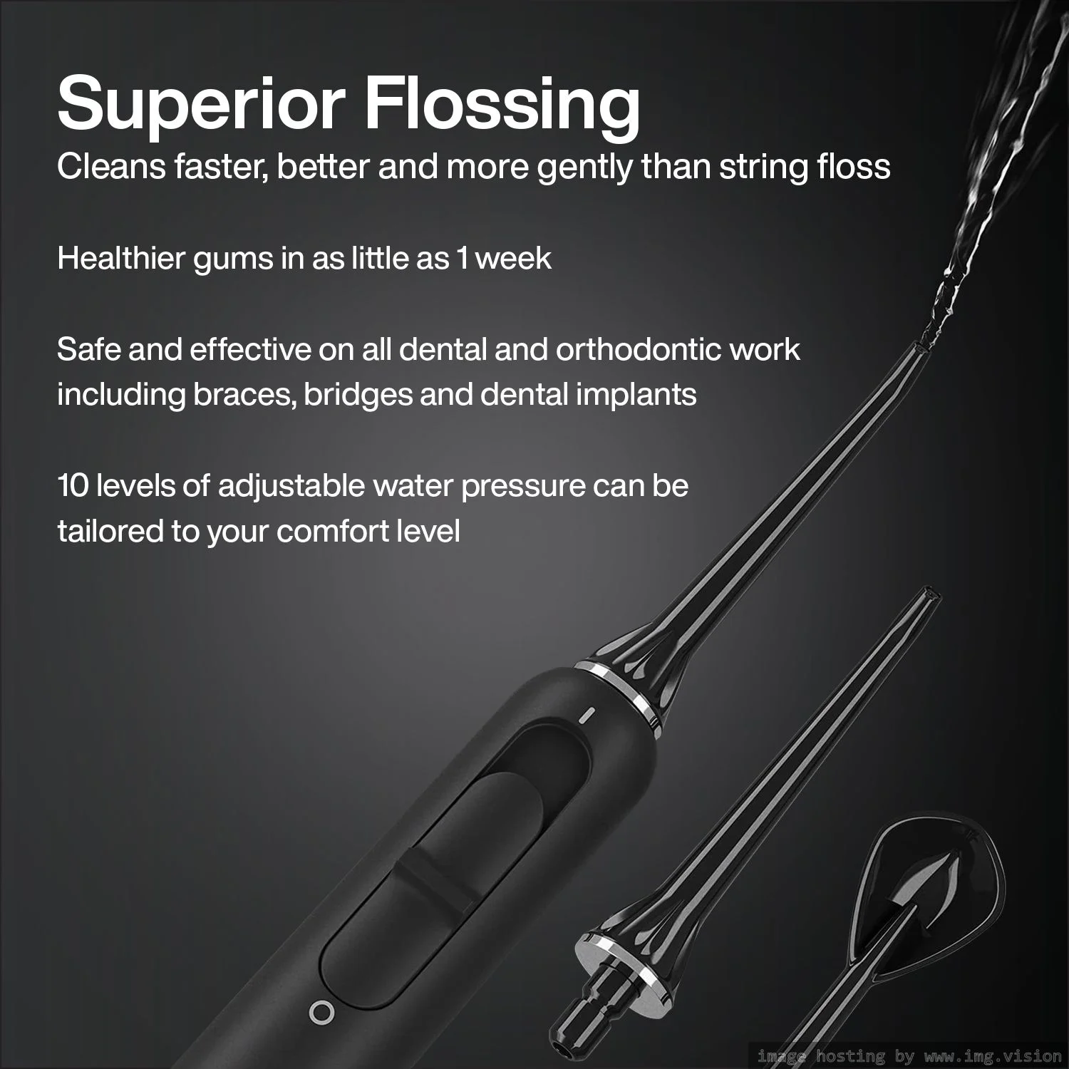 Complete Oral Care System – The HDCPro is an all-in-one solution designed for a superior oral hygiene routine. This sleek countertop setup includes an advanced power toothbrush with cutting-edge technology and a high-performance water flosser with multiple pressure settings—all in a compact, space-saving design. Advanced Water Flosser – The HDCPro water flosser delivers a powerful and convenient cleaning experience. It features a hygienic 600ml water tank and a 10-level adjustable pressure dial for a customized flossing routine. Deep Clean and Massage modes provide targeted cleaning and gum stimulation for a healthier smile. High-Performance Power Toothbrush – Experience next-level cleaning with the Black Series Pro electric toothbrush. It delivers 50,000 vibrations per minute, features 5 brushing modes, and includes a smart vibrating timer to guide your brushing routine. A lithium-ion battery and ultra-fast conductive charging ensure effortless convenience. Compact & Stylish Design – Measuring just 6 inches across and 3 inches wide, HDCPro saves valuable counter space while maintaining a sleek, modern aesthetic. Built with premium materials, including ultra-hygienic satin rubber and anodized metallic finishes, it’s a stylish addition to any bathroom. What’s in the Box – 1 HDC Pro Countertop Setup, 1 [Black or Vibe] Series Pro Electric Toothbrush, 6 ProFlex Brush Heads, 2 Standard Tips, 1 Tongue Scraper.