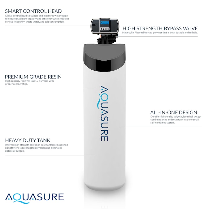 - Every AQUASURE water softener is constructed with a high-strength, corrosion-resistant, fiberglass-lined polyethylene tank, durable bypass valve, and prefilled premium-grade resin, it also comes with a 5-year manufacturer warranty