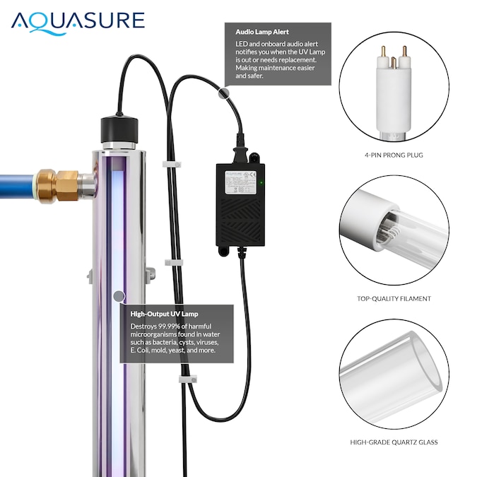 - Powerful UV Performance: Aquasure’s 39W Ultraviolet-C sterilizer light system is rated for 9,000 hours, ensuring continuous purification to keep your water safe and healthy.