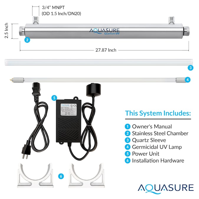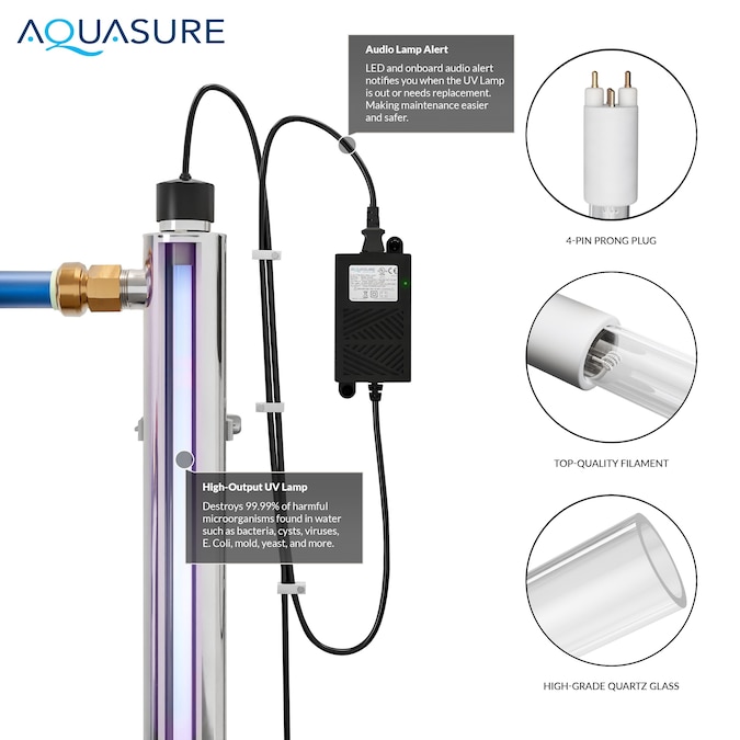 - A 8 GPM system is powerful enough to disinfect the whole house for cooking, bathing, and cleaning, AQUASURE 39-Watt UVC light system ensure continuous purification by running 24/7, day and night to keep water safe and healthy