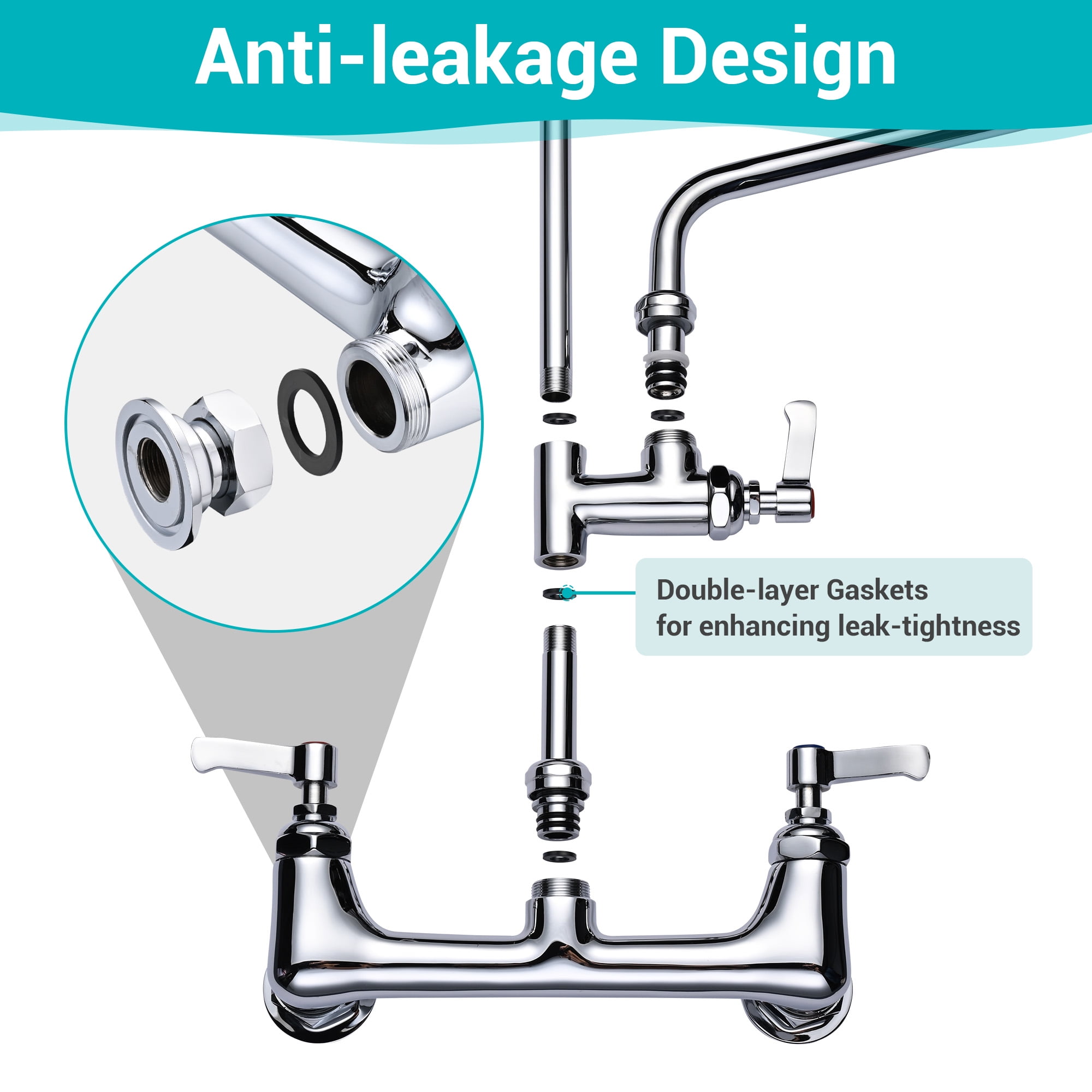 Efficient & Safe Rinsing – High efficiency sprayer for fast rinsing; cUPC & NSF certified for water safety Durable Construction – Rustproof stainless steel spring, hose of sprayer supports 100,000 times of bending Flexible Sprayer & Swivel Faucet – Spring hose can be easily stretched to any corner; Swivel add-on faucet rotates 360° Easy Adjustment – Double lever handles adjust water temperature & flow rate easily Anti-leakage Design – Double-layer gaskets on all the joints enhance leak-tightness