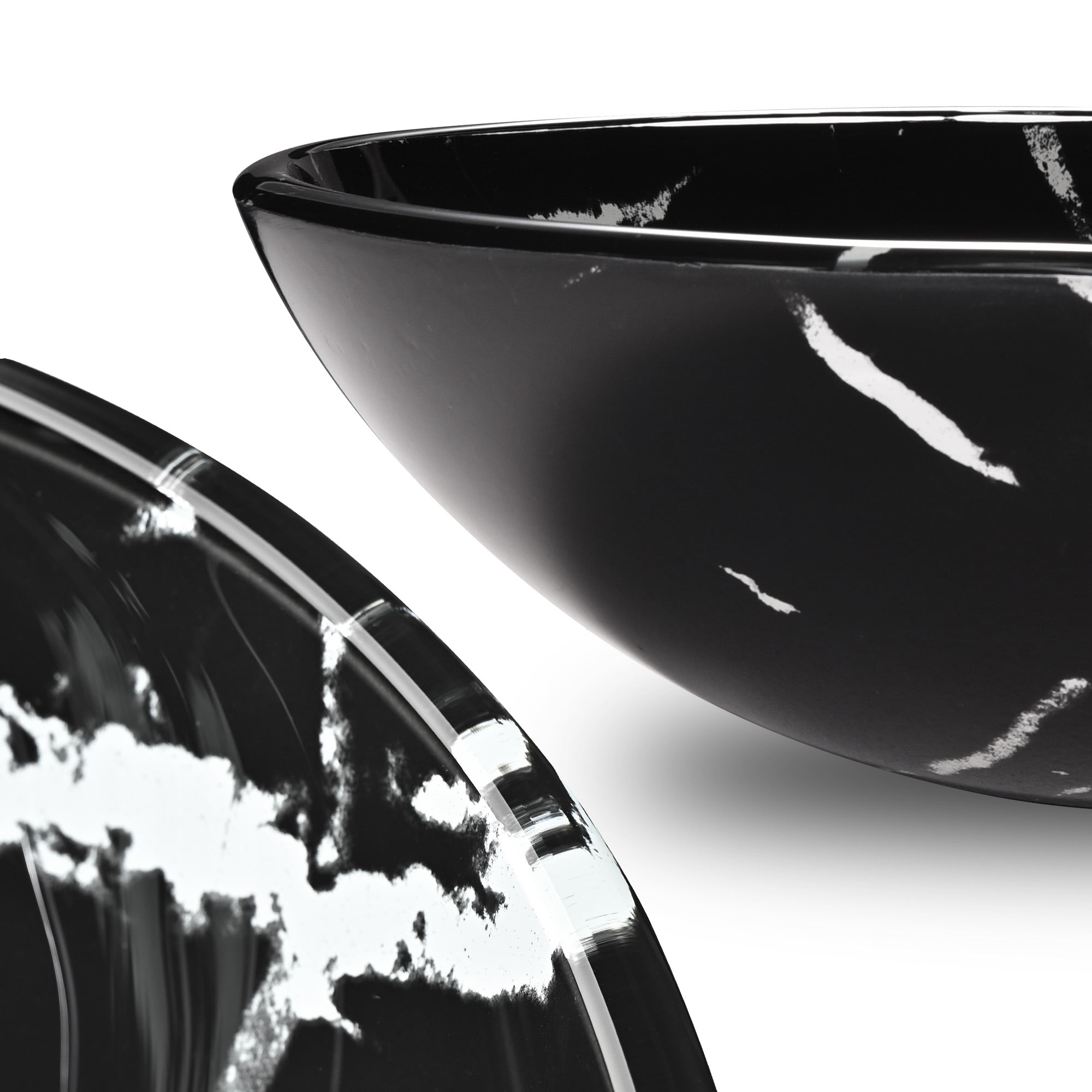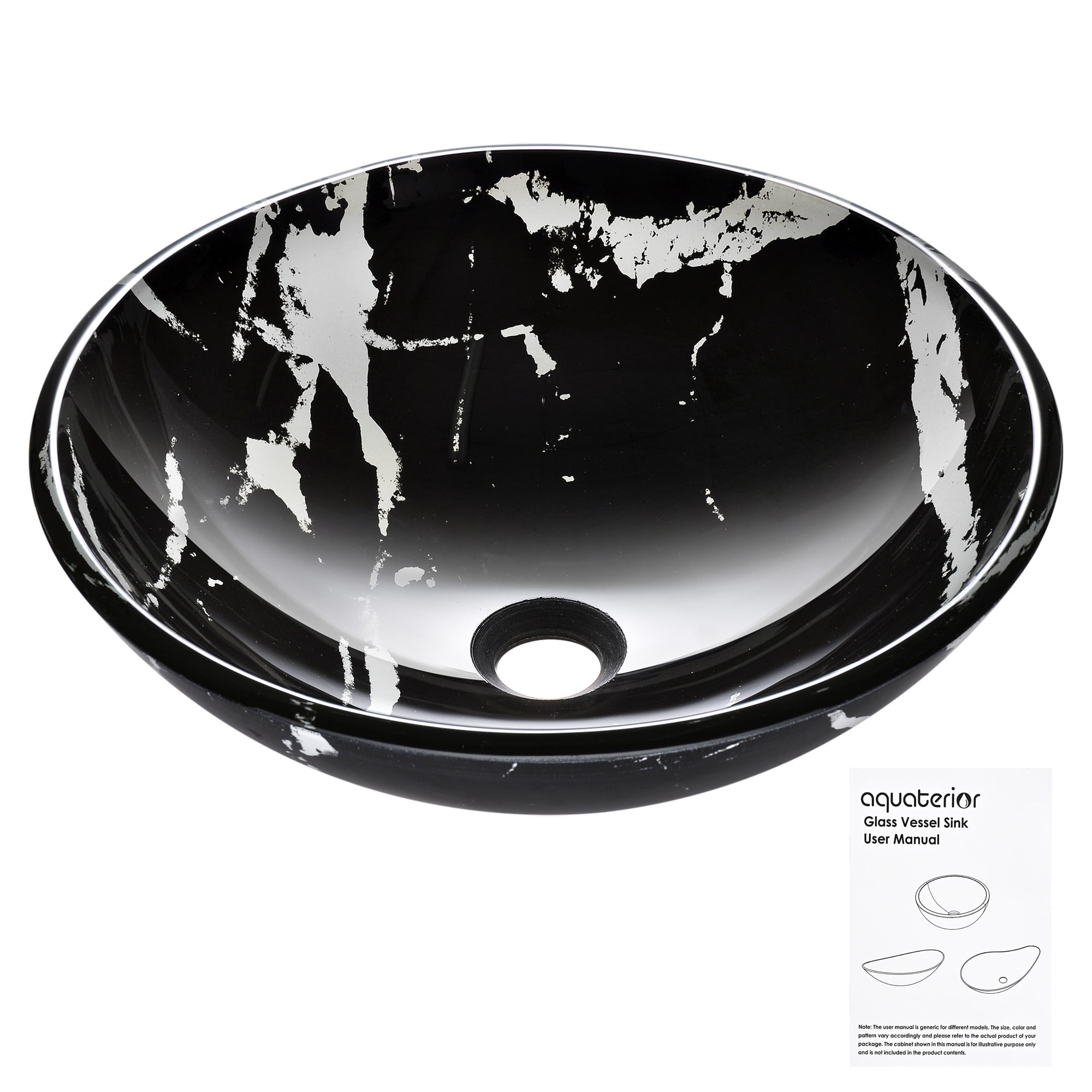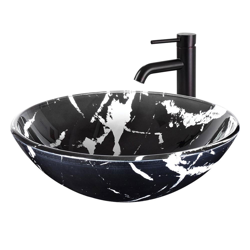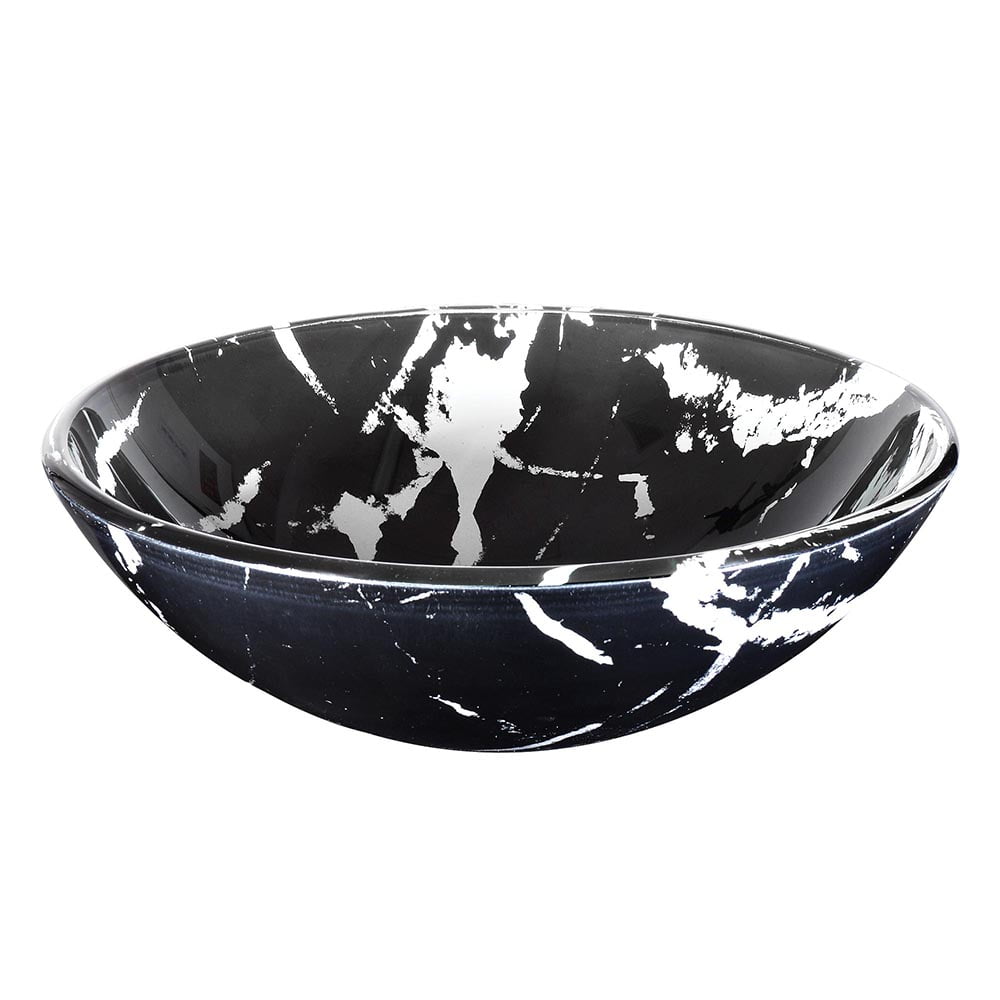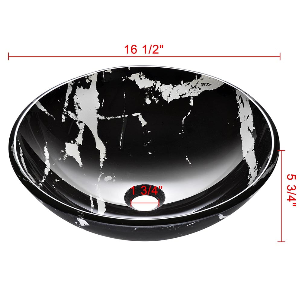 Round shape vessel sink, solid tempered glass construction Contemporary and sleek marbling pattern, fits perfectly with any bathroom decor Overall dimension (Dia. x H): 16-1/2″ x 5-3/4″; Drain hole dia.: 1-3/4″ Glossy glass interior, scratch resistant and easy to clean up Without overflow; Easy countertop installation