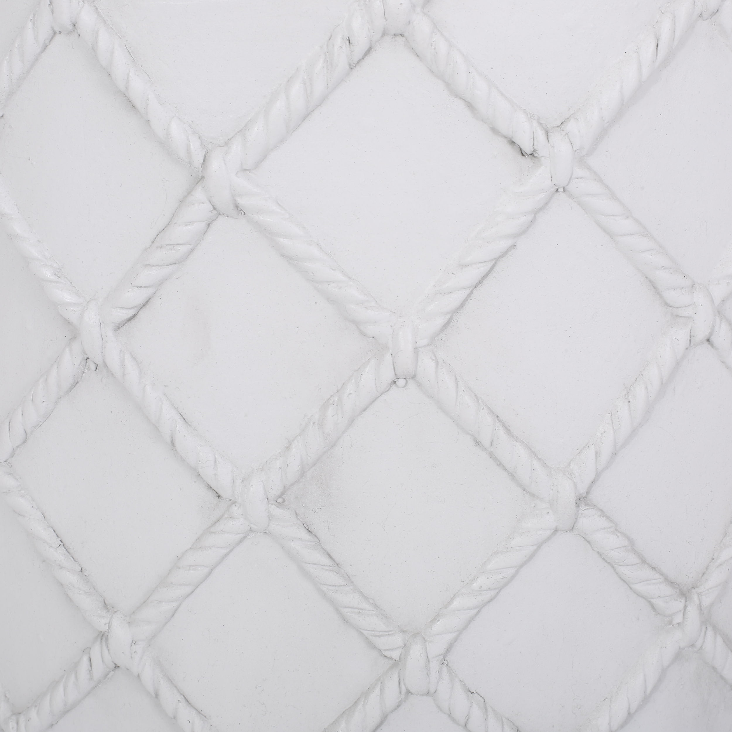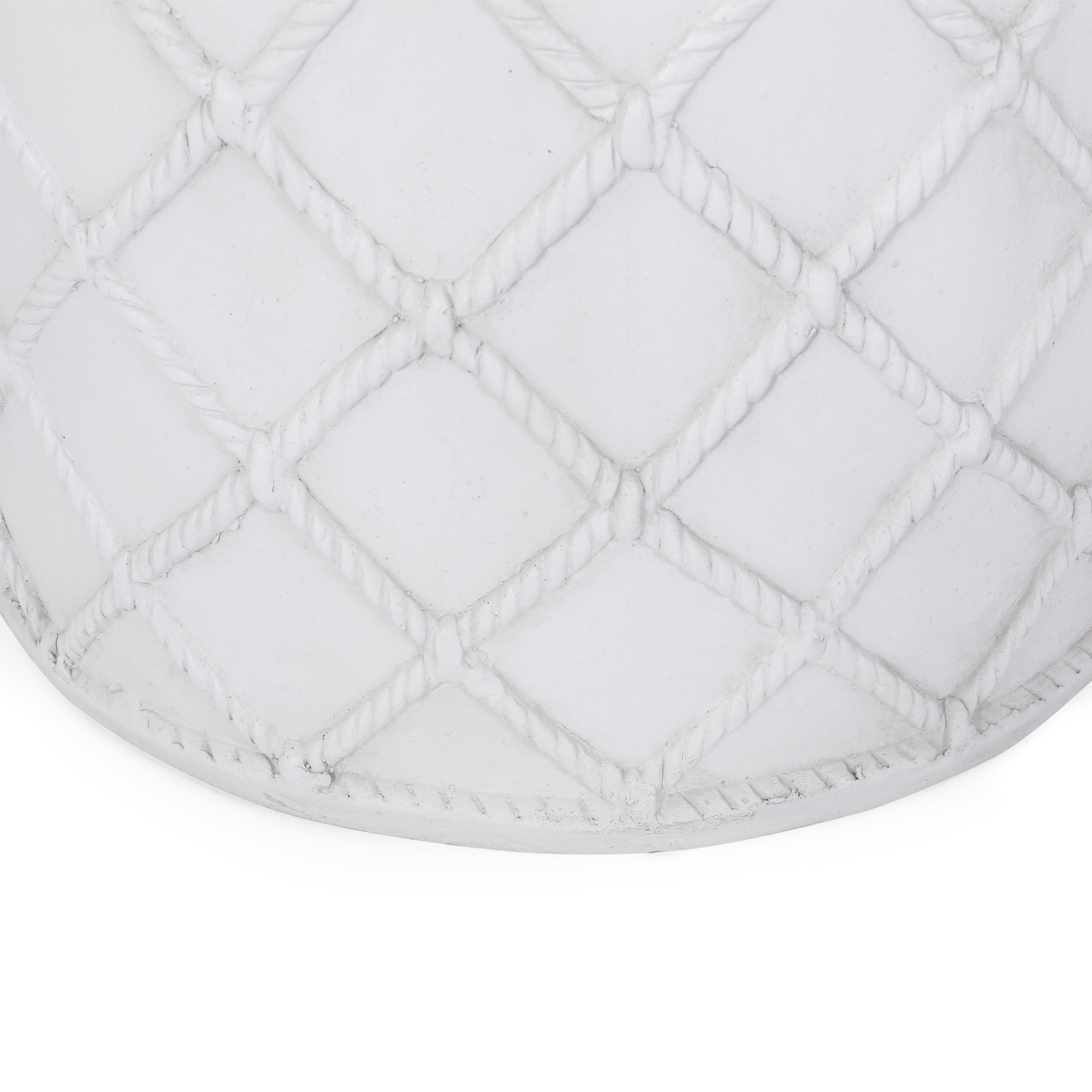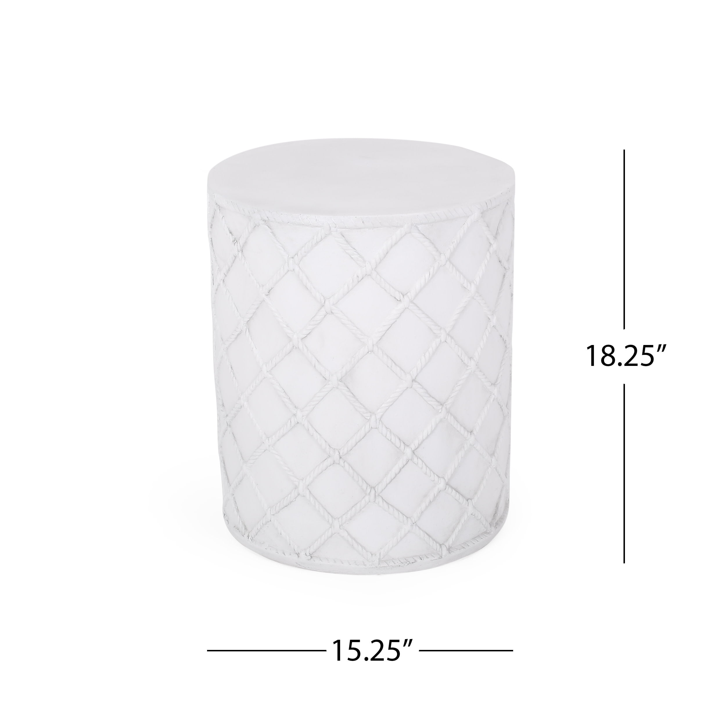 Round out your outdoor space with an accessory of breezy aesthetics and versatile function. With a smooth lightweight concrete structure and modern touch, our side table offers high durability and stunning looks for your backyard or patio. Perfect as a decorative piece or as an end table next to your chat set or sectional, this piece will hold any snacks or chilled drinks in sophisticated grace. Finished with a nautical diamond rope pattern, this table is a seamless addition to any space. A TOUCH OF PERSONALITY: Bring your outdoor space to life with our end table that features a simple cylindrical structure and a nautical diamond rope pattern. With charming aesthetics, this side table will be sure to enliven any home. MODERN DESIGN: Featuring an understated design, this side table offers the look, feel, and design of a chic modern piece. With a minimalistic yet refined structure, this table brings out a simplistic style that emphasizes functionality. LIGHTWEIGHT CONCRETE: This side table is constructed with lightweight concrete for a smooth look. This provides a highly durable structure that can hold a substantial amount of weight. DIMENSIONS: Choose an accessory that is the perfect size for you and your furniture. This accent table is 15.25″ W x 15.25″ D x 18.25″ H. You will love how much your space can transform with the simple addition of this charming table. NO ASSEMBLY: This side table comes ready to use straight out of the box. No assembly is required.
