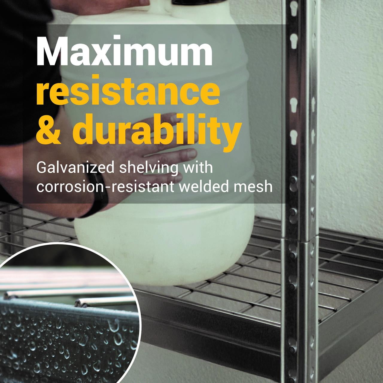NSF Certified for Food & Commercial Use – Meets strict public health and safety standards, making it suitable for restaurants, kitchens, medical storage, and food-grade environments. Military-Grade Galvanized Steel Frame – Engineered to outlast under the toughest conditions, offering unmatched resistance to rust, corrosion, and wear. Medium Duty 2,400 lb Total Weight Capacity – Supports up to 600 lbs per shelf (evenly distributed), perfect for bulk supplies, heavy tools, or industrial equipment. Fire-Safe Wire Mesh Shelves – Durable, ventilated decking reduces fire risk and complies with commercial safety standards. Ideal for high-traffic storage areas. Spacious Heavy-Duty Design (71″ W x 71″ H x 20″ D) – Provides ample storage space for large, bulky, or oversized items. Great for warehouses, garages, and commercial backrooms. Adjustable Shelves for Custom Storage – Reposition shelves quickly and easily to fit equipment of all shapes and sizes. Rust-Resistant Galvanized Finish – Built for extreme environments, resists humidity and oxidation better than powder-coated alternatives. Fast, Tool-Free Assembly – Quick setup with two people – no bolts or complicated instructions. Get organized in minutes. Multipurpose Use – Residential & Commercial – Perfect for use in food service, medical supply storage, industrial warehouses, garages, basements, or retail stockrooms. Stable & Secure – Wide footprint and reinforced frame ensure stability even when fully loaded.
