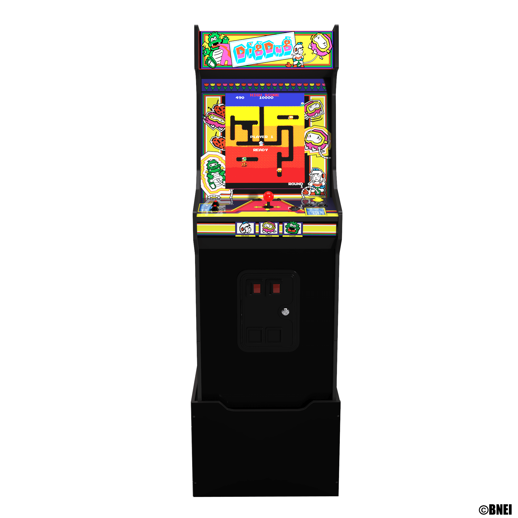 For the first time ever in a BANDAI NAMCO Entertainment Inc. Legacy home arcade game machine, you’ve got WiFi leaderboards! With no subscription required, see how your high scores measure up to other retrogamers with this Arcade1Up BANDAI NAMCO Entertainment Legacy Arcade Game DIG DUG™ Edition. Bringing you authentic (and yes, way nostalgic!) arcade experiences in an easily assembled design, Arcade1Up game machines are must-haves for your family game room, fan cave, or a welcome distraction in the office. They play great, look great, and are instant conversation pieces. No quarters required! Originally founded under the name Nakamura Seisakusho in 1955, the company that would become BANDAI NAMCO Entertainment Inc. was initially in the coin-operated amusement ride business. Entering the video game industry at the end of the ‘70s, BANDAI NAMCO Entertainment Inc. titles would quickly change the world of entertainment forever. With their release of GALAXIAN™, GALAGA™, and PAC-MAN™ — the best-selling arcade game of all time — BANDAI NAMCO Entertainment Inc. titles were instrumental in ushering in the golden age of arcade games and have impacted pop-culture across generations. Then of course there was the underground antics and sub soil strategy of DIG DUG, the marquee game in this phenom-tastic throwback Legacy game machine. Defeat those enemies by over inflatin’ ‘em, or introduce them to the weight of some rock crushin’. All in lighthearted comical fun! Oh, and hope you’re ready to really dig in, because the Arcade1Up BANDAI NAMCO Entertainment Legacy arcade game DIG DUG™ Edition includes a lineup of 14 games, in this gorgeous cabinet that includes a matching riser and light-up marquee.