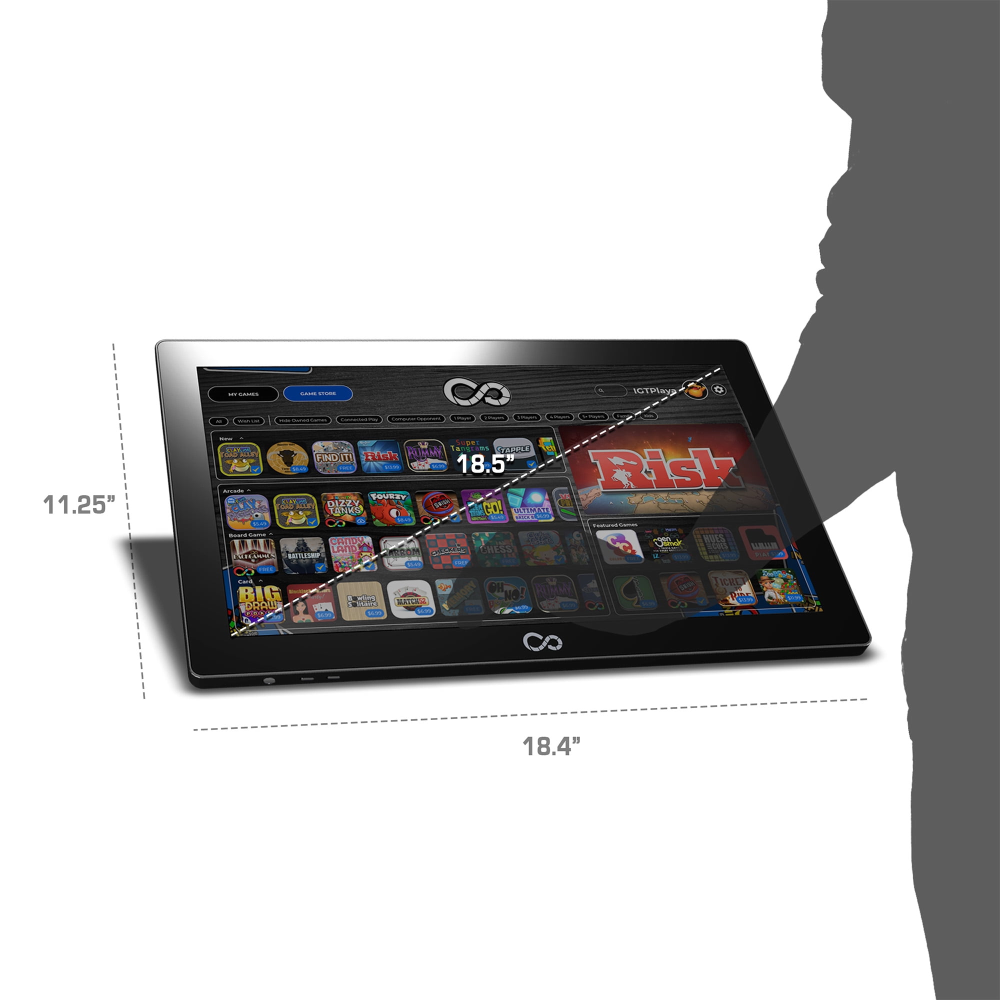50 included board games and activities (comes with a selection of Classic Hasbro Games such as Monopoly, Yahtzee, Trivial Pursuit, Clue , Scrabble , Operation, Candyland and more) and find 50+ other games in the store! 18.5-inch HD touchscreen Dynamic zoom viewing (for selected games only) Responsive tactile feedback Gameplay up to 6 players Wi-Fi connectivity Online play (for selected games) Allows players to save the game and pick back up later where they left off (for selected games) Play on the go with an external battery (same battery as IGT and sold separately). 4 card blockers Assembled Dimensions: 18.4”L x 11.25”W x 2.25’H (18.4”L x 11.25”W x 3.25” H after extended the legs). Box Dimensions: 23.75″W x 4 “H x 15.75” L. Resolution: 1920 x 1080. Weight: 7.4 lbs. Memory: 16 GB. Adjustable Volume