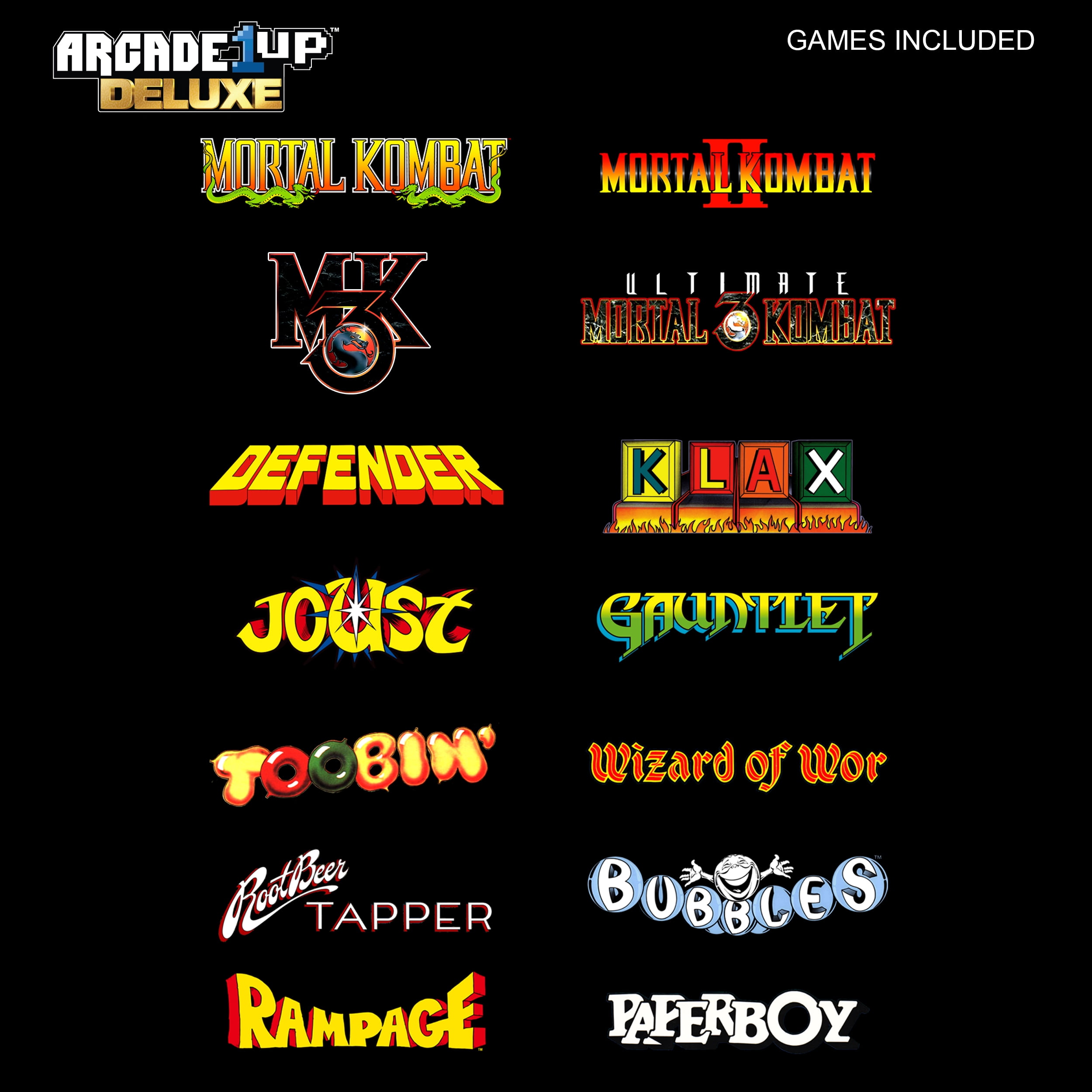 Arcade1Up Mortal Kombat II Classic Arcade Game with 4-foot-tall stand-up cabinet, Black, 62 lb Wi-Fi enabled with online leaderboards and online multiplayer to challenge players worldwide Dual speakers provide crisp arcade sound for an immersive gaming experience Features a 17-inch color monitor for vibrant visuals Real feel joysticks and buttons for authentic arcade gameplay Includes 14 classic games: Mortal Kombat, Mortal Kombat II, Mortal Kombat 3, Ultimate MK 3, Toobin, Rampage, Joust, Wizard of Wor, Gauntlet, Rootbeer Tapper, Defender, Bubbles, Paperboy, and Klax