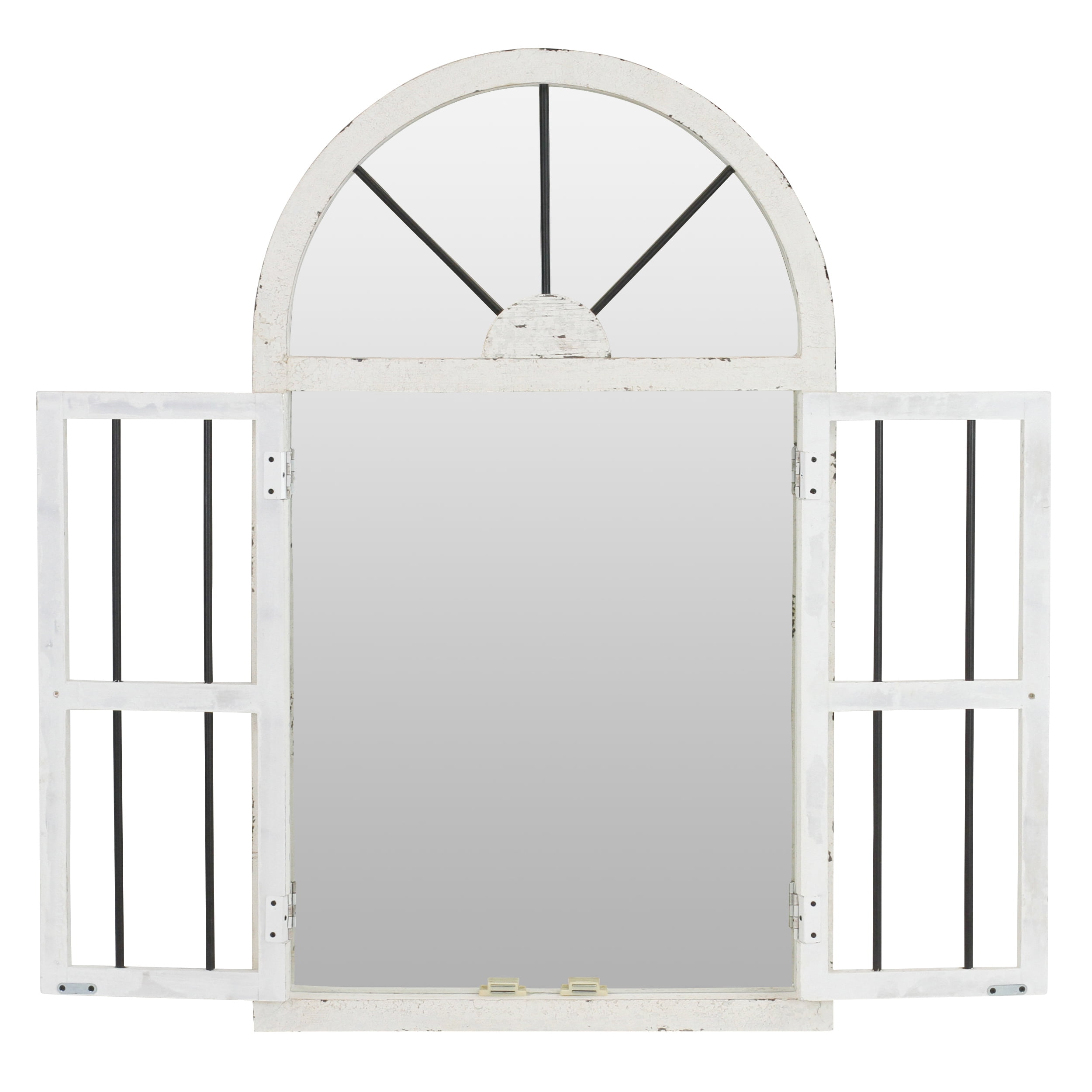 With character to spare, this wall mirror makes a great addition to any cottage chic decor. Featuring a wood frame with distressed white finish. The doors swing 180 degrees on hinges to reveal an unobstructed mirror beneath. Keep the doors closed or keep them open for whatever look you prefer.