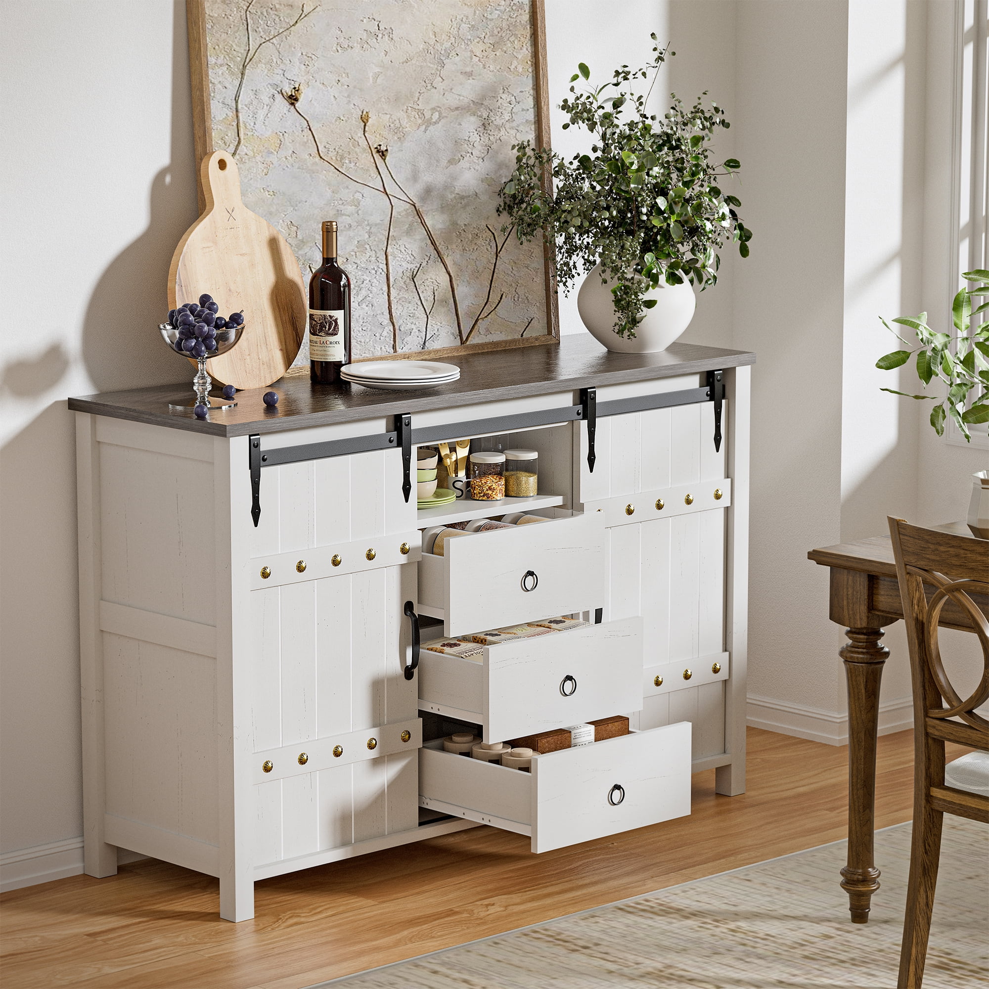 Features three drawers with two doors and a shelf Made of wood 3 Doors with a single large compartment Shelf Dimensions: 8″D, 36.5″W, 1″H; Drawer Dimensions: 11.5″D, 5″W, 7.5″H Compartment 1: 36.5″D, 8″W, 1″H for door inside; Compartment 2: 11.5″D, 5″W, 7.5″H for drawer inside Floor to bottom measurement: 4″