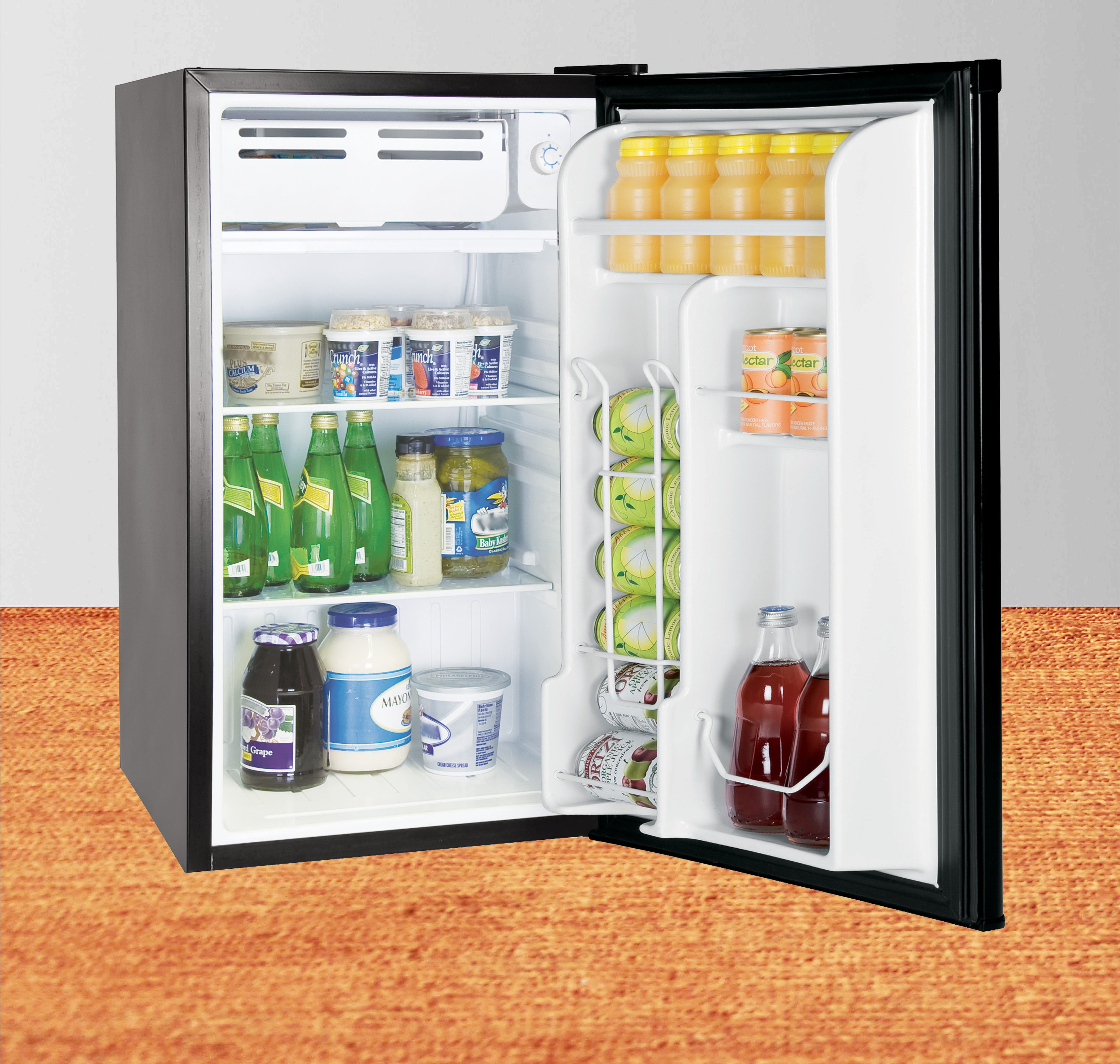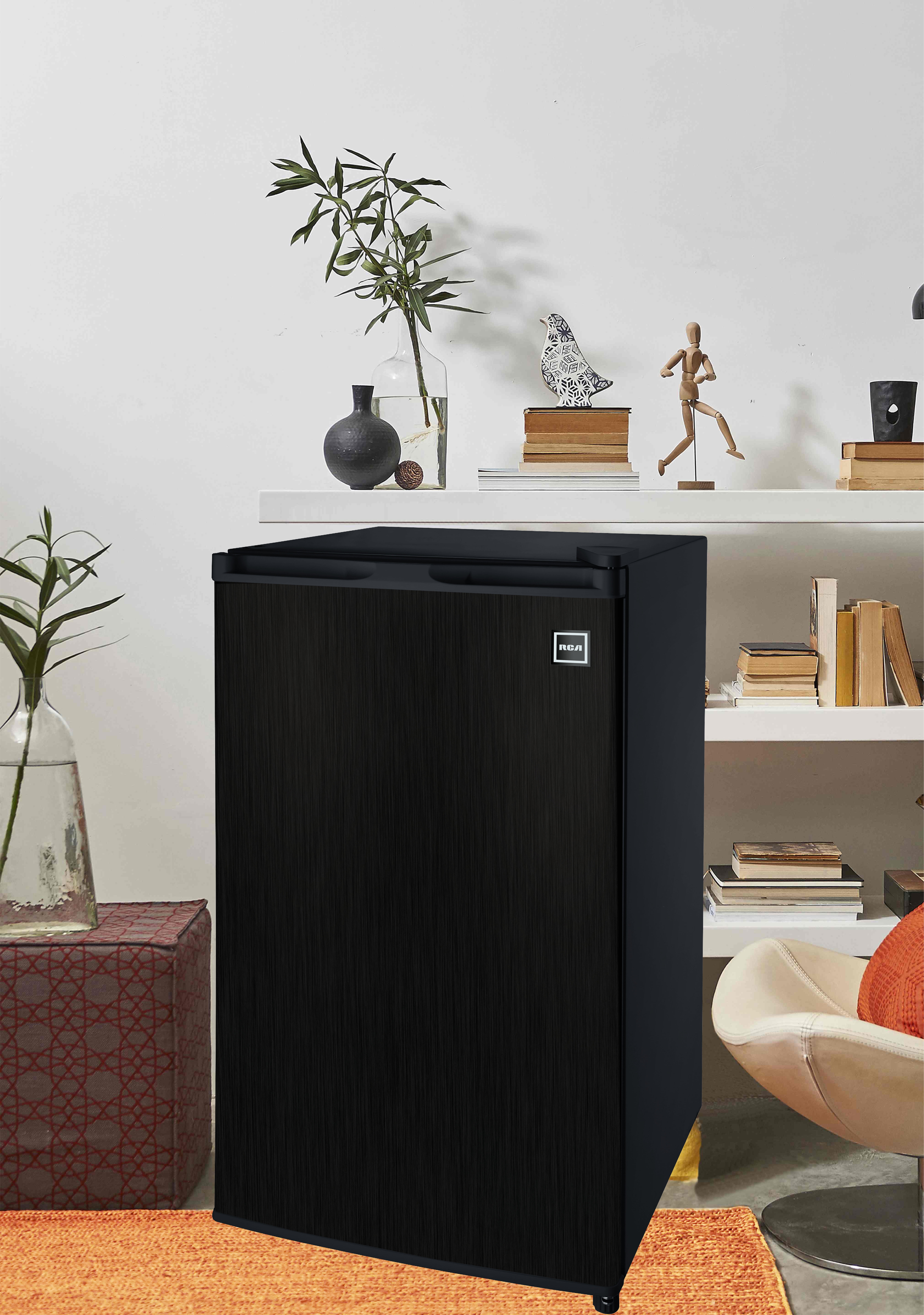 3.2 cu ft Black Stainless Steel Fridge Refrigerator shelves provide for easy organization and cleaning The freezer compartment allows for freezing your smaller convenience frozen food items Can dispenser in door lets you grab your cans with ease Door shelves help you keep frequently used items up front for easy access Flush back for easy placement A reversible door allows you to place according to your space requirement