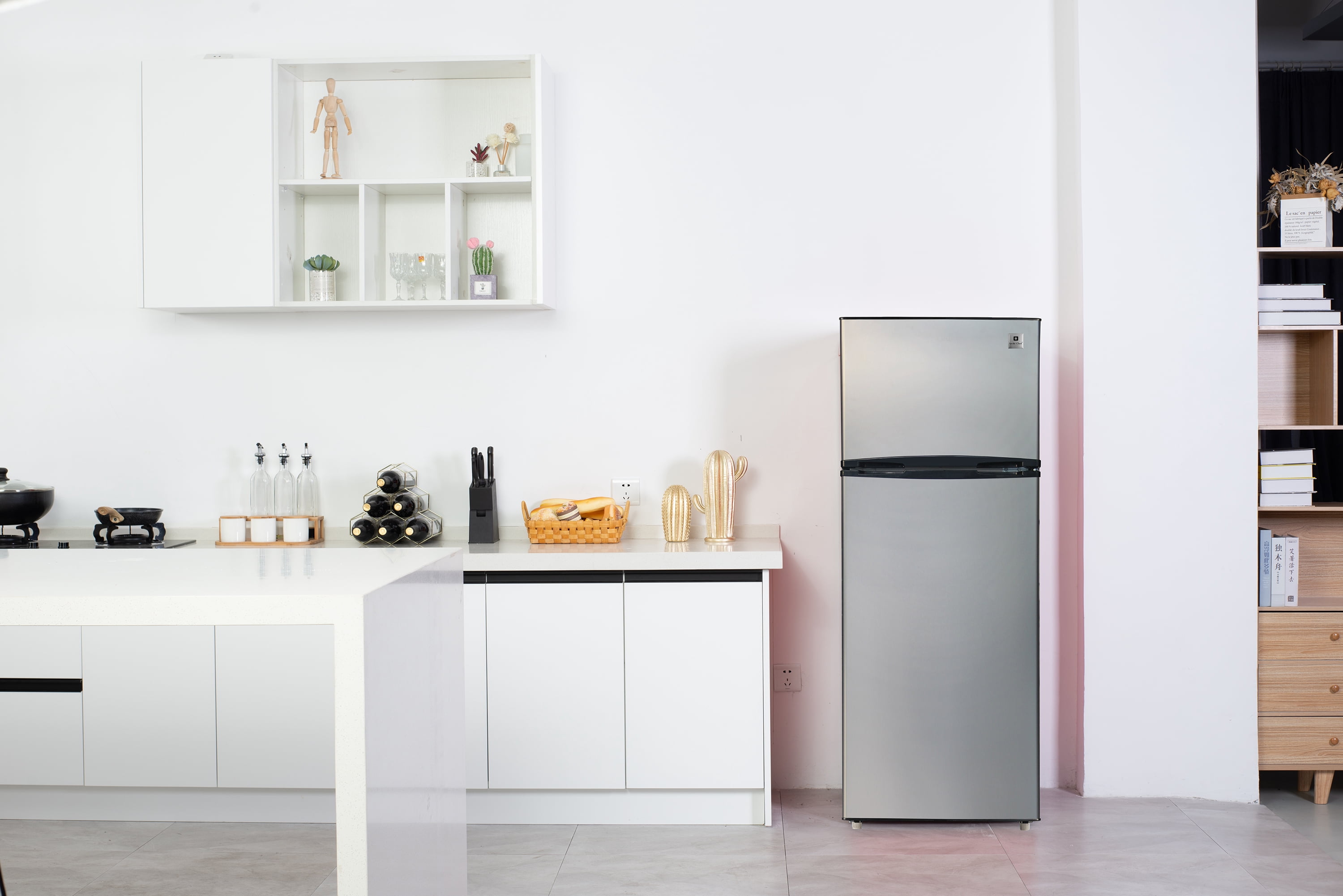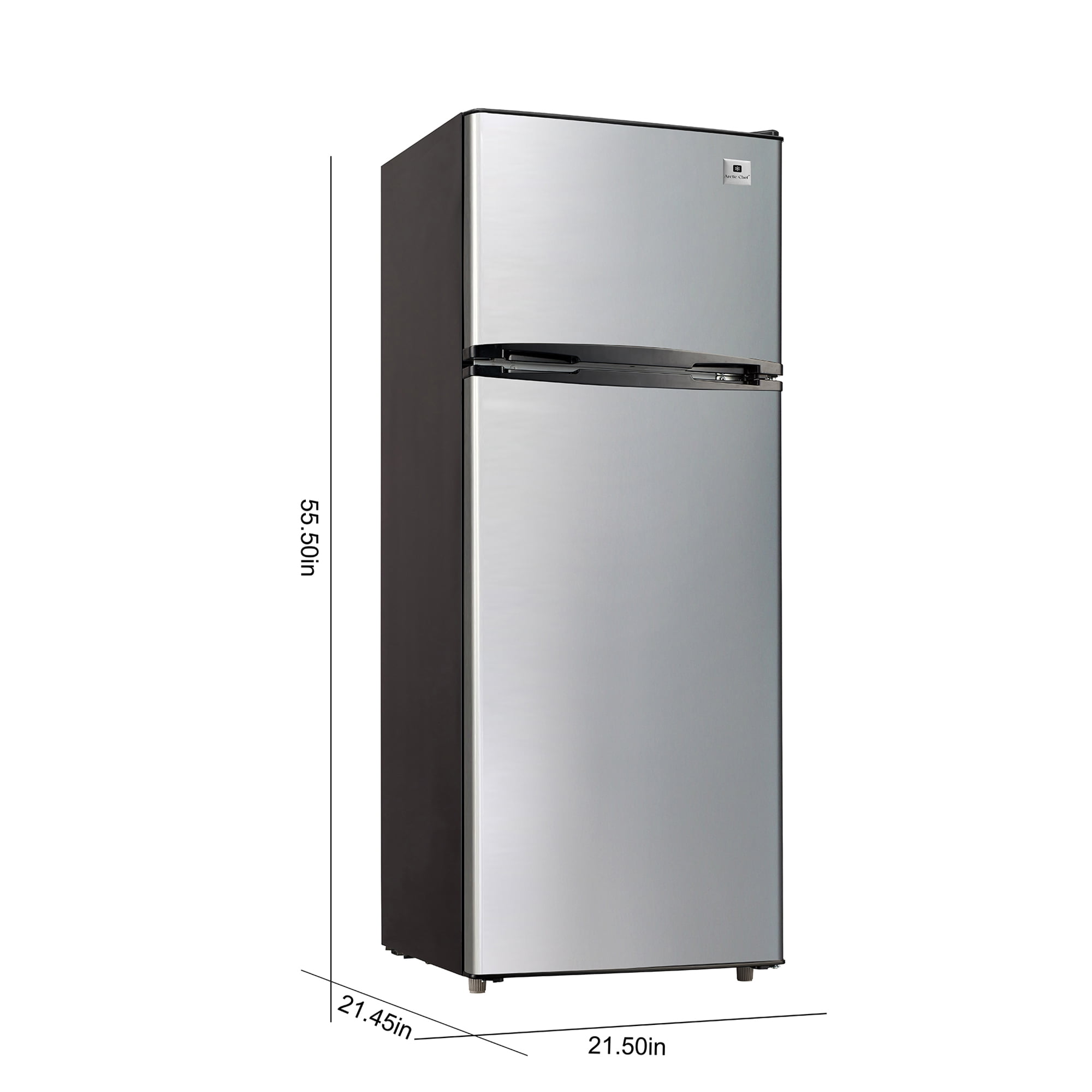 ARCTIC CHEF 7.2 Cu Ft Refrigerator, Platinum Easily accessible temperature controls make temperature management easy Spill-proof glass shelves contain spills and simplify cleanup, preventing liquids from leaking onto shelves below Storage bins in the door help to keep smaller items handy and organized Vegetable and fruit crisper bin helps preserve the freshness of fruits and vegetables 7.2 cu. ft. of storage capacity lets you stock up on all of your favorite foods Full-width, fixed wire freezer shelf and door bin provide organized storage for frozen foods Reversible door allows for convenient and attractive placement anywhere in your home or garage Recessed door handles and hinge covers present a sophisticated and refined look 2-door refrigerator freezer has 1 fresh food door and one top mount freezer door Adjustable legs ensure your refrigerator is always level even when your floor is not Bright incandescent lighting illuminates your food and freezer compartments so you can see and easily find just the right food item for that midnight craving