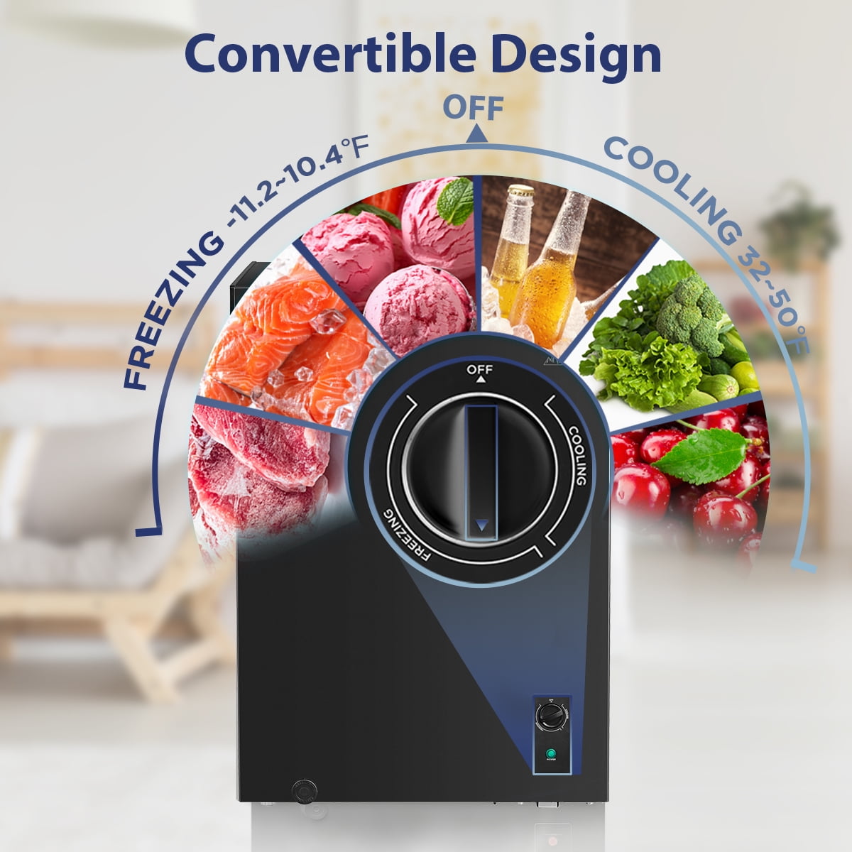 Easily converts from refrigerator to freezer at your wish Dimensions: 23.4″ x 21.9″ x 33.5″ Easy to clean PCM white interior Recessed handle: Makes it easy to open while looking modern. Removable plastic basket: A removable storage basket offers flexibility to organize and store your favorite foods quickly and with ease. 2 Adjustable legs: Allows for leveling the freezer in any spot in your room. Garage ready: Maintains consistent/stable temperatures in extreme conditions (-17 °C to 43 °C)”under freezer mode
