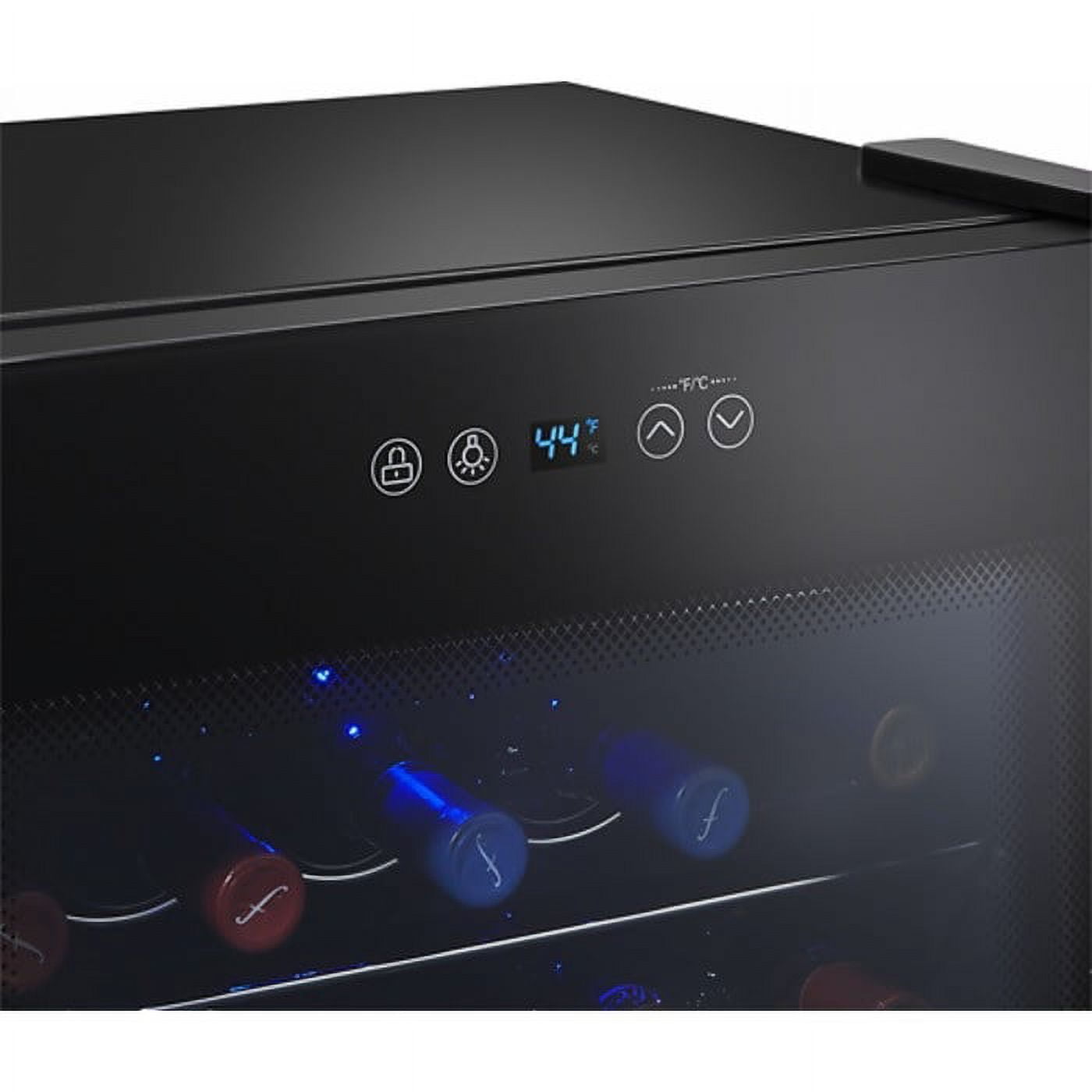 With a capacity to hold up to 34 wine bottles, this wine cooler offers ample space for both storing and displaying your favorite wines. Measuring at 17.3″ by 18.9″ by 33.1″, this premium wine cooler’s compact size allows it to fit seamlessly into various spaces, making it suitable for kitchens, dining rooms, or even cozy wine cellars. The wine cooler’s sleek and modern design adds an elegant touch to any space, complementing any decor and enhancing the overall aesthetics. The cooler features standard adjustable temperature control, allowing you to set the perfect storage conditions for red, white, or sparkling wines, ensuring they are stored at their optimal temperature. The interior LED lighting softly illuminates your wine collection, creating a beautiful showcase. The glass door with stainless steel trim not only adds a contemporary look but also allows you to easily view your wines without having to open the cooler, preserving the wine’s quality and minimizing temperature fluctuations.