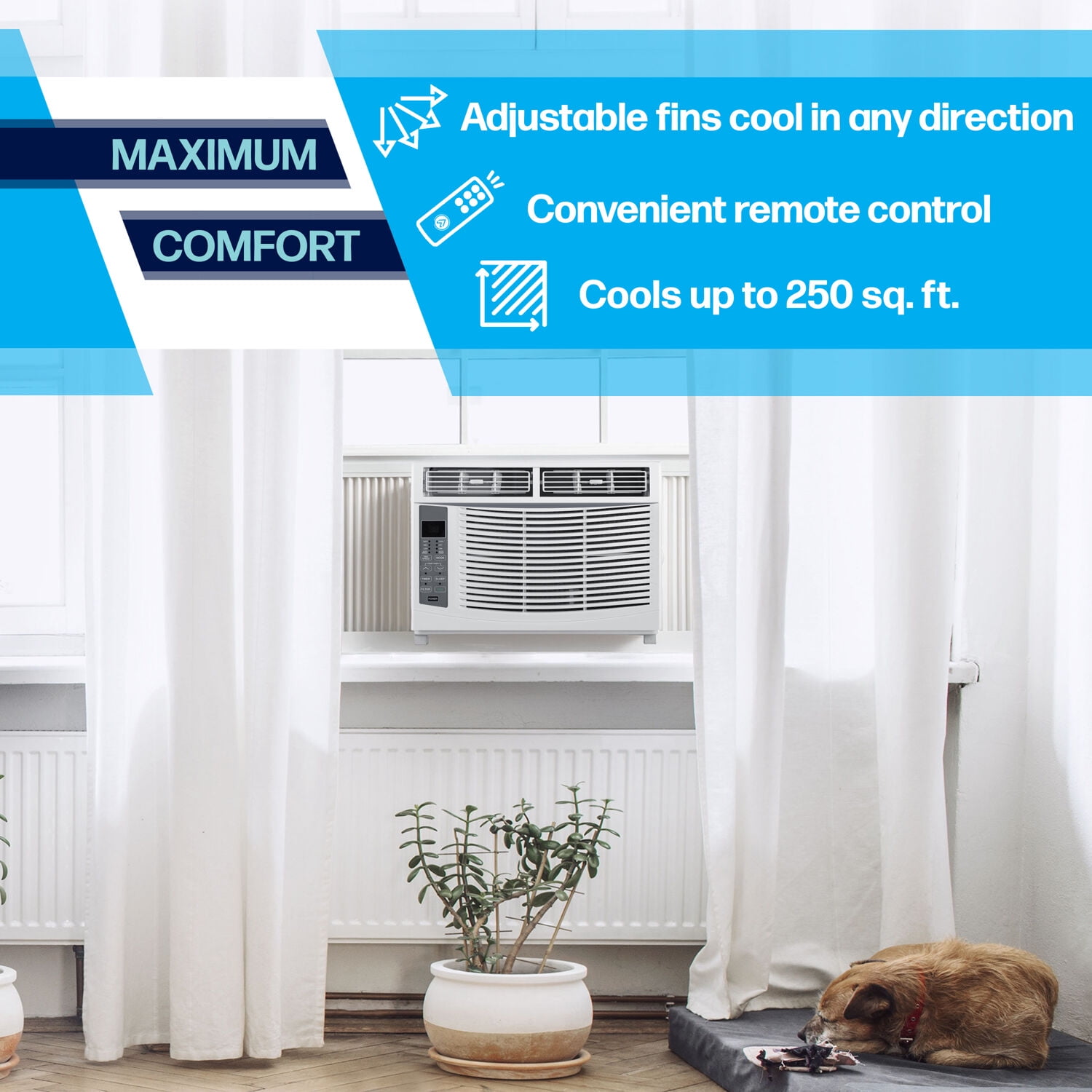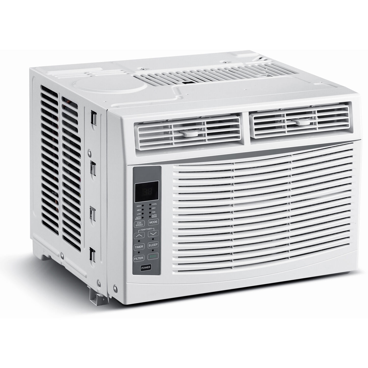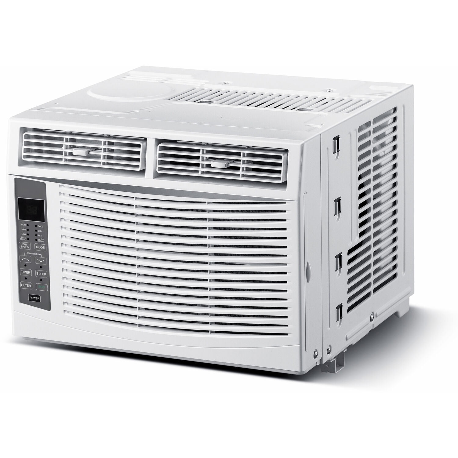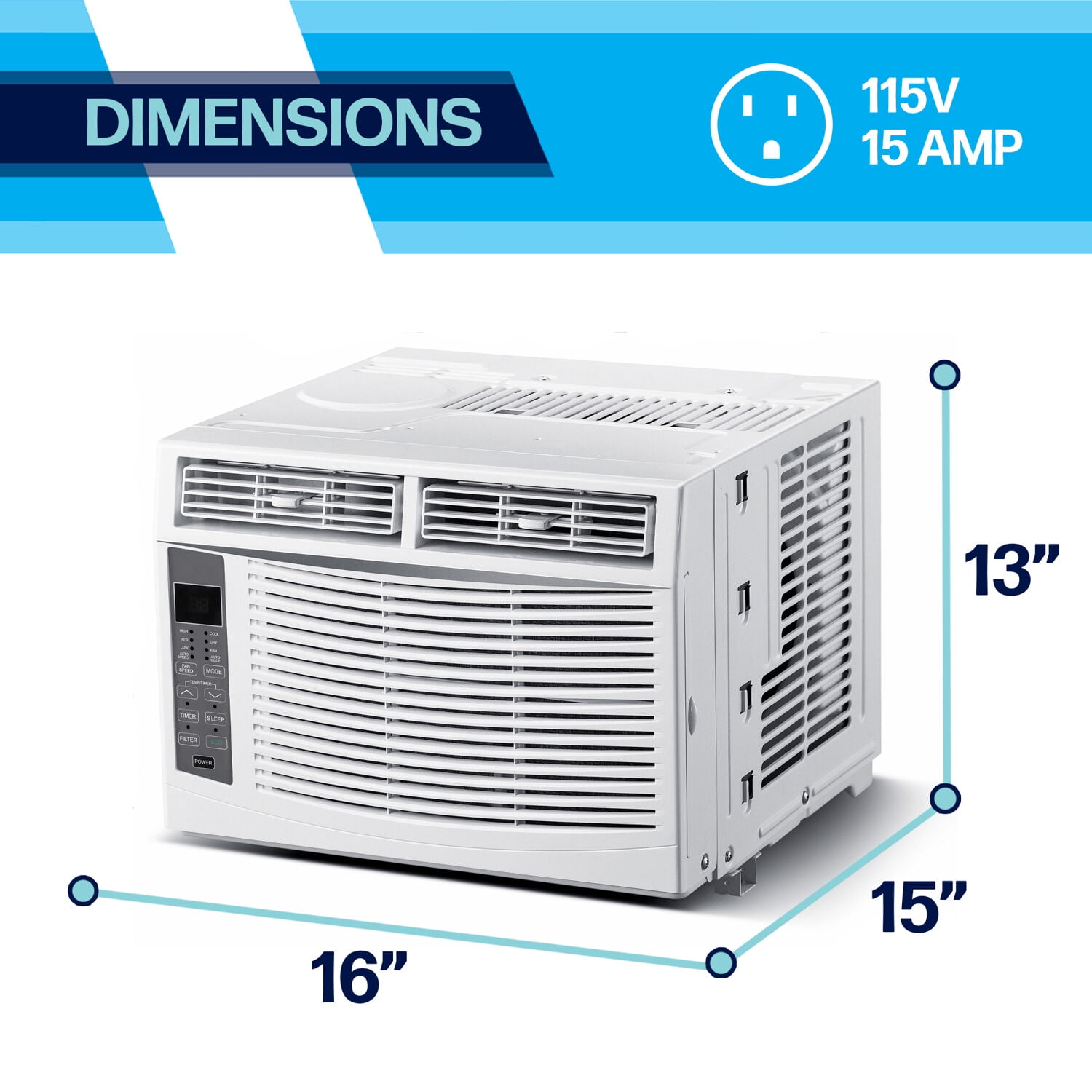 6,000 BTU air conditioner for window-mounted installation cools a room up to 250 sq. ft. 7.5-ft. cord length with LCDI-A (3-prong) plug uses standard 115-volt electrical outlet Digital control panel with LED display, 3 modes (cool, dry and fan), and 3 fan speeds (low, medium, and high) Adjustable temperature control with 24-hour timer and energy saver function Auto-restart saves your settings during a power outage Adjustable air fins direct the air where you need it most Easy-clean washable mesh air filter with Clean Filter indicator light Includes full function remote control and window mounting kit Minimum window height: 14.5″ Window width dimensions: 23″ minimum / 36″ maximum Electrical: 115V~60Hz / 490 Watts / 5 Amps (UL listed)