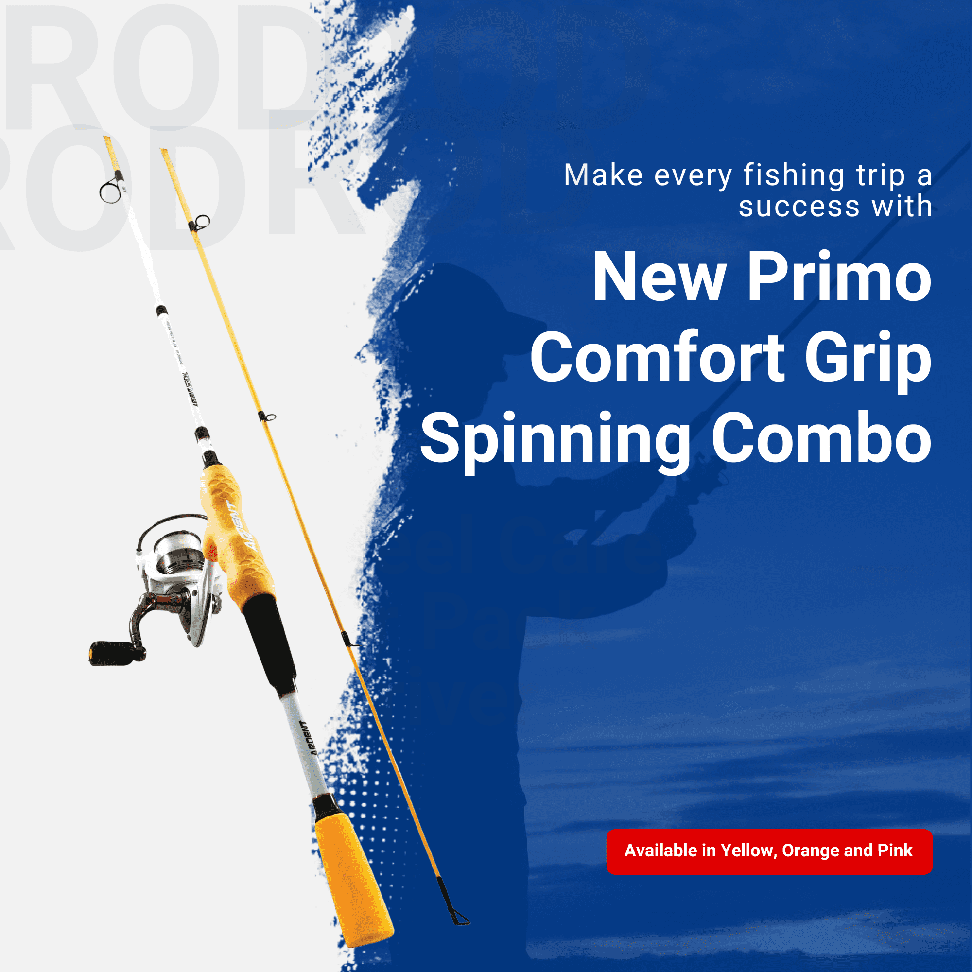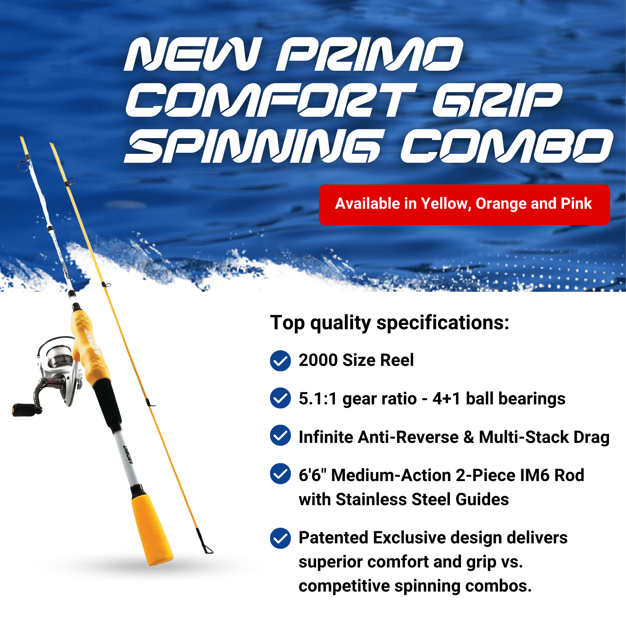 ” Experience next-level comfort and performance with the Primo Comfort Grip Spinning Rod and Reel Combo, designed for smooth casting and all-day fishing use. Available in eye-catching Yellow, Pink, and Orange, this fishing combo not only performs but stands out on the water. The 2000 size spinning reel features a 5.1:1 gear ratio and a 4+1 ball bearing system for dependable, smooth retrieves. With an infinite anti-reverse mechanism and a multi-stack drag system, you can confidently handle everything from bass to trout without worrying about sudden pullbacks or line tension issues. Paired with a 6’6″” medium-action 2-piece IM6 graphite fishing pole, this combo offers the ideal balance of strength, flexibility, and casting precision. Stainless steel guides ensure lasting durability and smooth line flow. What truly sets this combo apart is the patented Comfort Grip handle, engineered to reduce hand fatigue and eliminate finger irritation
