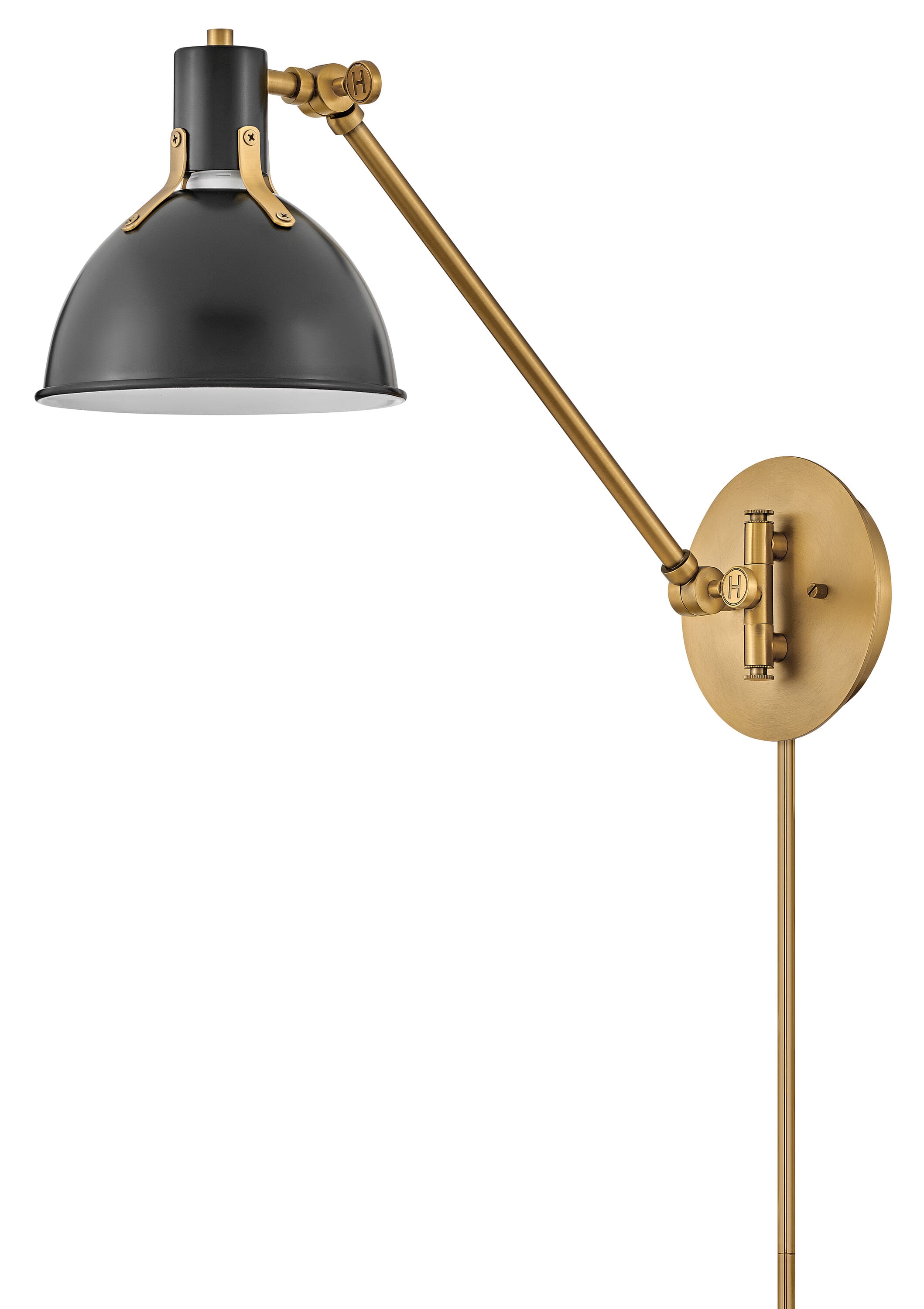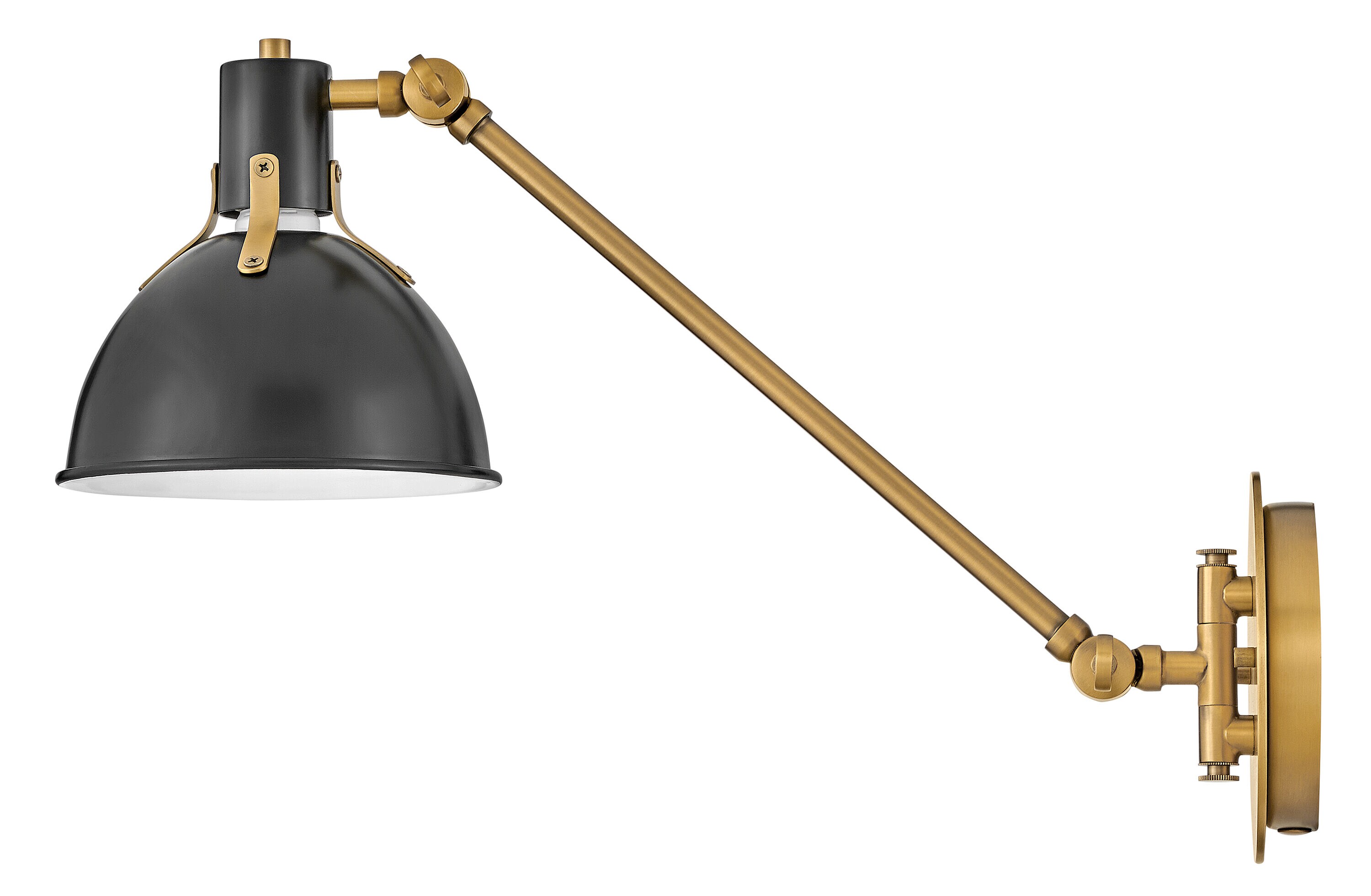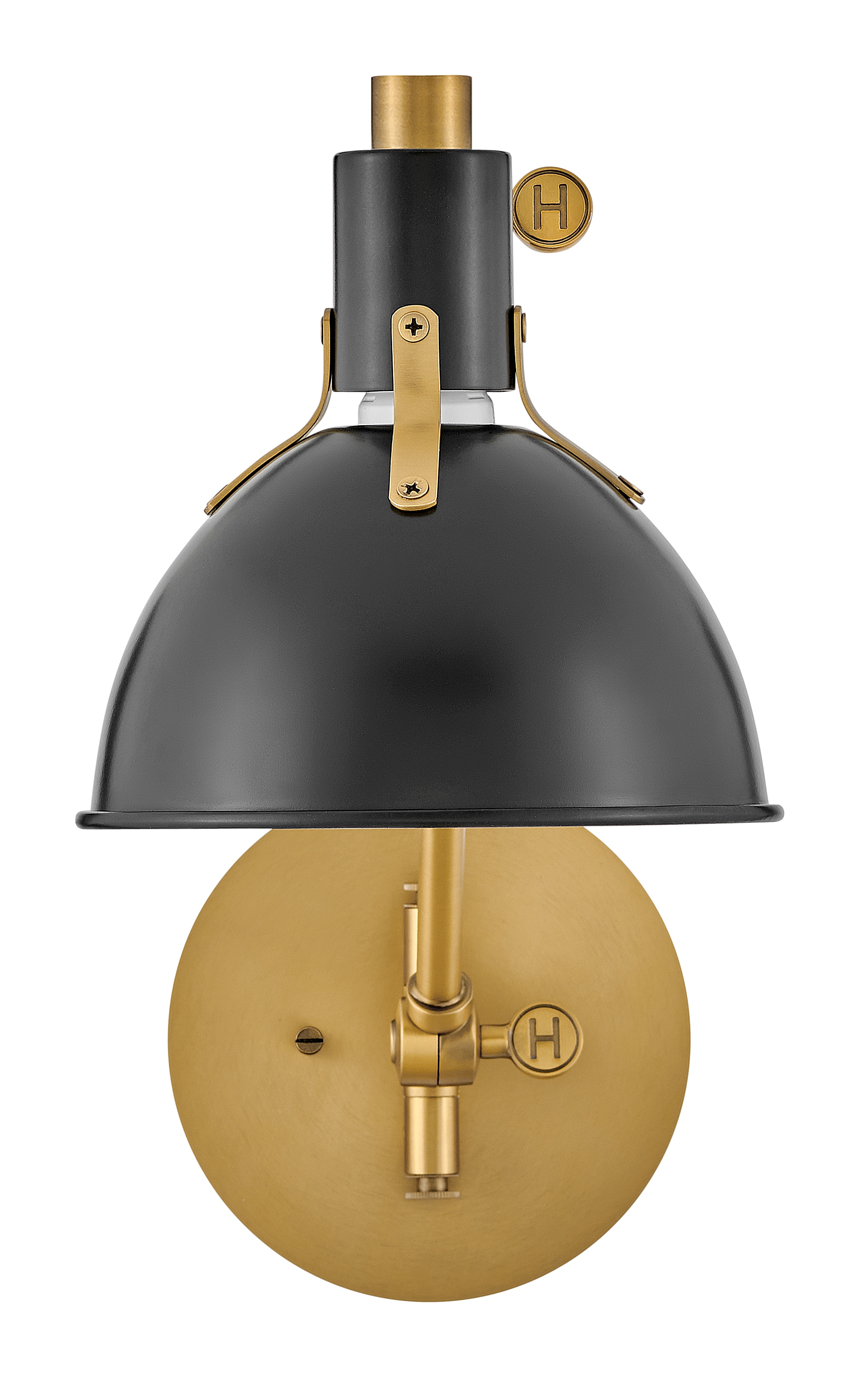 Hinkley’s Argo Small Single Light Wall Sconce’s articulating arm pivots at the base and shade, reaching a full extension of 21.75 inches. Vintage desk lamp style in a Satin Black dome with a silky sheen, it connects to a warm, amber Lacquered Brass socket by a trio of heavy straps. Adjusts left or right, up or down, and it can be hard-wired or mounted to the wall and powered by a 96-in cord. Industrial touches of decorative screws and -“H”-in keys at the pivot points for a stylish profile.