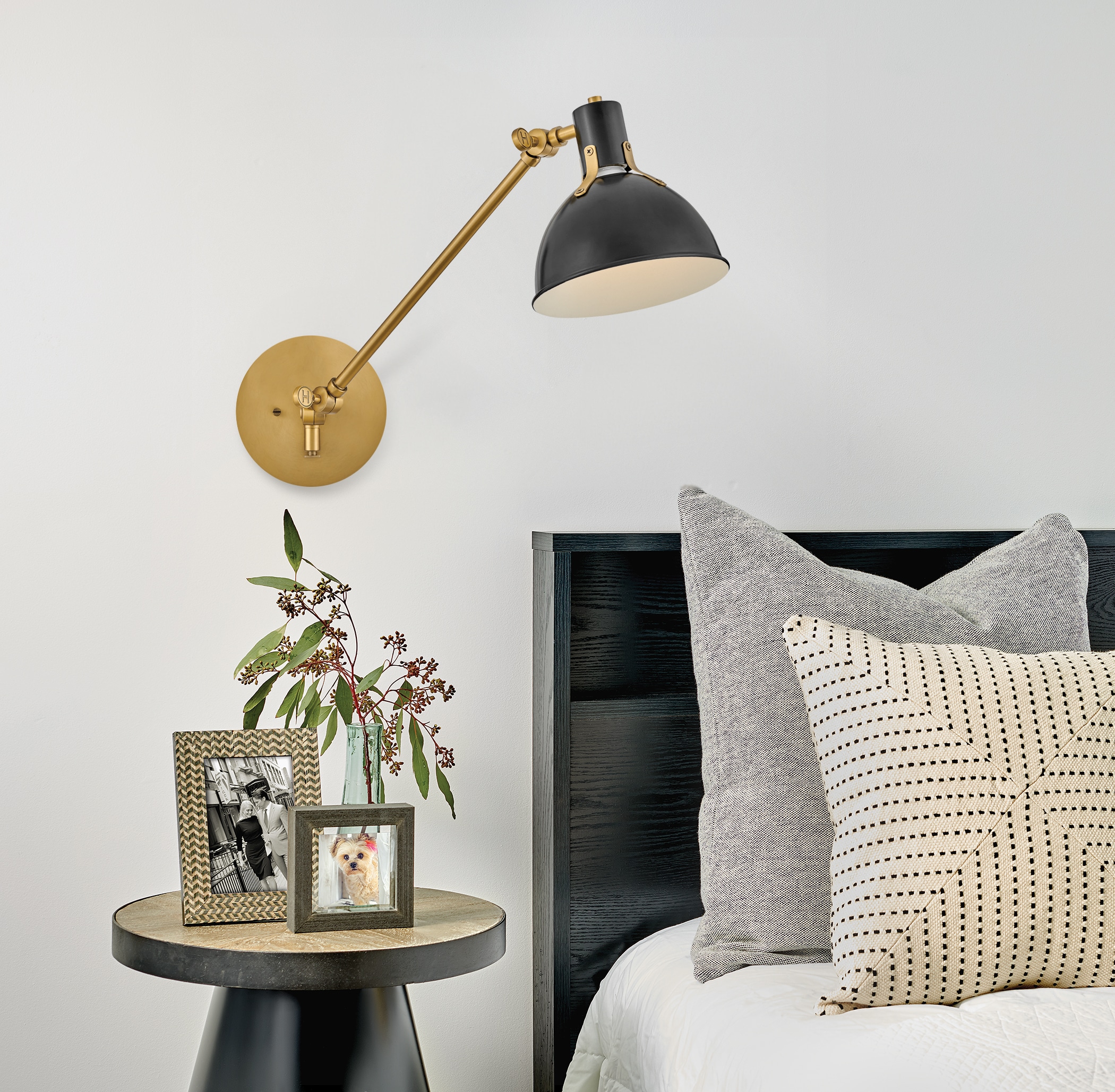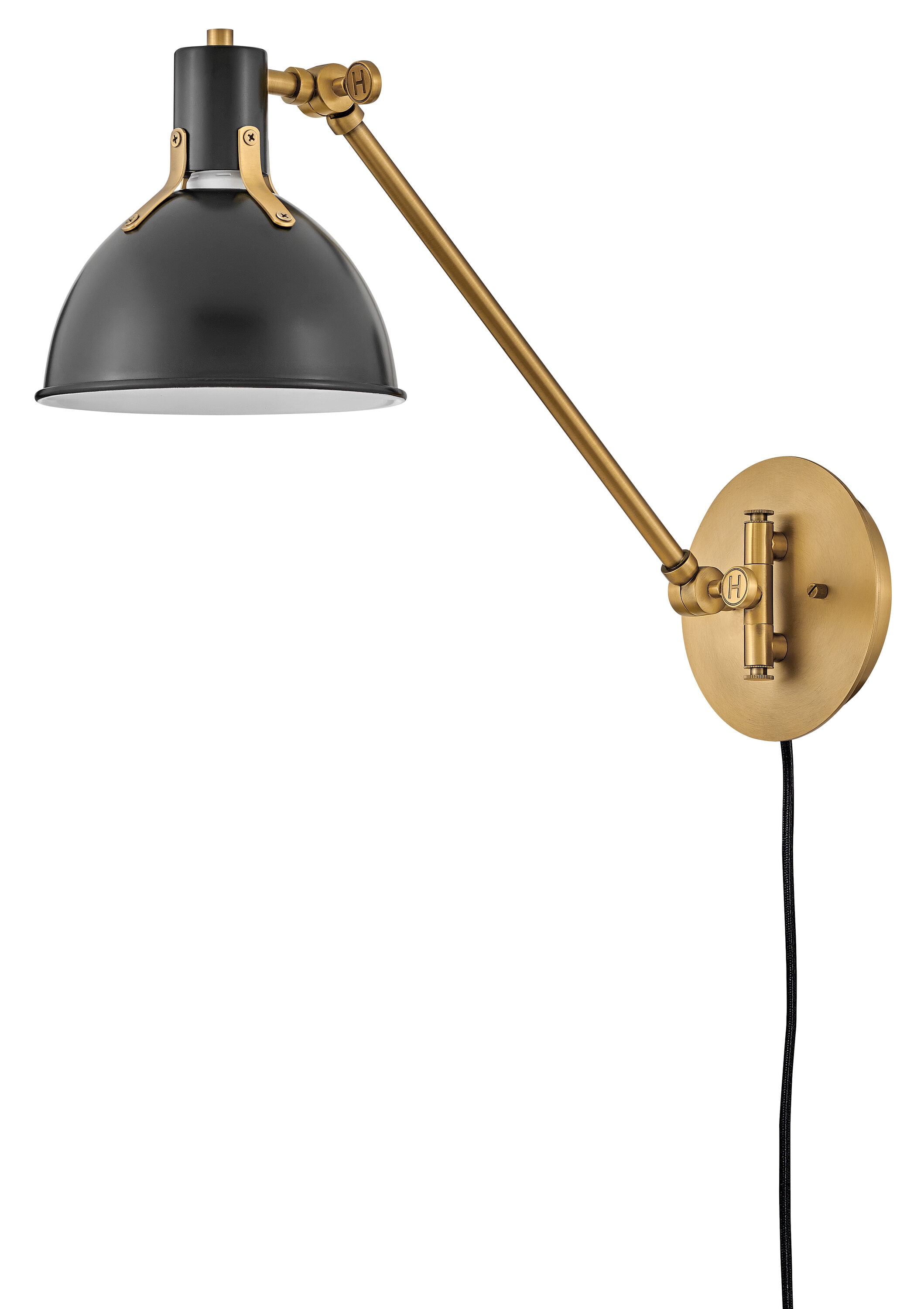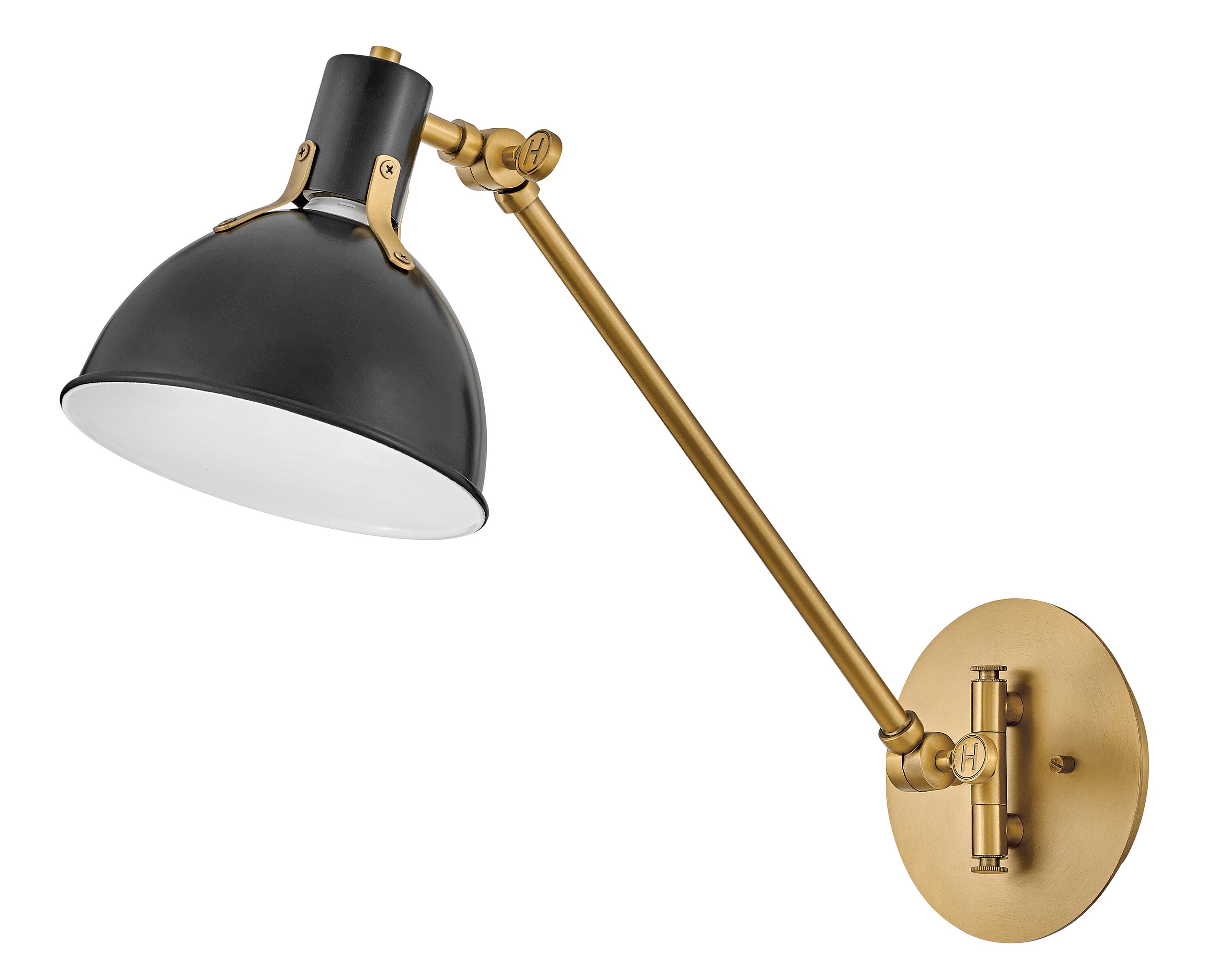 Hinkley’s Argo Small Single Light Wall Sconce’s articulating arm pivots at the base and shade, reaching a full extension of 21.75 inches. Vintage desk lamp style in a Satin Black dome with a silky sheen, it connects to a warm, amber Lacquered Brass socket by a trio of heavy straps. Adjusts left or right, up or down, and it can be hard-wired or mounted to the wall and powered by a 96-in cord. Industrial touches of decorative screws and -“H”-in keys at the pivot points for a stylish profile.