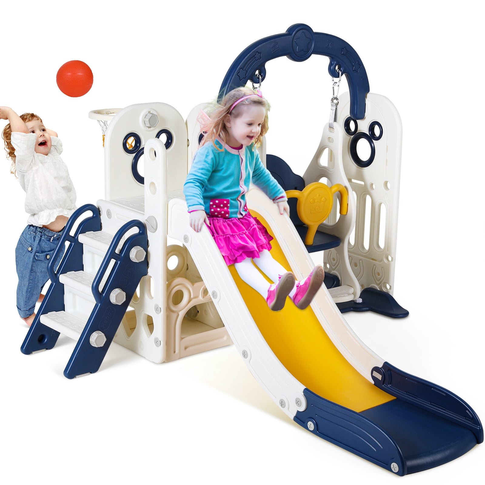 Arlopu Kids Slide & Swing Set, Large Toddler Slide Climber Playset w/ Ball & Basketball Hoop, Storage Space, Anti-Slip Steps, Indoor Outdoor Playground Toy for Boys & Girls 2+ Years