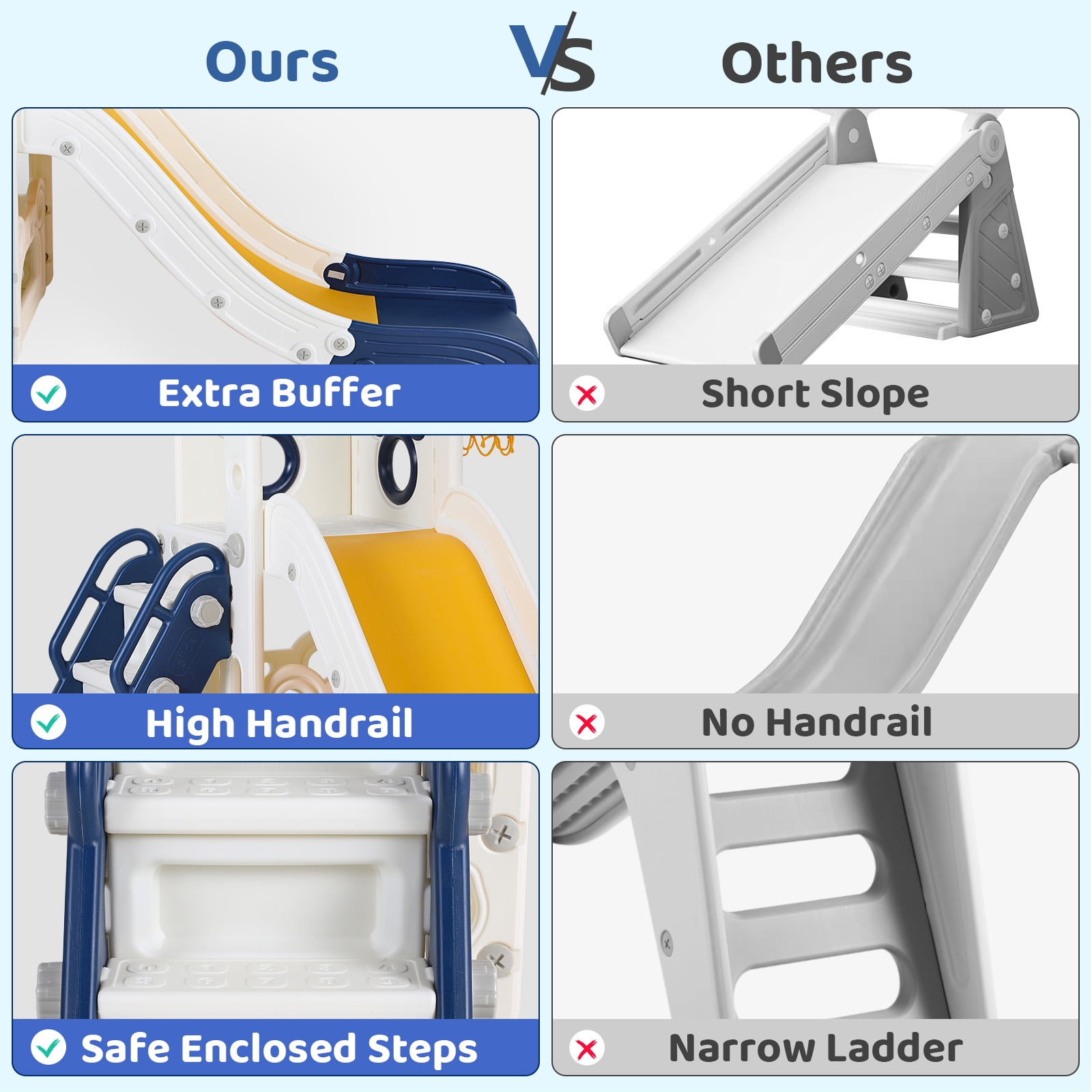 Quality & Safety Build: Arlopu Sturdy Toddler Slide is a 4-in-1 playset made of high-quality, non-toxic, and BPA-free HDPE material. 4-in-1 Fun Design: Features long slide, handrail climber, basketball hoop, and storage. Wide slideway with 3 speed zones for exciting play. Skill Development: Suitable for 2-7-year-olds, it boosts motor skills through climbing, sliding, and shooting. Indoor & Outdoor Use: Versatile playset works in both indoor and outdoor spaces, adapting to different play areas. Easy Setup & Gifting: Simple to assemble, comes with a basketball. Sturdy, eco-friendly design makes it a great toddler gift.