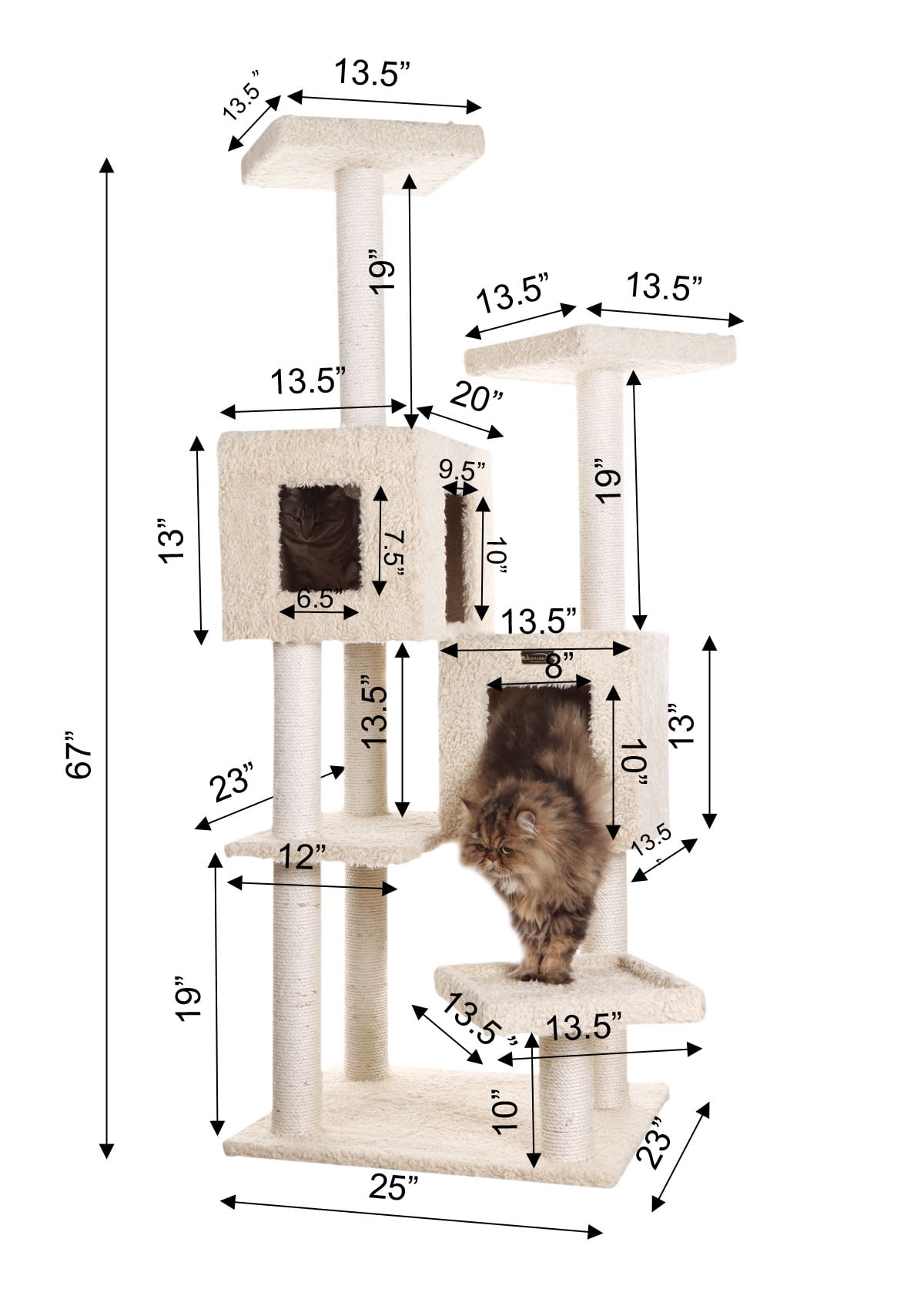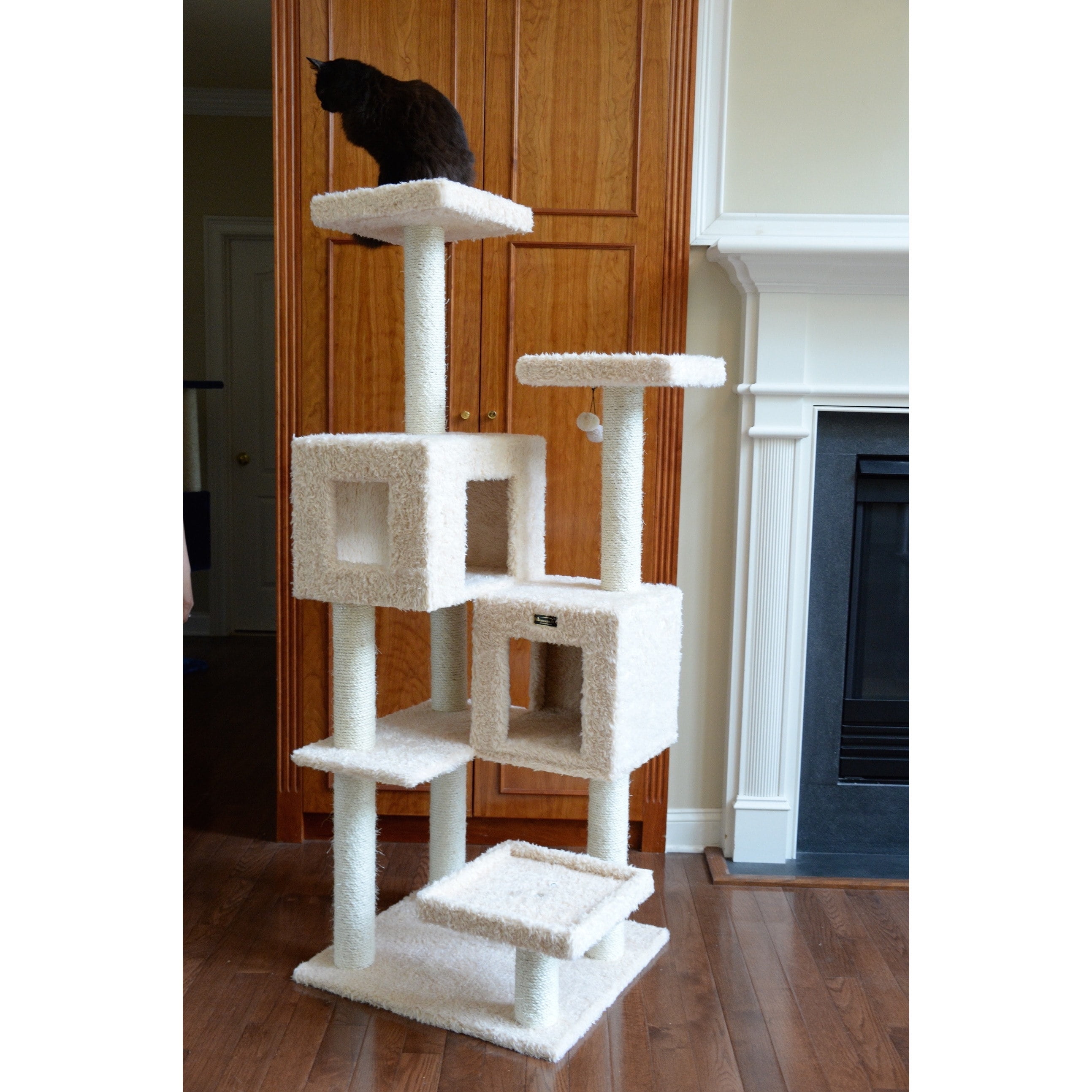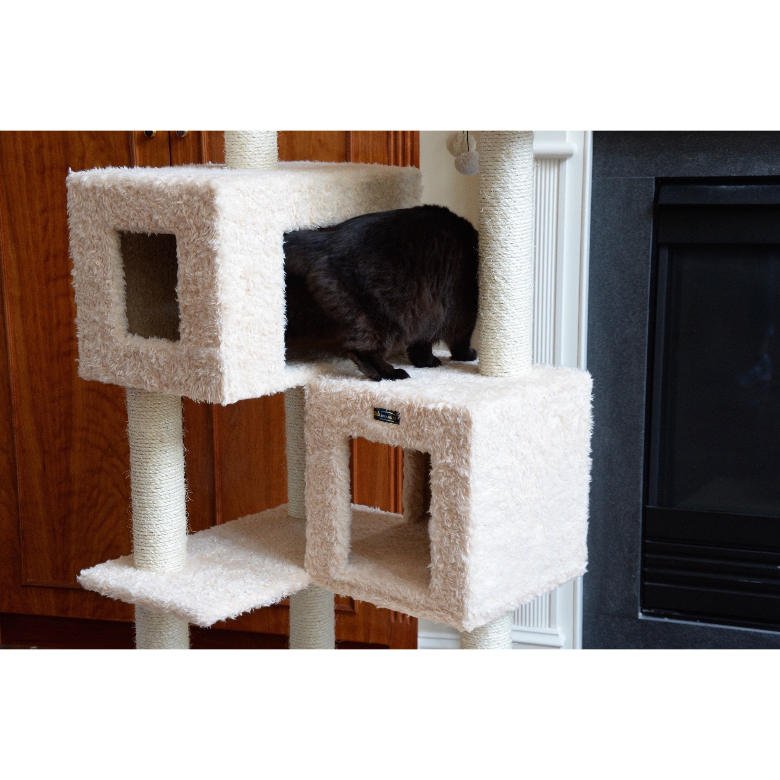 Armarkat model no. A6702 is cat daddy approved by noted cat behaviorist Jackson galaxy and features 2 cat playhouses, perches, sisal 100% cured sisal rope for scratching.a tunnel playhouse, hammock, hanging ball toy and sisal rope toy, and multiple perches for your cats enjoyment. F and B Bullet: Beige with high density and ultra-thick faux fur covering for felines comfort and soft, coverings are permanently adhered to wood structures. Well constructed of 15mm pressed wood material, making it not only thicker but stronger. 100% Natural, seasoned sisal rope wraps all posts securely for years of “scratch.” Dimensions:post diameter: 3.5″; base dimension: 26″ x 24″; playhouse dimension: 14″(L) x 14″(W) x 13″(H); 14″(L) x 20″(W) x 13″(H); perch Dimensions:14″ x 14″ Max holding weight: 60 lbs. Six-months warranty included. Replacement parts available from manufacturer.