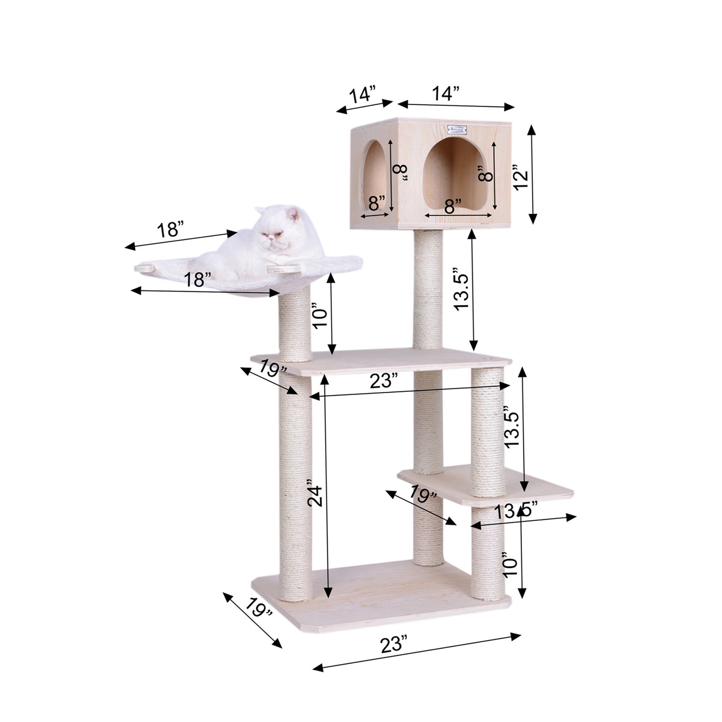 The tree has a polished surface, plywood veneers, and original wood grain. Cat lovers can easily assemble Model S5103 with tools and step-by-step instructions. It features a lounge playhouse, plush hammock and sisal scratching posts for maximum “scratchability.” Double-layered base platforms for extra strength and superior balance, each with a comfortable place for your cat to rest and relax. Easy to assemble with step by step instruction and tools, Suitable for medium and large cats, hold up to 60 lbs Six months manufacturer’s warranty against defects. Replacement parts available from manufacturer.