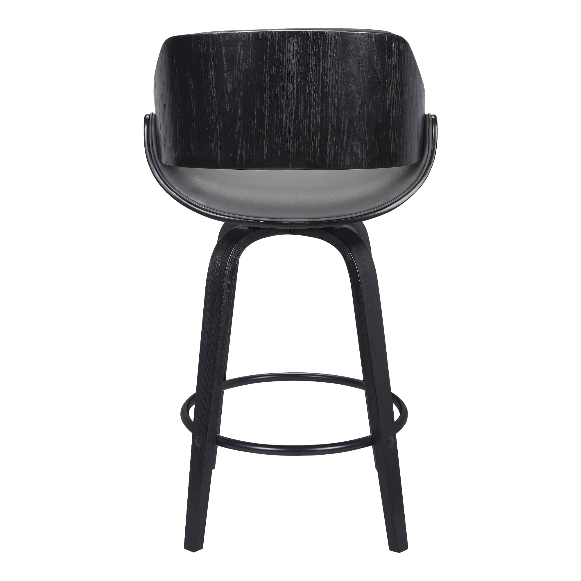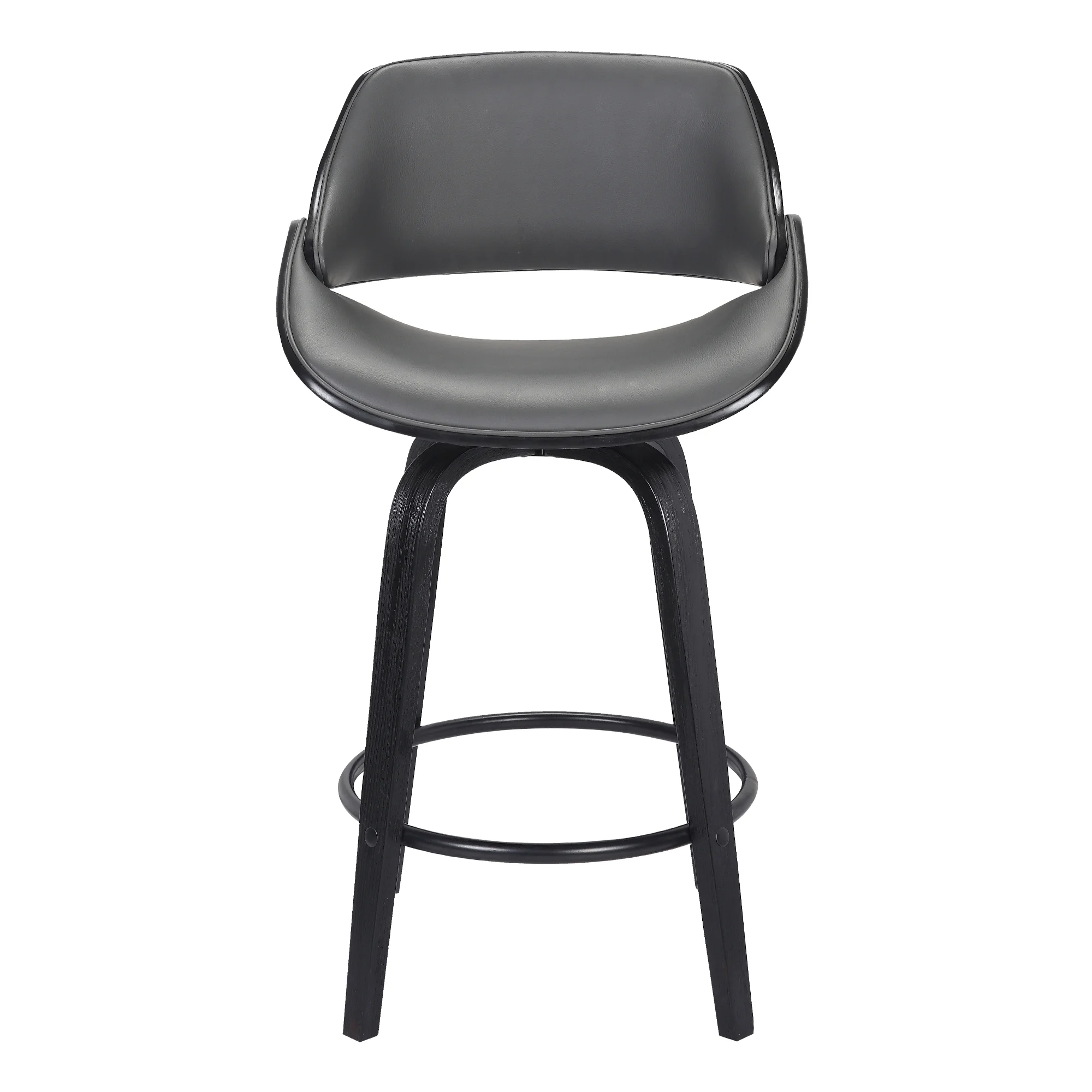 The Mona 26″ Counter Height Swivel Gray Faux Leather and Black Wood Bar Stool from Armen Living is the ideal addition to any home or apartment. The retro silhouette exudes timeless appeal that would easily fit into any home regardless of the existing design theme. The Mona kitchen stool features a beautiful wood frame and seat back that wrap around a luxurious high-density foam cushioned back and seat that is further complimented by the inclusion of a convenient metal ring footrest. Upholstered in soft faux leather upholstery, the Mona provides a full mobility with a 360-degree swivel function that enables you to engage with your guests regardless of their place in the room! Available in a 26” or 30” seat height, the Mona Bar or Counter Stool can easily incorporate into your kitchen or home bar area. The Mona bar or counter stool is available in your choice of a walnut wood or black finish with gray faux leather upholstery.