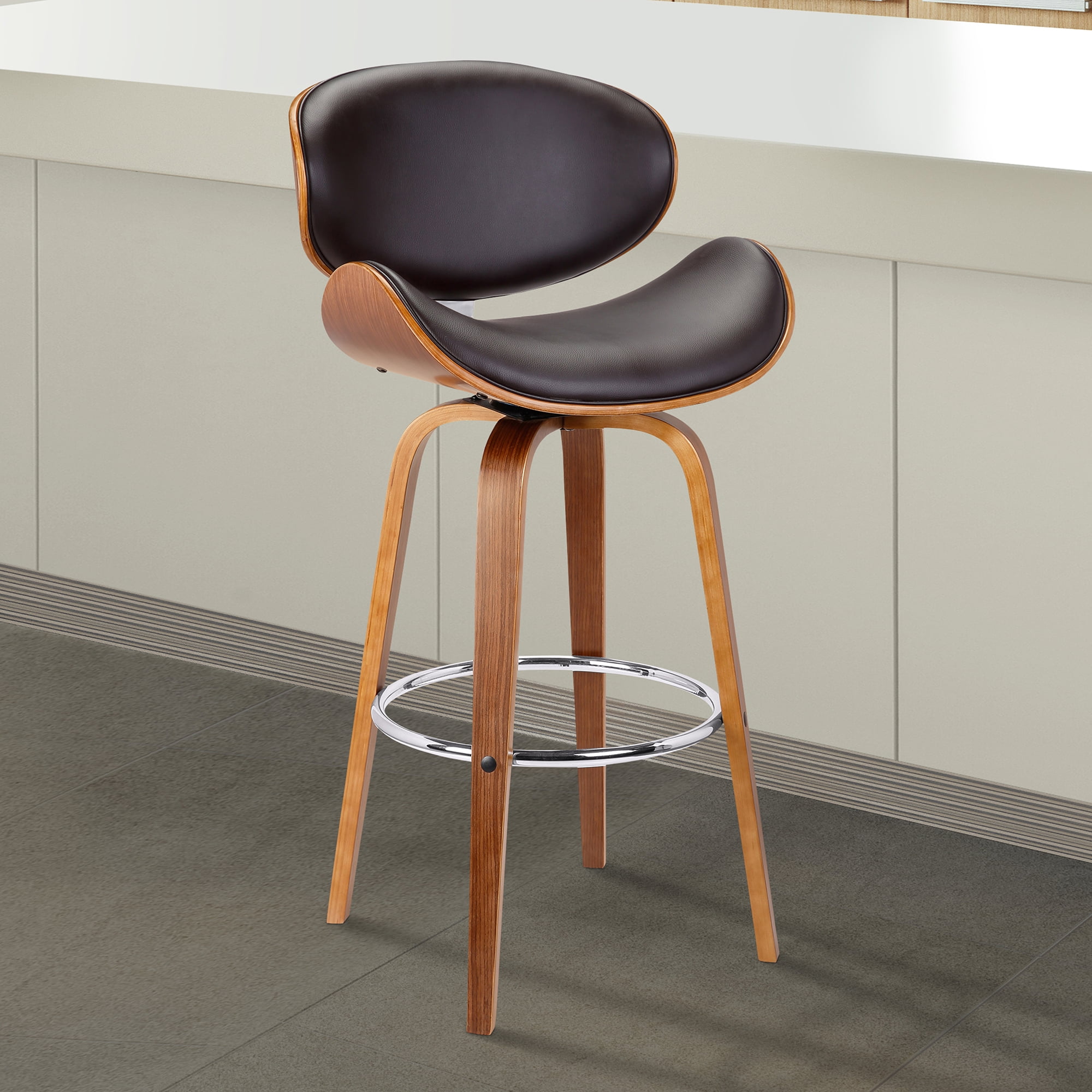 Add mid-century modern magic to your home with the Solvang 26″ Counter Height Swivel Brown Faux Leather and Walnut Wood Bar Stool from Armen Living. The Solvang’s style and versatility allow it to function in your kitchen, office, home bar, or den. It takes a brilliant design to support such an elegant stool, which entails a perfect sense of balance and functionality. The 360-degree swivel function provides mobility and helps keep friends and family engaged regardless of their place in the room at parties or gatherings. The armless design is helpful when you need to pull the stool as close as possible to a working surface without compromising comfort. Soft faux leather upholstery wraps around high-foam density cushions, and the 4-leg base features a ring footrest, further accentuating its comfort and convenience. The Solvang is available to you in a 26” or 30” seat height and features brown faux leather upholstery and a walnut wood finish.