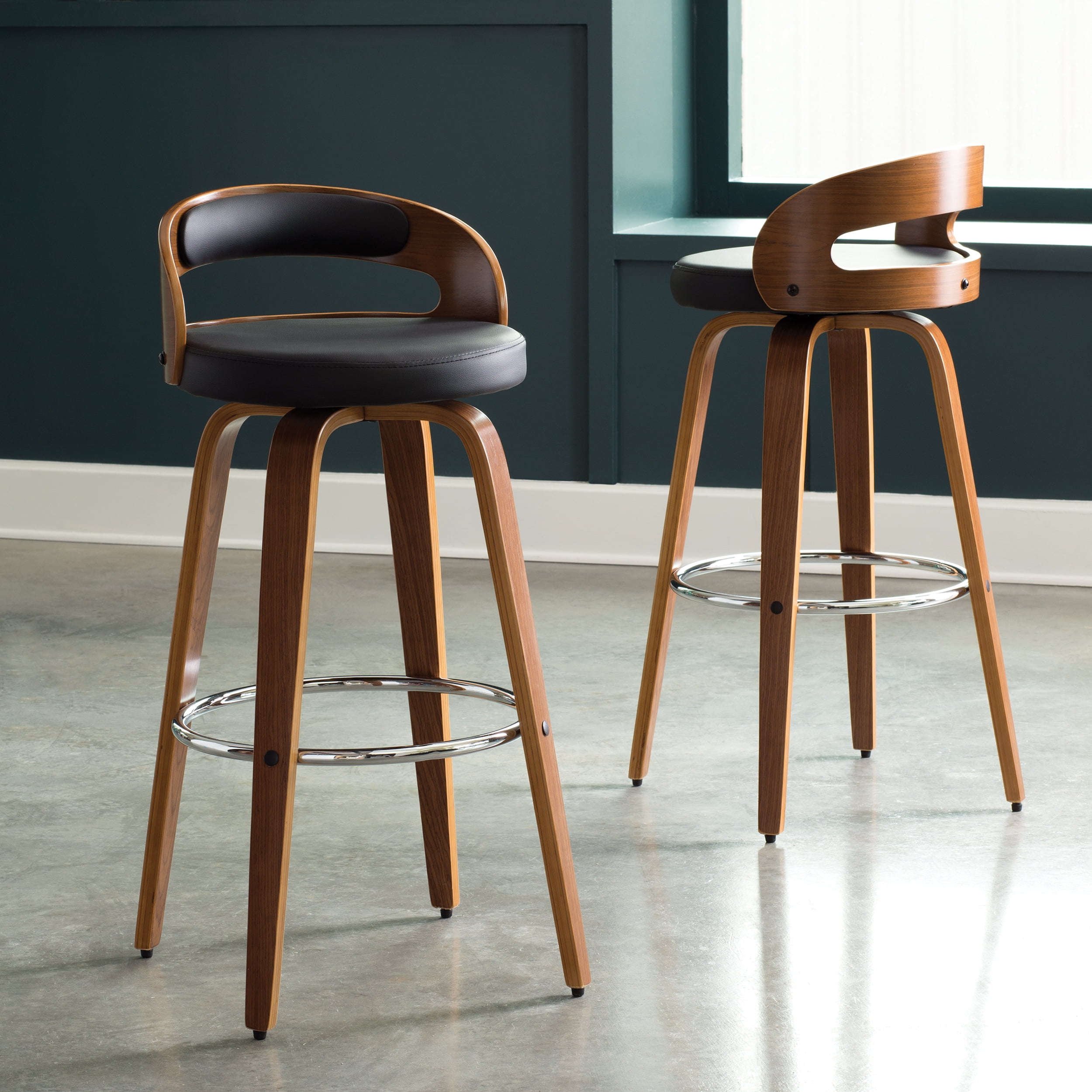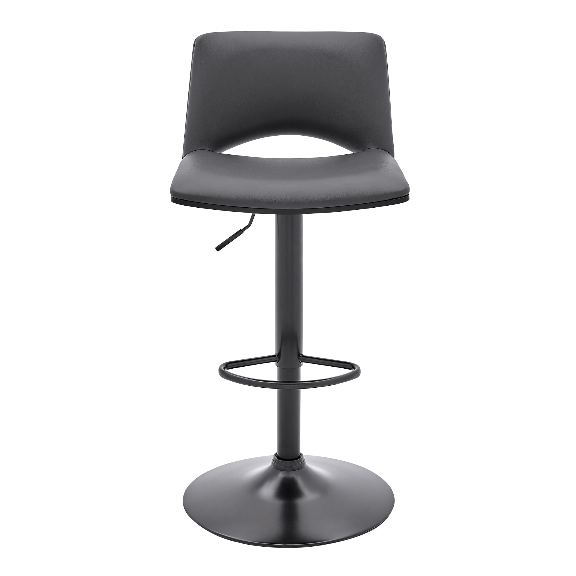 Materials: Faux leather, metal, wood Finish: Gray, black The wonderful full 360-degree swivel function allows for maximum mobility. The smooth glide swivel function allows you to change directions with ease, making this your new favorite stool in your home! Move the gas lever right underneath the seat to adjust to your preferred height with ease! The lifting mechanism is seamless and works perfectly This bar stool provides more stability with a large base that prevents any rocking or movement potentially caused by using the swivel or height adjustment features The soft foam-padded cushions offer extreme comfort, which helps to support and relax your back and body. Armen Living offers a unique variety of color and finish options that are sure to fit into any existing design theme. COMFORTABLE DESIGN – This stool was designed with ergonomic principles; shaping around your back with a wide seat for extra room. The soft foam-padded cushions offer extreme comfort, which helps to support and relax your back and body.