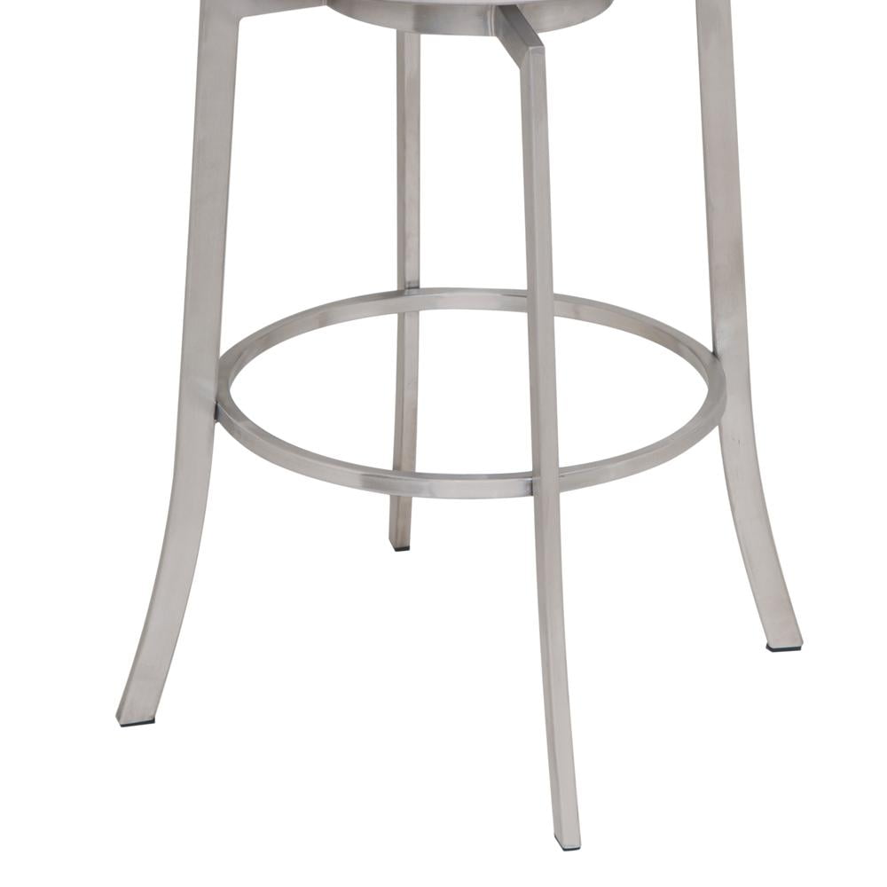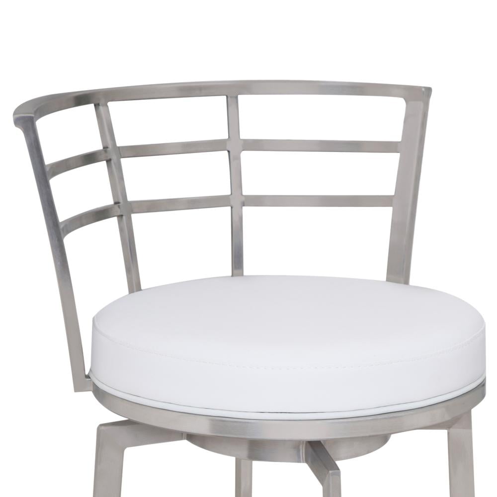 Material: Faux leather, metal Finish: White, brushed stainless steel Perfect for a stunningly contemporary home Full-Bearing 360° swivel Polyurethane upholstery Brushed stainless steel construction Sturdy construction for years of enjoyment