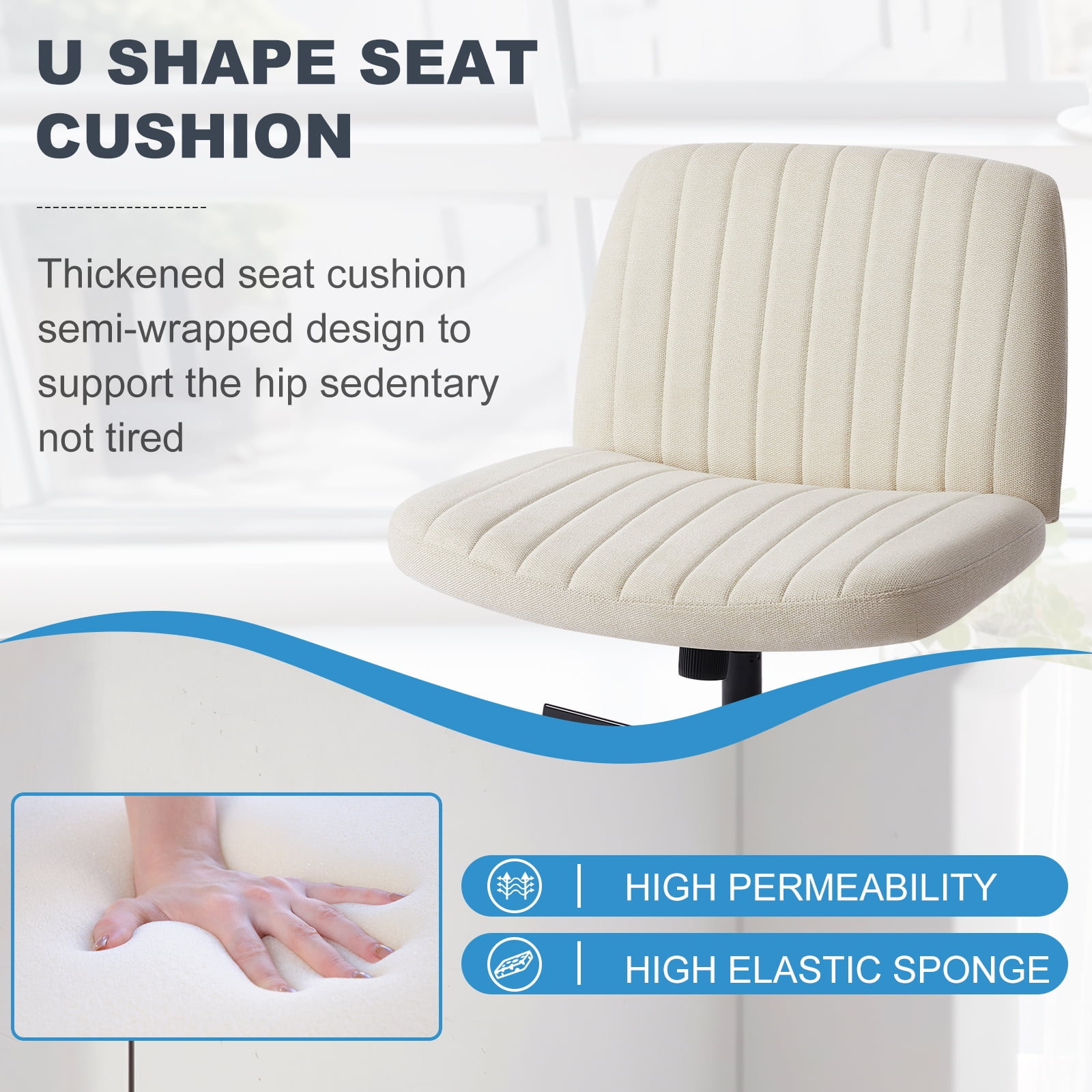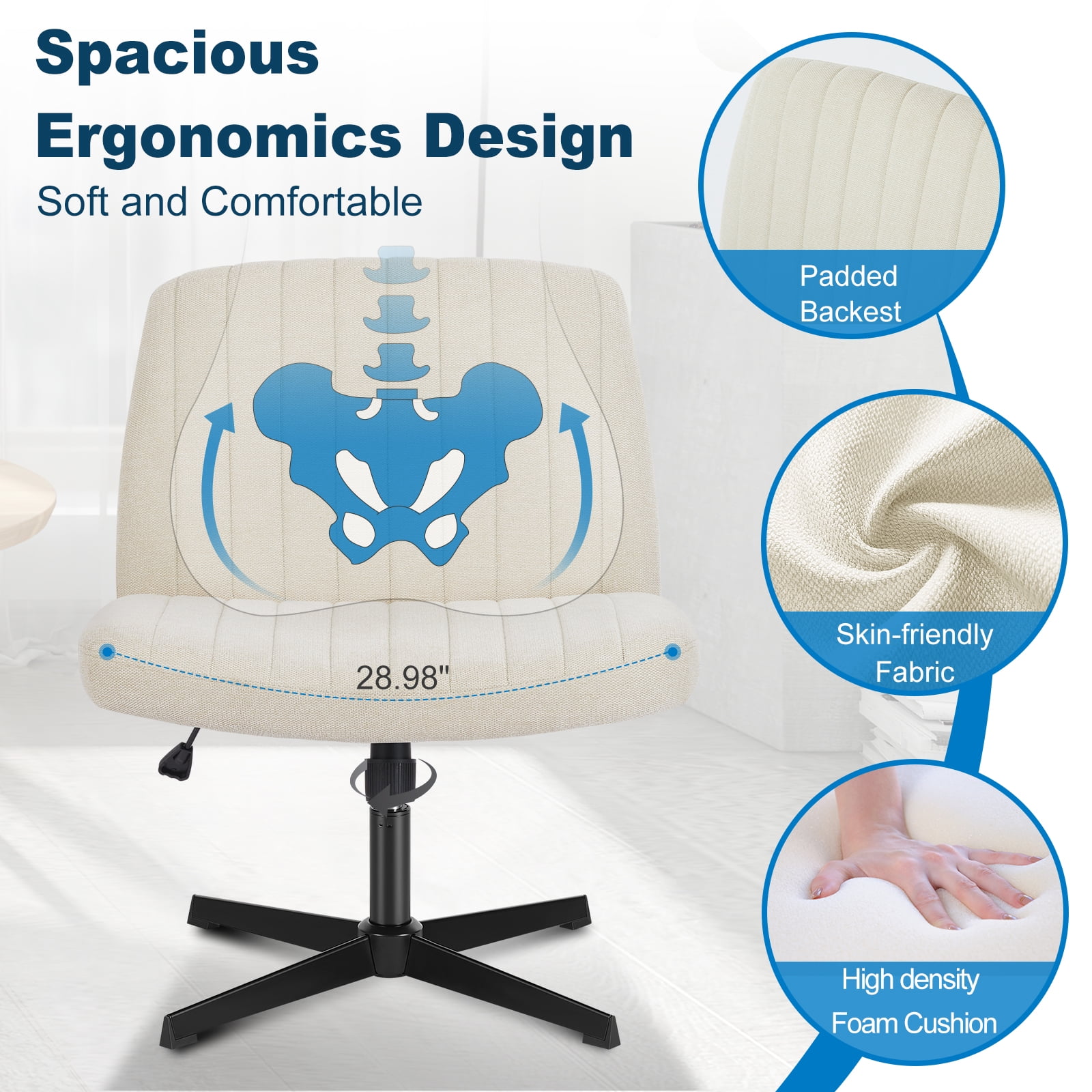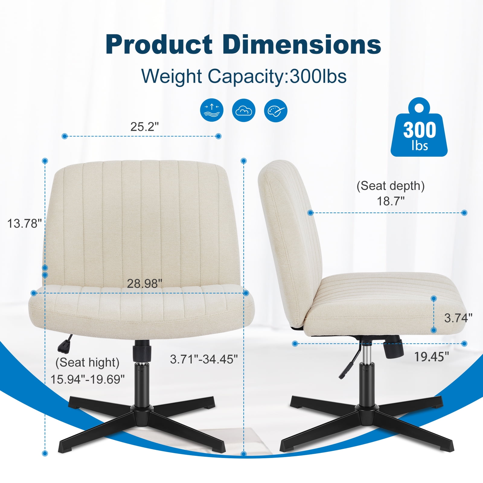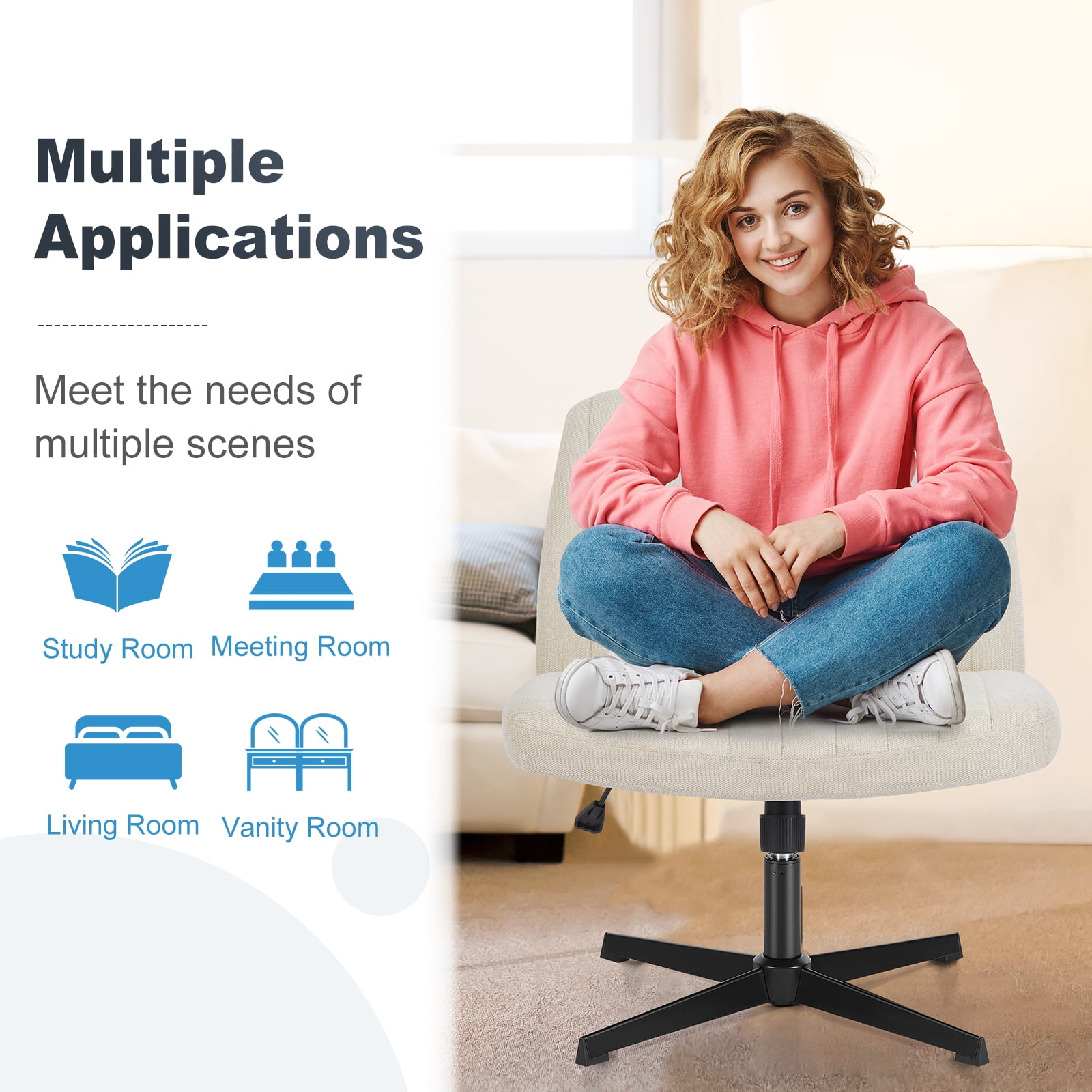 [Comfortable Sitting] – The seat cushion and backrest packed with high-density sponge, along with ergonomic construction, provide a more pleasant sitting experience and are less likely to distort, making them ideal for persons who must sit for extended periods of time. The 26″ seat width and 18.7″ seat depth will provide you additional space and relaxation. [Height Adjustable] – This office chair has an adjustable height (15.94″ to 19.69″) to fit most desks, making it perfect for teens, adults, and seniors. Enjoy comfort and flexibility with just a simple adjustment. [Sturdy & Stylish] – Built with an SGS-certified gas spring and a durable metal cross base, this chair supports up to 300 lbs. Its non-slip, scratch-resistant rubber feet provide stability and protect your floors. Unlike traditional office chairs, this modern cross-legged design and soft, skin-friendly fabric add a dynamic touch to any room. Perfect for your home office, living room, bedroom, study, or powder room. [Heavy metal base, stable and comfortable]- The design of the curved shell like backrest and U-shaped cushion perfectly fits your back and hips, providing strong support for your body and reducing pressure. Unique black painted cross base with anti slip foot pads to prevent scratches and slipping. Metal base certified by SGS, equipped with pneumatic lifting cylinder, metal cross base is very stable [Spacious and soft seat cushion]- The seat cushion and backrest of the office chair are wide, allowing people to comfortably sit on their legs. The cushion and backrest surfaces are covered with materials that are skin friendly and breathable. The interior is filled with high elastic foam to ensure a comfortable sitting feeling.