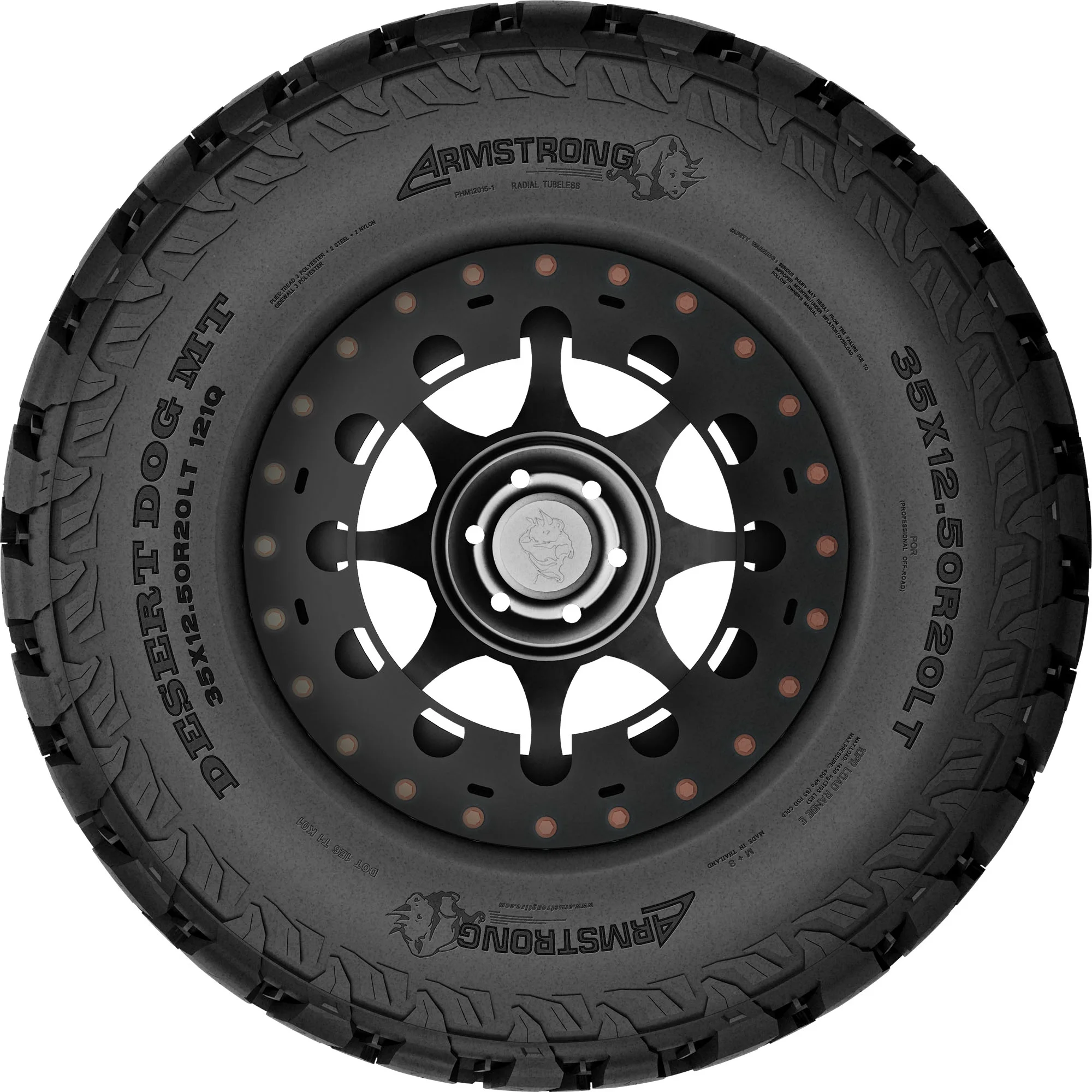 Armstrong Desert Dog MT LT33X12.50R20 119Q F OVERVIEW The Armstrong Desert Dog MT is a mud terrain tire that’s designed for use on light trucks and SUVs, and is ready for the roughest conditions. The Desert Dog MT features Armstrong’s aggressive Tuff Tusk tread blocks with built-in stone ejectors for solid traction, and a tough 3-ply polyester reinforced sidewall for extra durability. Wide scallops at the shoulder enhance lateral grip, and the Desert Dog MT’s tread compound is engineered for both traction and damage resistance.