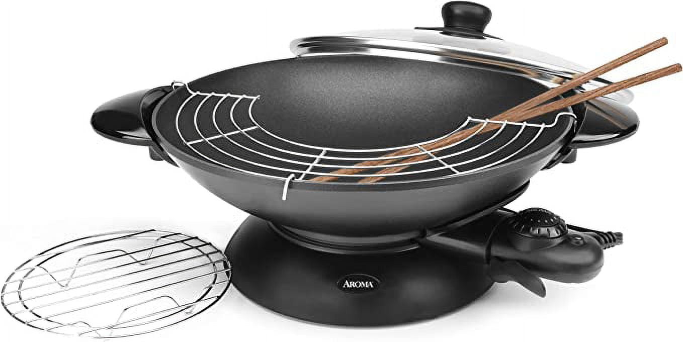 Stir-fry in style with the Aroma 5Qt. Electric Wok, Black (AEW-307); perfect for braising, tempura, steaming, and more. This sleek, cast metal wok has a nonstick coating, heats up quickly and retains heat for professional-tasting results every time. Includes all of the accessories you need to make all your favorite modern and traditional foods: long cooking chopsticks, a steam rack and a tempura rack. The large glass dome lid with adjustable steam vent allows for maximum cooking control. The entire unit easily detaches from the base and is dishwasher safe for easy cleanup and even easier storage.