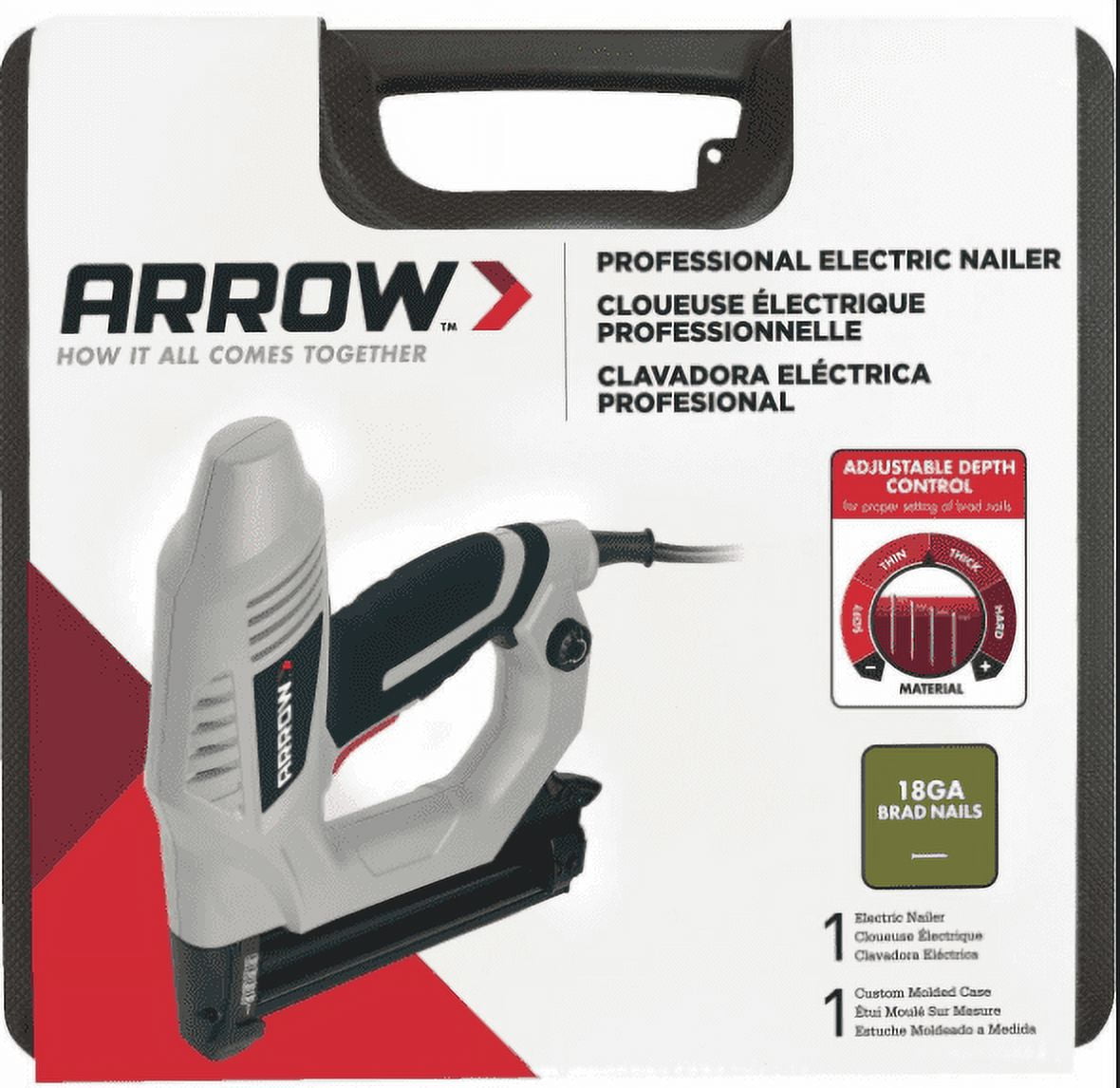 READY FOR ACTION: This electric brad nailer is a must-have for any projects that require brad nails, like trim, molding, framing, fencing, wood crafts, and more; It belongs in the toolbox of any builder or serious DIY-er TIPS FOR USE: For best performance, use two hands for better support & penetration; Prevent kick back by placing one hand on top of the nailer while the other hand presses the trigger; The soft comfort grip increases the ease of use for this nail gun PRO TIP FOR NAILS: The ET200BN works best with genuine Arrow brad nails: BN1810 5/8″, BN1812 3/4″, BN1816 1″, and BN1820 1-1/4″; For hard woods, such as oak & plywood, consider purchasing 5/8-inch or 3/4-inch which are best for penetrating this material GET THE POWER YOU NEED: Adjustable depth-control knob allows the operator to set the correct amount of power for every job, matching the size of the brad nail to the materials being fastened; Quick-release magazine makes reloading simple and efficient BUILT TO LAST: Includes carrying case for storage & portability; 6-foot power cord makes this easy to use in any workshop; If using with an extension cord, use a length less than 15-feet for maximum power; Contact safety prevents accidental misfires