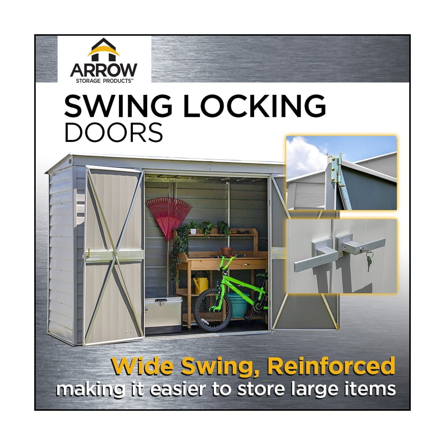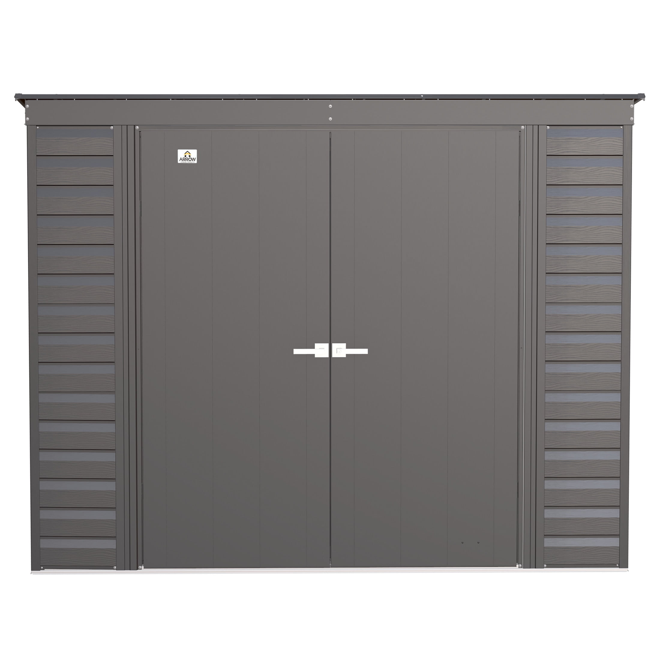 Made Of Sturdy Steel That Undergoes A Galvanization Process To Protect It From Long-Term Corrosion And Rust Features A Smooth, Durable Sherwin-Williams Polyester Paint Finish To Protect Against The Elements Add Additional Protection From Rust And Corrosion Horizontal Siding Panels Give It A Classy, Upscale Presence And Adds To Most Backyard Aesthetics Pent Style Roof Prevents Rainwater From Pooling, And Debris From Accumulating 71 In. Tall Walls Provide Extra Headroom And Vertical Storage Space So You Can Easily Stack Items High. Offers Added Entryway Clearance Swing Doors Increase Usable Storage Space, And Includes Integrated Keyed Brusthed Metal Locking Handles For Added Security And A Sophisticated Look Built-In Vents Allow Air To Circulate Event When The Doors Of The Unit Are Closed Includes A 12 Year Limited Warranty With Globally Sourced Material Compatible With Arrow Floor Kit Item Fkcs02