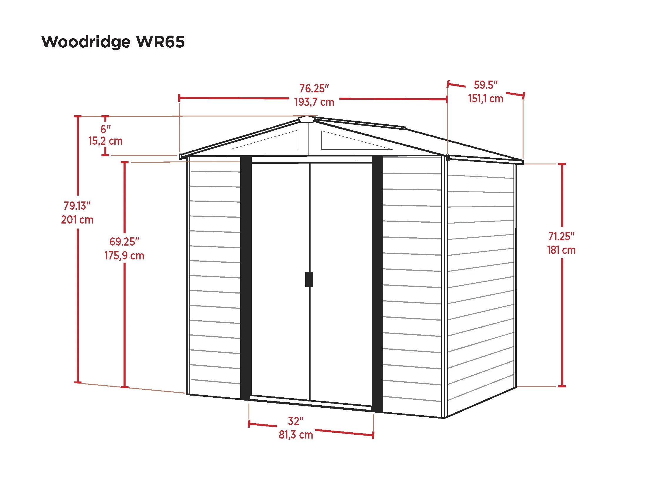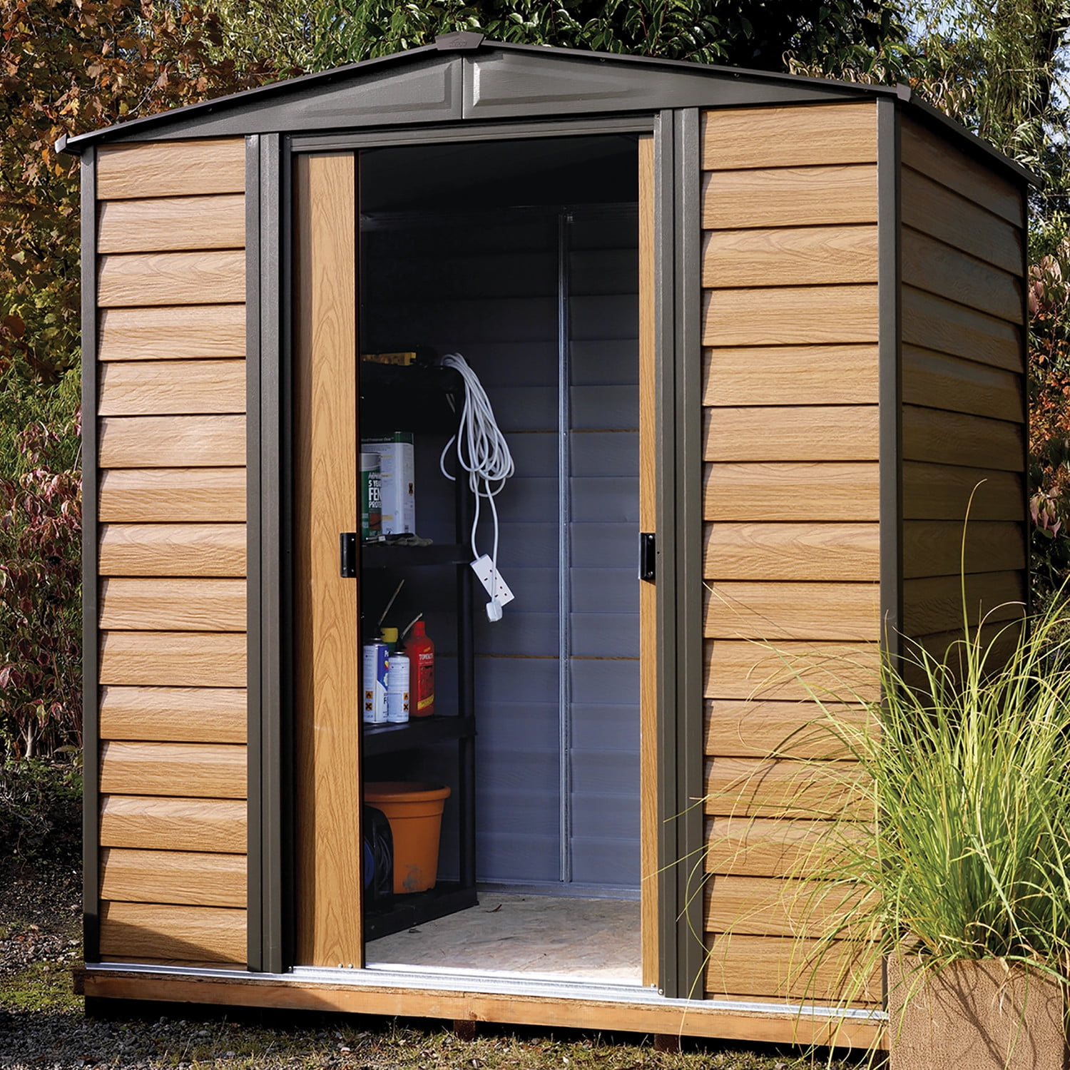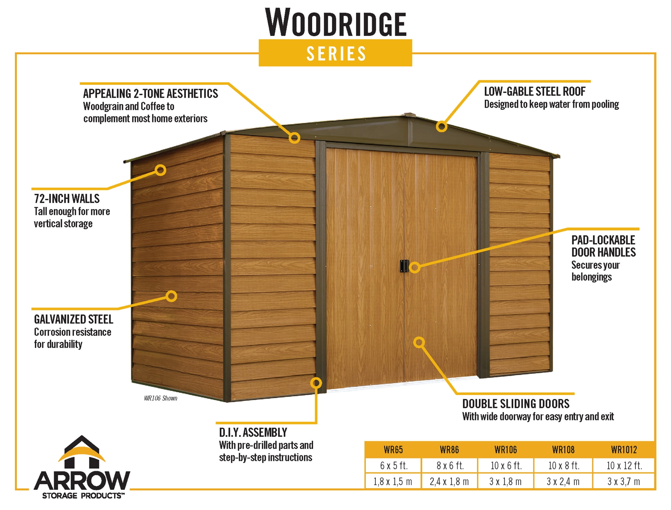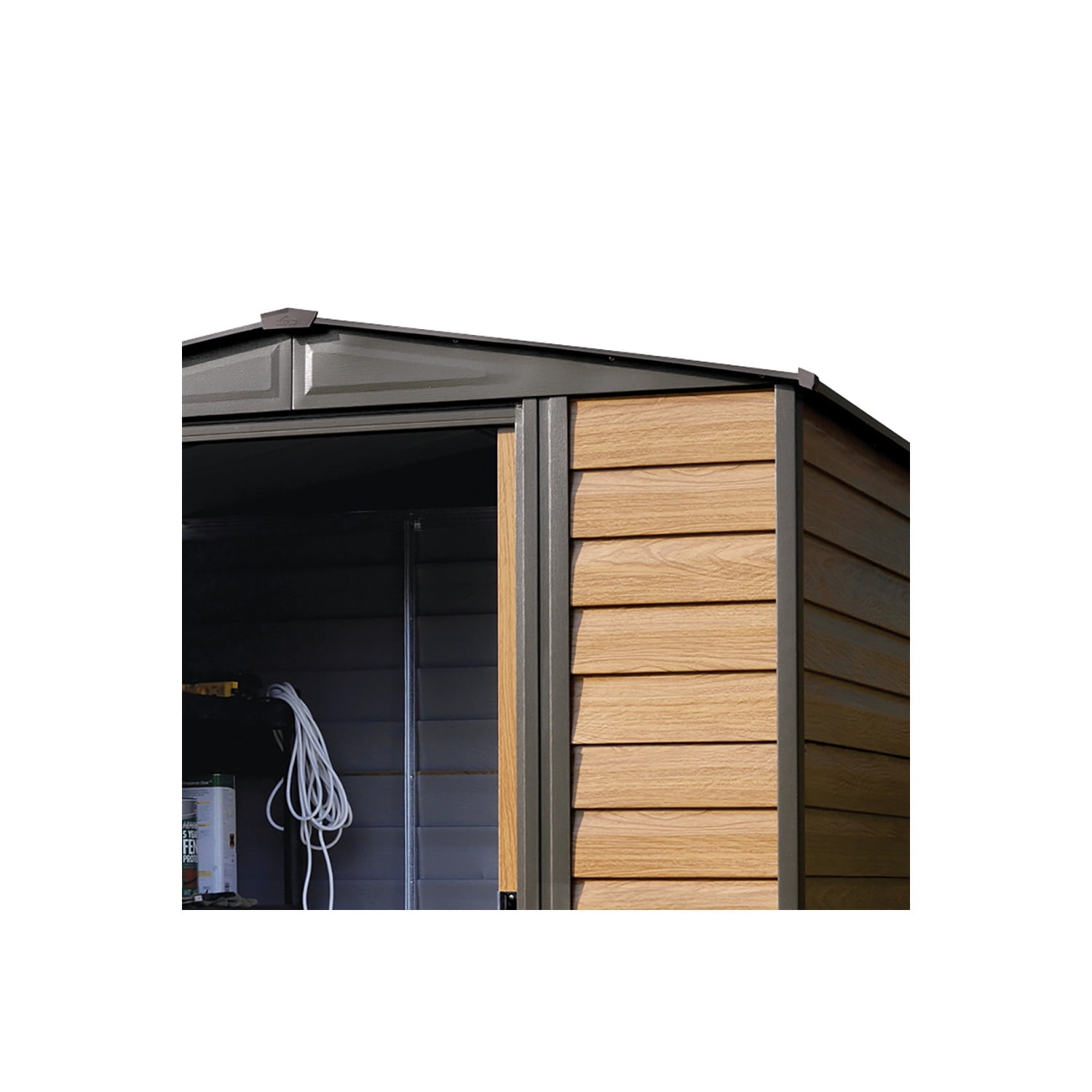 Arrow Woodridge Storage Shed Style: Peak Material: Galvanized Steel Color: Woodgrain with Coffee Trim Door Type: Sliding Nominal Size: 6 ft. x 5 ft. Total Storage Area: 27 sq. ft. Total Storage Volume: 167 cu. ft.