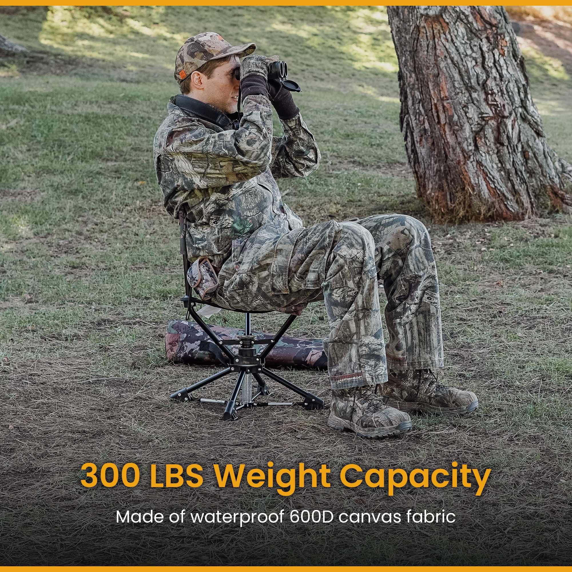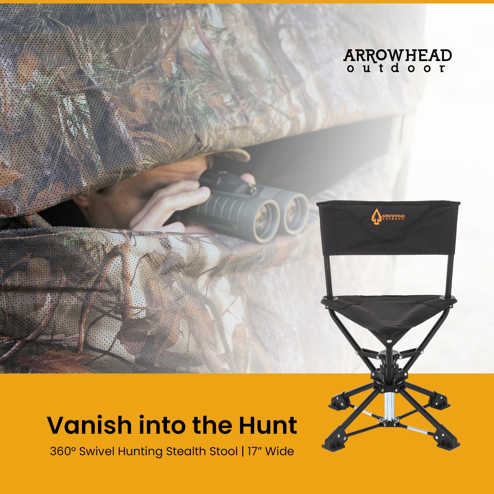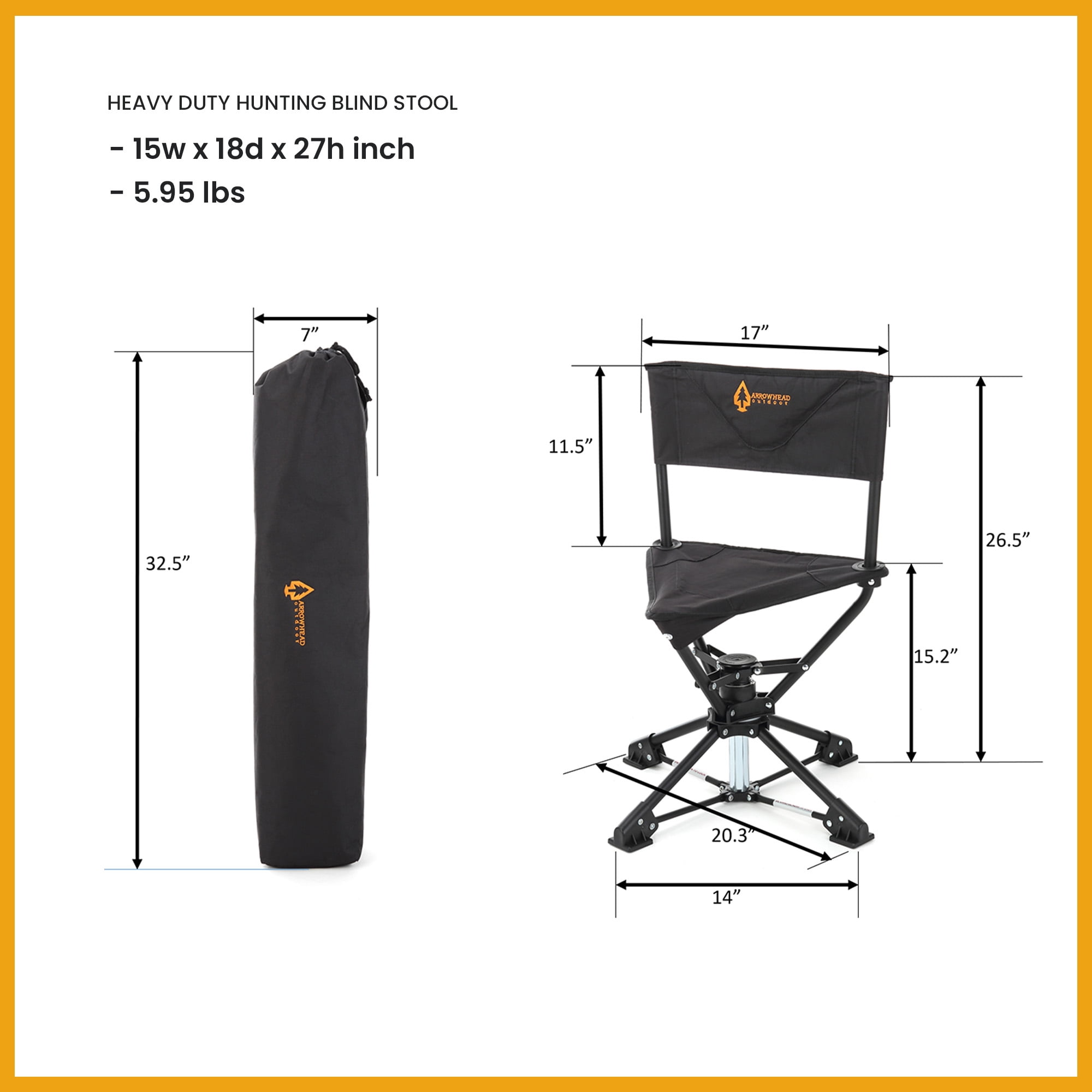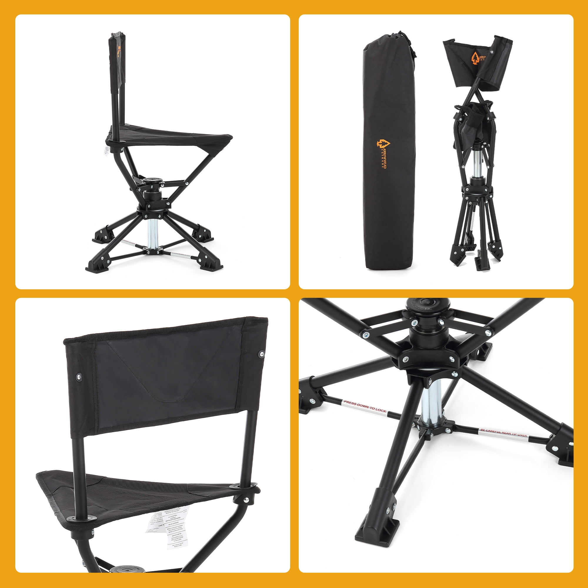 o [SILENT & STEALTHY 360° DEGREES OF ARTICULATION] – Effortless and quietly spins 360° for maximum mobility. Never spook a buck, tom, or boar. o [WIDE STABLIZING FEET] – Extra wide feet to prevent sinking in dirt, mud, and bogs. Perfect for wetland blinds to dryer hillside blinds. o [COMPACT LIGHTWEIGHT TRANSPORTATION FROM BLIND TO BLIND] – Includes carry bag with sling. Maximizes mobility when moving from blind to blind. Measures 20.3”L x 20.3”W x 26.5”H when setup. o [HEAVY-DUTY SOLID CONSTRUCTION] – Heavy-duty steel frame construction with rugged 600D canvas fabric. o [LIFETIME USA SUPPORT] – Whether you’re under the stars surrounded by Joshua Trees, looking up at giant redwoods, on a Rocky Mountain High or under a Big Montana Sky; ARROWHEAD OUTDOOR is standing by in Atlanta, Georgia to help keep you adventuring.