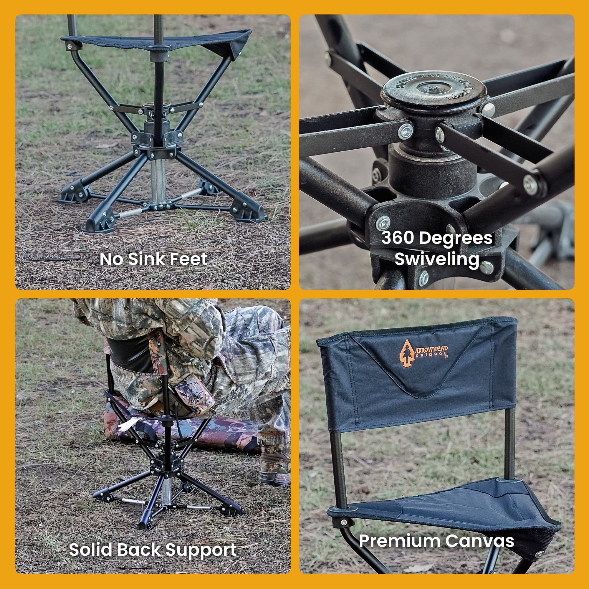 ARROWHEAD OUTDOOR 360° Degree Swivel Hunting Chair Stool Seat, Perfect for Blinds, No Sink Feet, Supports up to 450lbs, Carrying Case, Steel Frame, Fishing, High-Grade 600D Canvas, USA-Based Support