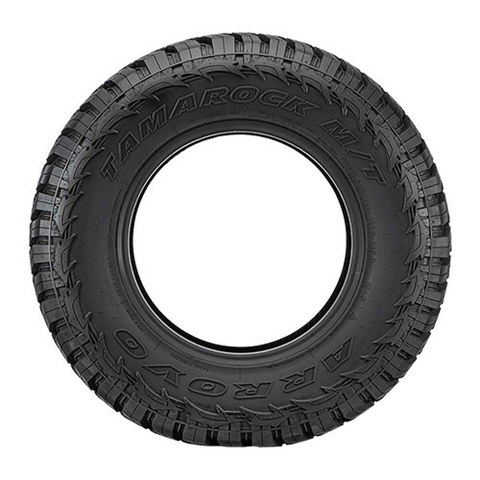 Arroyo Tamarock M/T FEATURES AND BENEFITS Mud terrain traction Enhanced controllability All season traction Better damage resistance OVERVIEW The Arroyo Tamarock M/T is a mud terrain, all season tire manufactured for light trucks and SUVs. Arroyo offers a 40,000 mile treadwear warranty with this tire model. Excellent mud terrain traction is guaranteed thanks to the aggressive footprint. The tread’s staggered block pattern and optimal void ratio greatly enhance the soft, loose and uneven terrain grip, ensuring the tire’s forward motion at all times. Better off-road traction improves the tire’s performance through deep mud and on loose dirt. The self-cleaning tread design allows the tire to disperse mud and snow from the footprint. In this manner, they cannot pack between the tread elements and block the tire’s surface contact. This results in the tire’s overall off-road terrain performing safety. The flat footprint ensures the tire’s constant surface contact, which increases the controllability. The tread allows the tire to enhance the steering responsiveness and the driving stability. As a result, the tire upgrades the steering response time and accuracy to the driver’s commands, while the structure is secured against the driving pressure during the performance. The tire also features a reinforced internal structure, which significantly boosts the tire’s load capacity. Since the construction does not deform, the tire is able to securely increase the load carrying and withstanding power. This guarantees the tire’s overall load capacity. This model provides a secure all weather traction. The aggressive tread design with the optimal siping placement and the silica compound enhance the dry, wet and winter weather grip. The silica elements of the compound keep the rubber flexibility while the tires are in motion, while the tread design optimizes the surface grip. This combination guarantees the tire’s exceptional year round performing ability. The Tamarock M/T guards its tread area and casing from damage. This is achieved with the tread design, the stronger structure, and the tread’s self-cleaning nature. The stabilized tread elements with the rigid center elements avoid tread damage, such as the tread’s chipping, cracking, and tearing. The reinforced construction protects the casing from punctures, cuts, and impact damage. The tread’s self-cleaning ability eliminates rocks stuck between the tread elements, effectively preventing stone retention from shortening the service life. Manufacturers recommend changing tires every 10 years. As long as tires are properly stored before they are sold, the year of their manufacture will not shorten their service life.