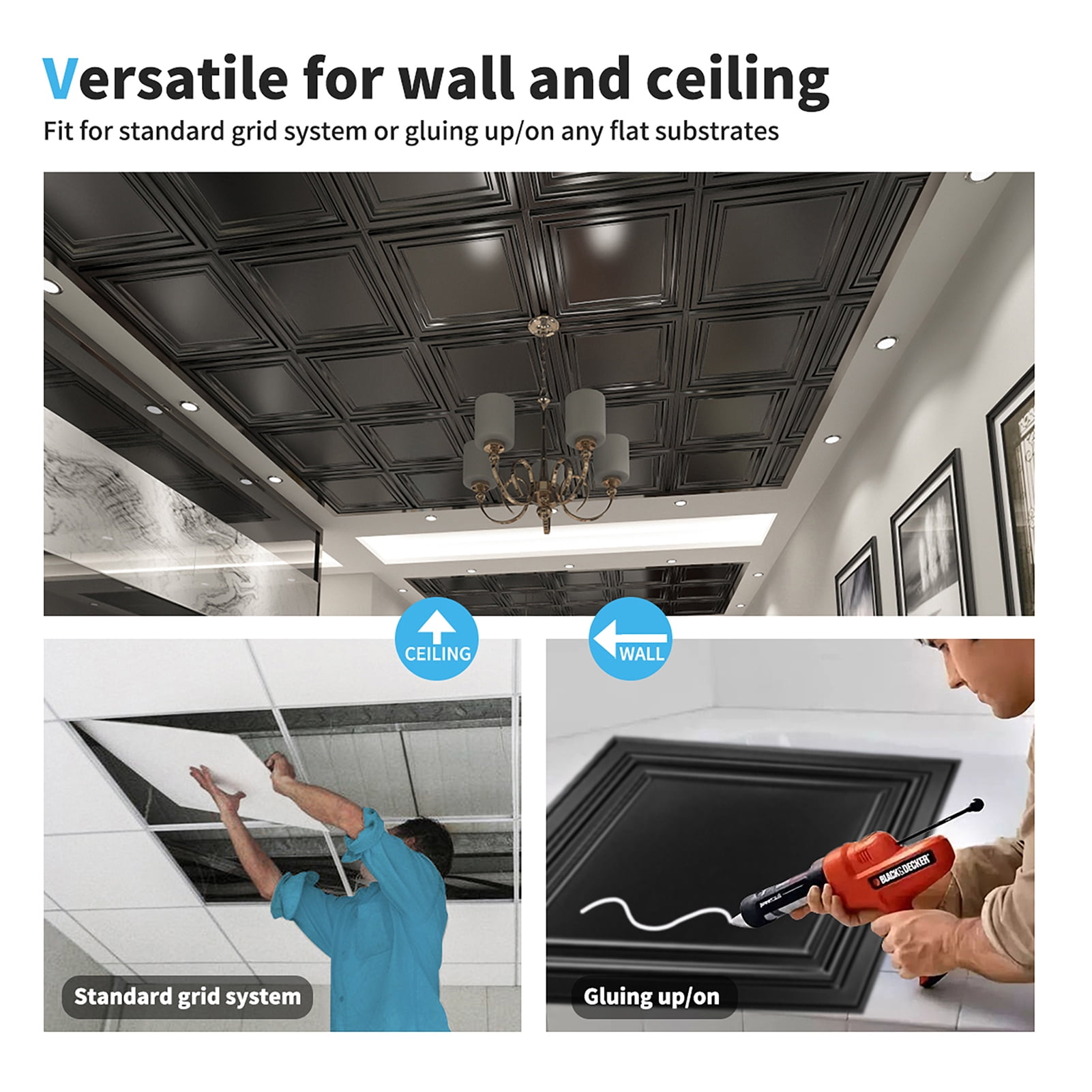 Art3d ceiling tiles/panels are fabricated from the classic, stylish and elegant designs. It’s made of premium PVC, which is thin, lightweight, paintable, humidity and corrosion resistant, extremely easy to work with. It can be cut with a snip, scissors, or utility knife, won’t create any dust. It won’t absorb moisture and stain, won’t crack when moving of it. It’s per tile size 24″ x 24″, designed to install both for dropping in a standard 15/16’’ T bar grid system and Gluing up on any flat substrates. Since it’s pretty light, you can process the installation just by yourself.