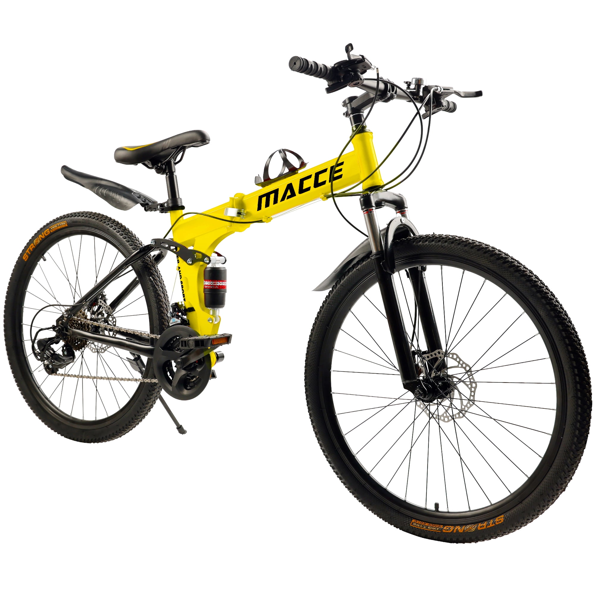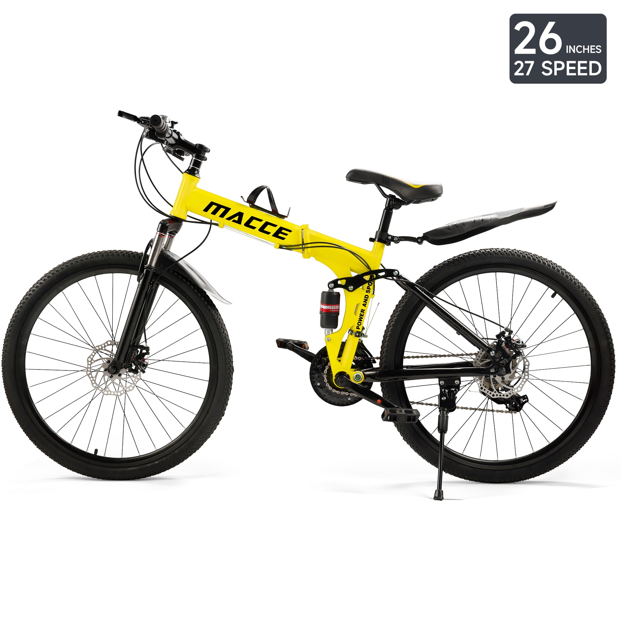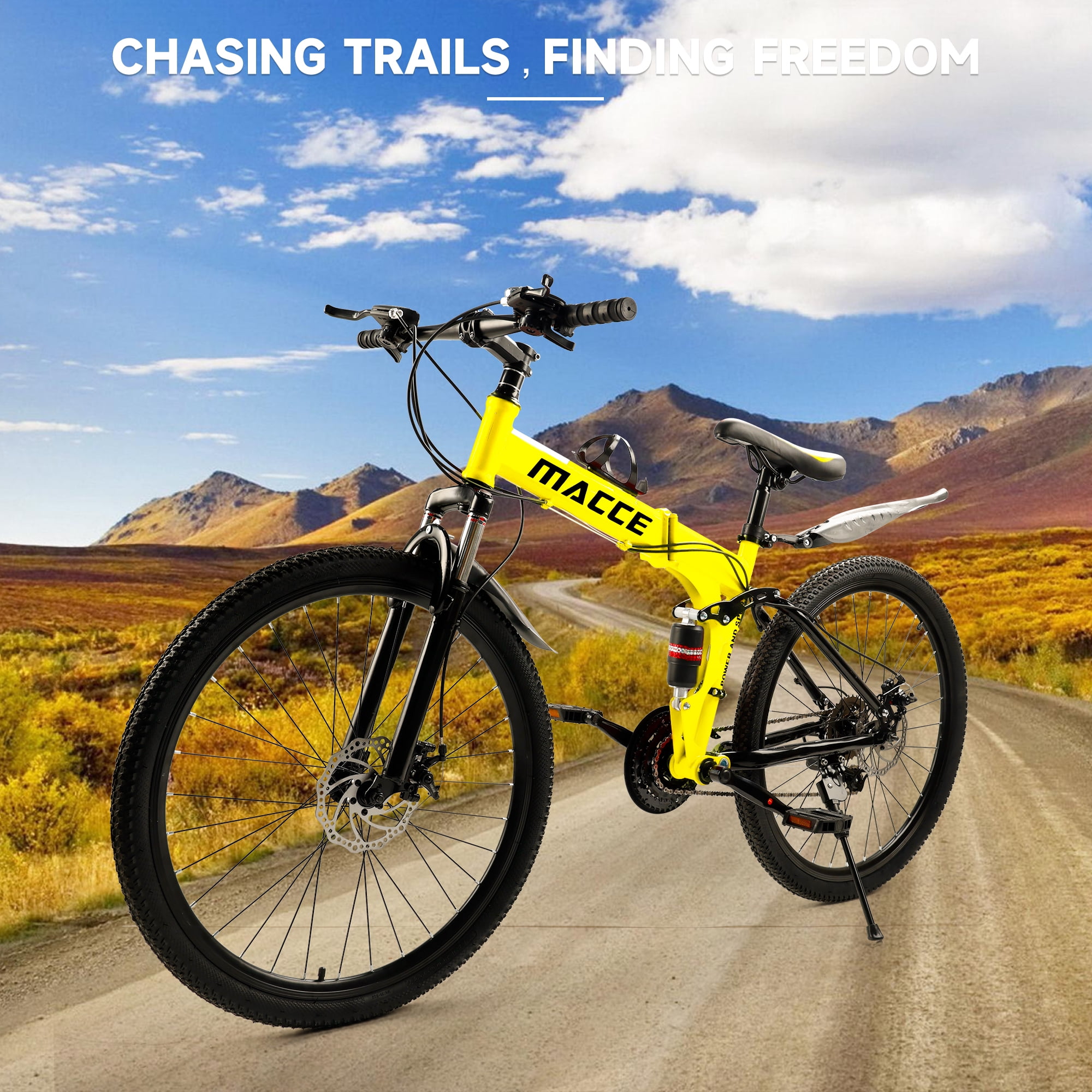 ARTUDATECH 26 Inch Folding Mountain Bike 27 Speed Full Suspension MTB ARTUDATECH 26 Inch Folding Mountain Bike 27 Speed Full Suspension MTB Foldable Bicycle Artudatech’s premier mountain bike, tailored for today’s adventurers conquering rugged trails. Our mountain bike epitomizes versatility and performance, featuring a foldable design for effortless transport and storage convenience. Engineered with cutting-edge suspension technology, each ride promises unmatched comfort and control over various terrains. Enhanced with precise disc brakes, our bike ensures reliable stopping power, instilling confidence in every descent. Crafted from high-grade carbon steel, the frame offers enduring durability and stability, complemented by lightweight aluminum alloy rims for agility and resilience. With its 27-speed capacity and intuitive gear shifting mechanism, every detail is meticulously designed for the ultimate riding experience. Experience peak mountain biking excellence with Artudatech. Specifications: Color: Black / White / Red / Yellow Speed: 27-speed versatility for varied terrain Frame: High carbon steel construction for durability and stability Front Fork: Spring Suspension Fork for enhanced shock absorption Hub: Disc brake hub for reliable performance in all conditions Center Shaft: 3S sealed shaft for smooth pedaling experience Thumbshift: One-piece thumbshift for intuitive gear changes Chain: 110-speed variable chain for seamless transitions Flywheel: 9-speed tower wheel for efficient power transfer Brakes: Dual disc brakes for responsive stopping power Rim: Lightweight aluminum alloy rims for agility and durability Package Includes: 1 Foldable Mountain Bike 1 Assembly Tools 1 User Manual 1 Bike Lock 1 Air Pump 1 Bike Bell 1 Cup Holder as a special gift