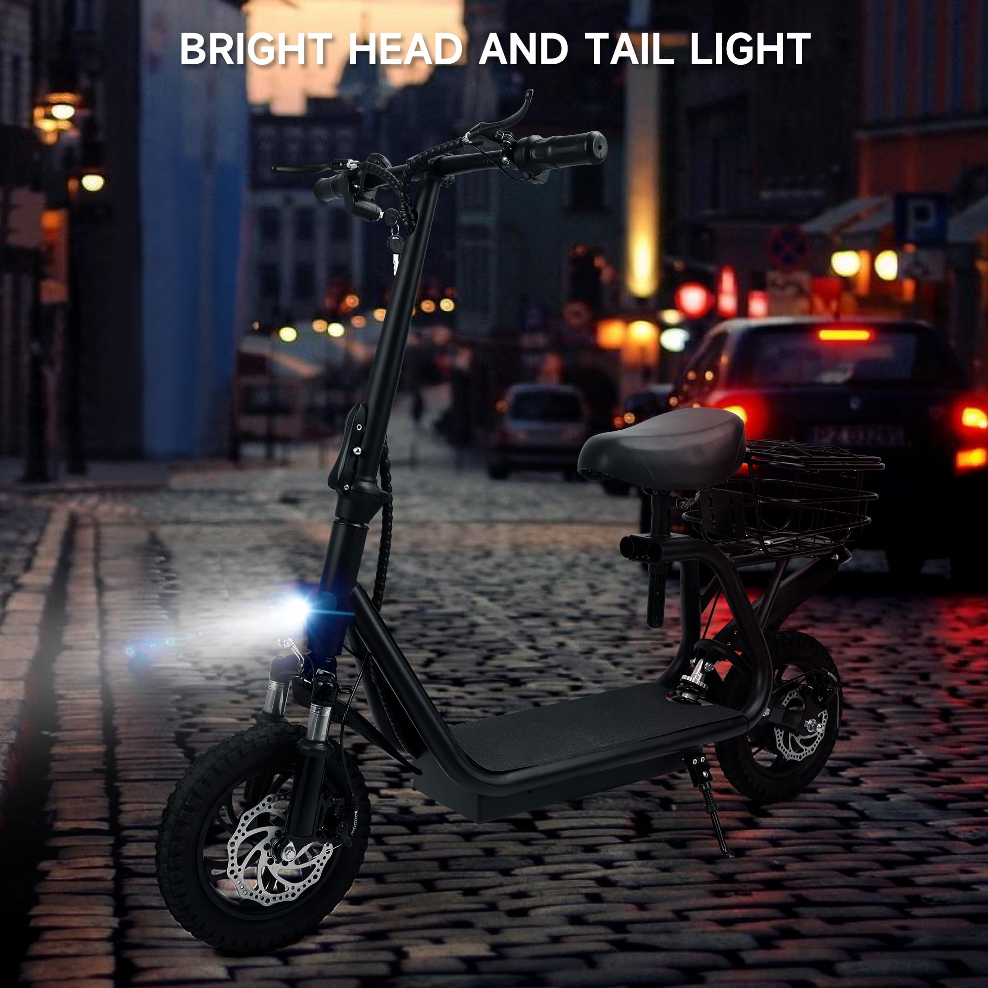 Ride Comfortably: The scooter’s wide pedals and front shock absorber ensure a smooth ride Handy Basket: Comes with a rear basket for added storage, making your commutes and quick errands more convenient Reliable Braking System: Equipped with a front drum brake and rear disc brake to ensure safety at all times Superior Traction: The 12-inch tires with a distinctive circular pattern deliver excellent grip and stability, even on uneven surfaces Compact & Portable: Its foldable design is perfect for those with limited space or those on the go—making storage and transport a breeze