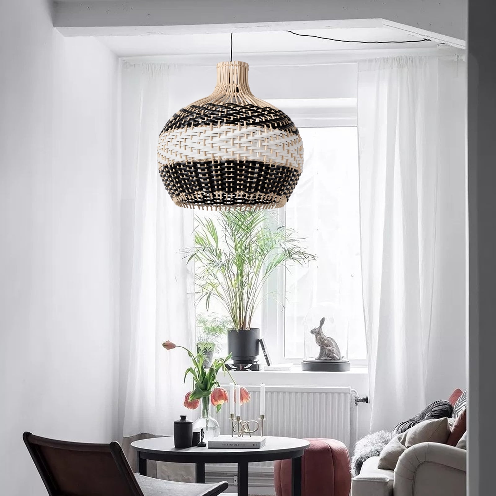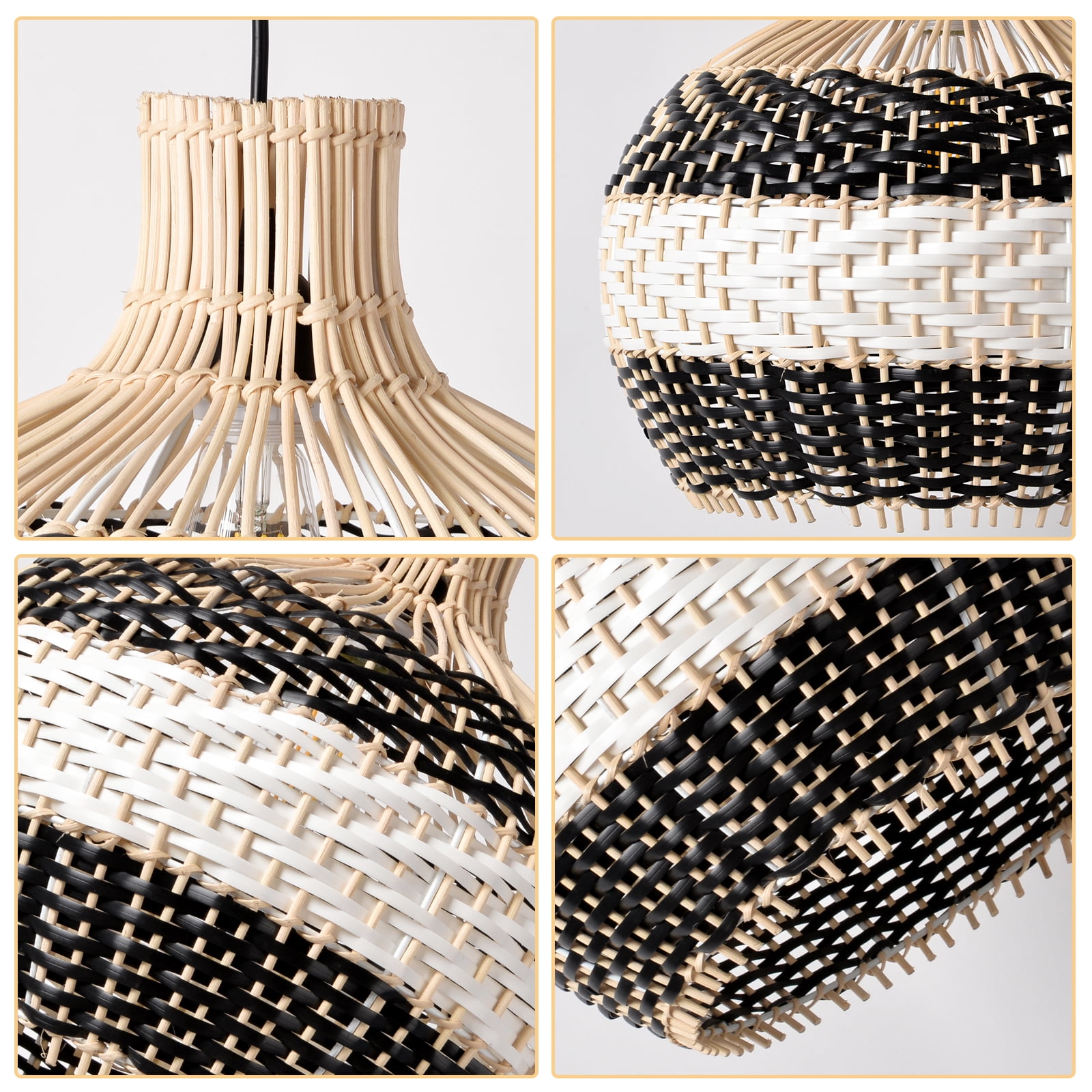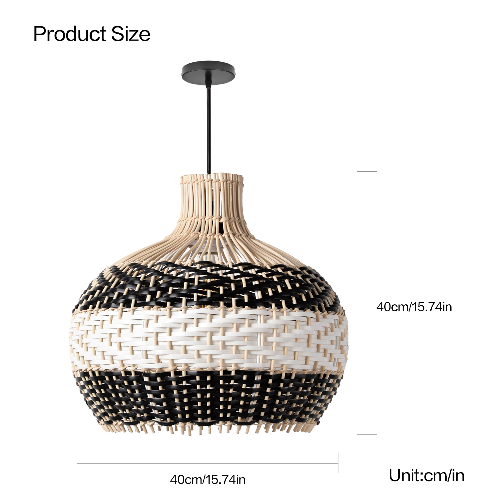 Dimensions: 40x40x40 cm/15.74×15.74×15.74 inches; 50x50x50 cm/19.68×19.68×19.68 inches;60x60x60 cm/23.62×23.62×23.62 inches; Cord(Hardwired): 6.5 FT/200 CM for the white cord.(Adjustable); Wiring Type:Hardwired Lamp Holder: E 26/27 Lamp Base Voltage: 110-240V Technics: Hand Knitted Power Source: Corded Electric Installation Type: Hardwired Pendant Cord Is Bulbs Included: No Number of light sources: 1 Lights Certification: CCC/UL/CE Material: Rattan Lampshade Color: Black Light Source: Energy-saving LED bulbs, incandescent bulbs, the maximum recommended bulb power ≤60W Ceiling Canopy: White (All mounting hardware Accessories includes) Maintenance: Wipe with a clean damp cloth