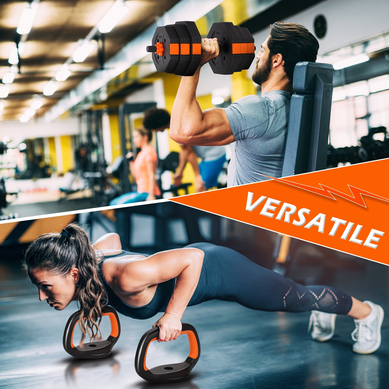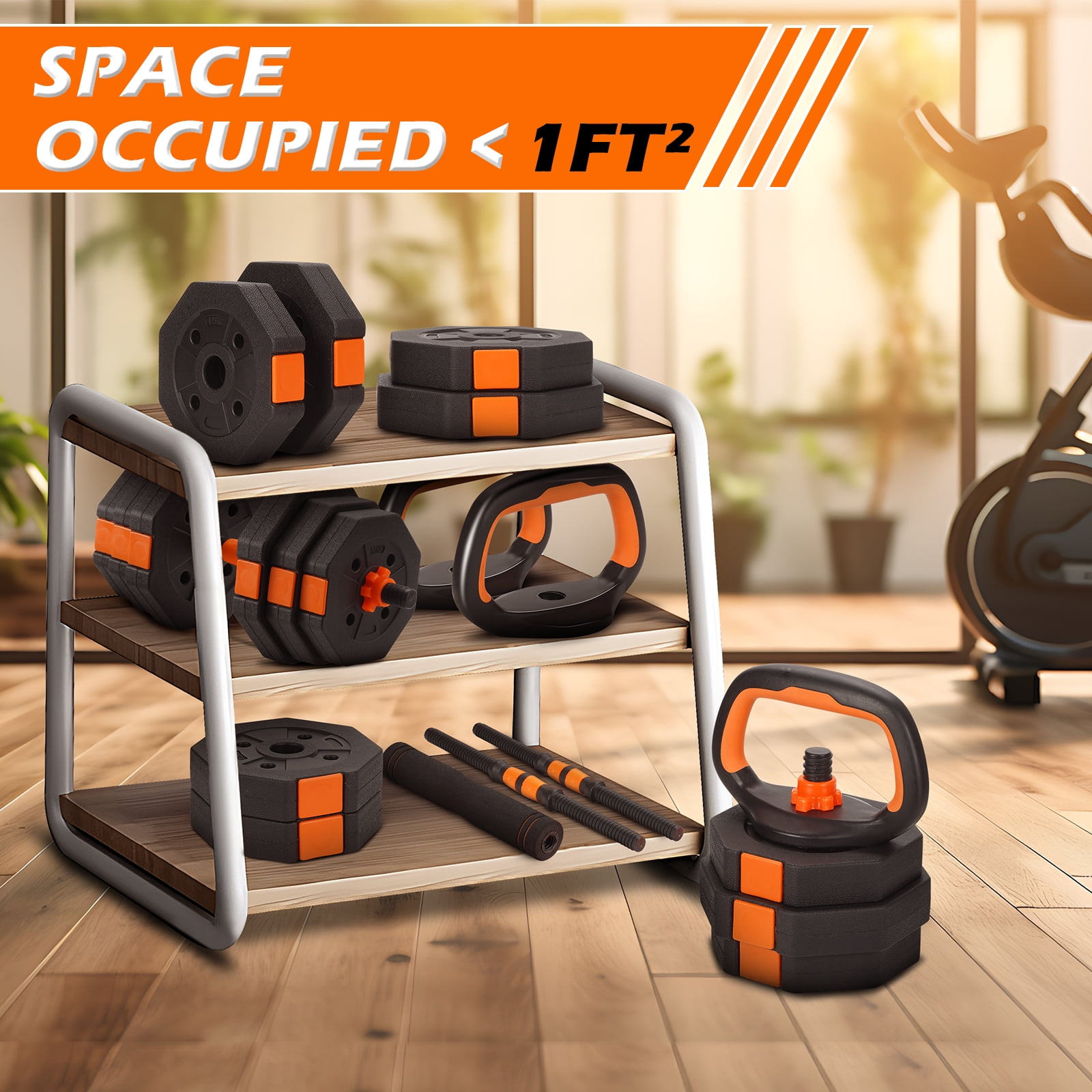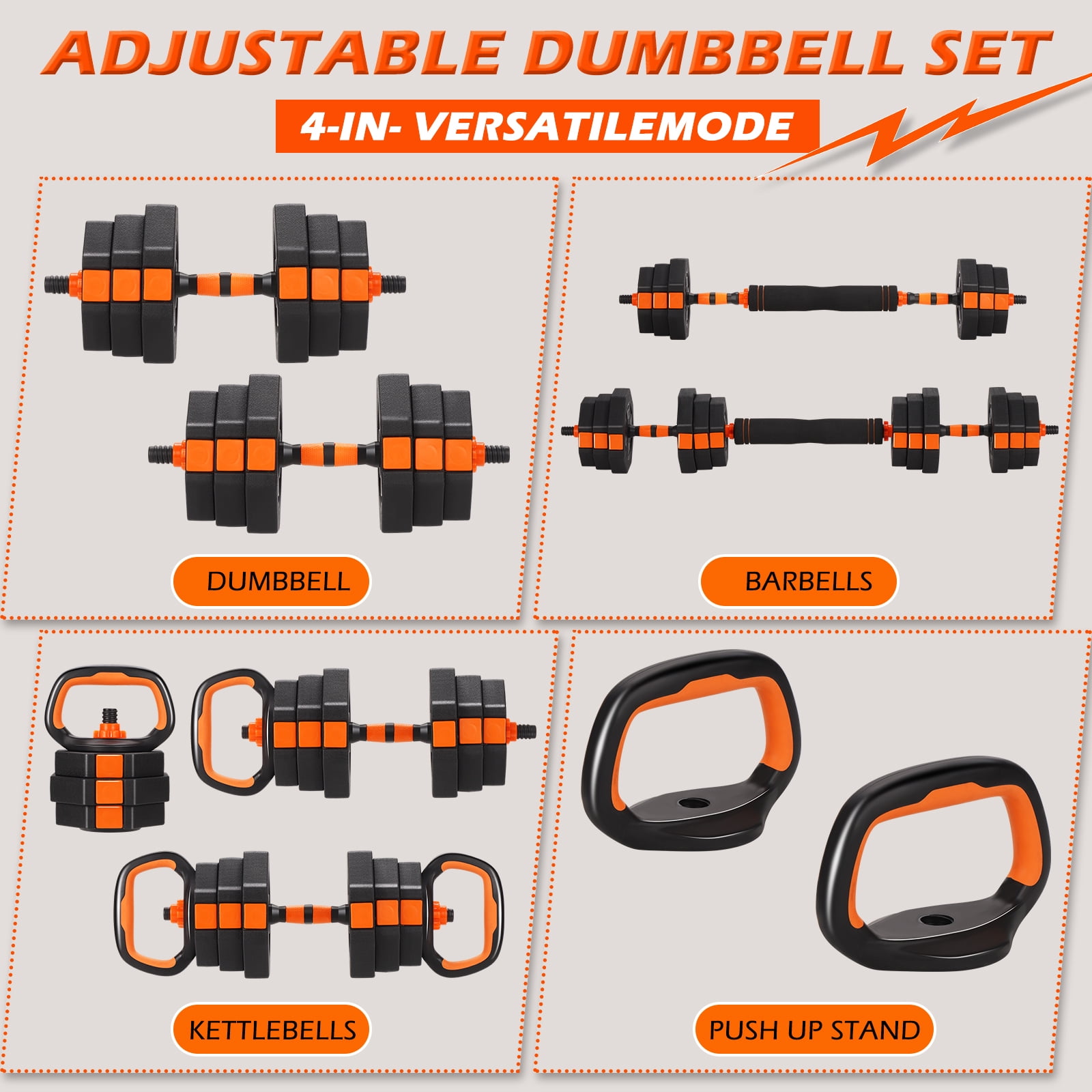 ARVAKOR 66Lbs Adjustable Dumbbell Set – Octagonal Anti-Roll Design, Non-Slip Grip, Versatile Weights with Barbell, Kettlebell, Push-Up Options, Orange
