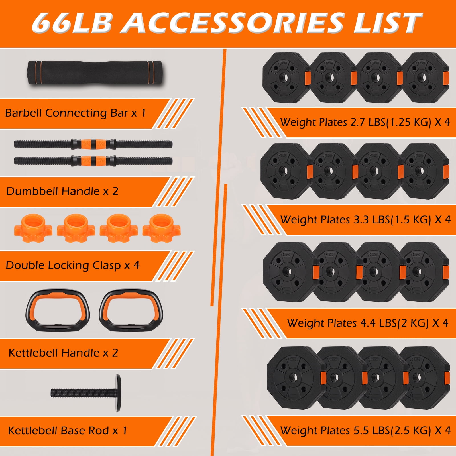 Versatile training equipment that can convert into dumbbells, barbells, kettlebells, and push-up stands for a wide array of strength exercises Innovative octagonal-shaped plates prevent rolling, enhancing safety and allowing for seamless transitions between exercises Premium quality and durable construction with eco-friendly PE material and robust cement and iron sand mixture for a focused workout session every time Ergonomic, foam-padded bar with upgraded safety nuts for a non-slip, secure grip and comfort that adapts to the natural contours of your hands and neck Adjustable weight range from 5-33 lbs for dumbbells, 5-66 lbs for barbells, and 2.5-16 lbs for kettlebells, perfect for diverse exercises and progressive training to ensure your fitness journey evolves Ready to use straight out of the box, and ARVAKOR’s customer service team is always here to support you, ensuring you can focus on achieving your fitness goals