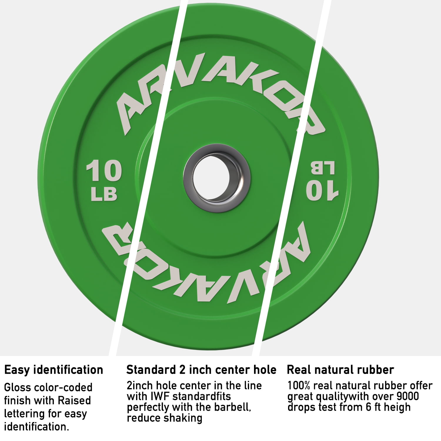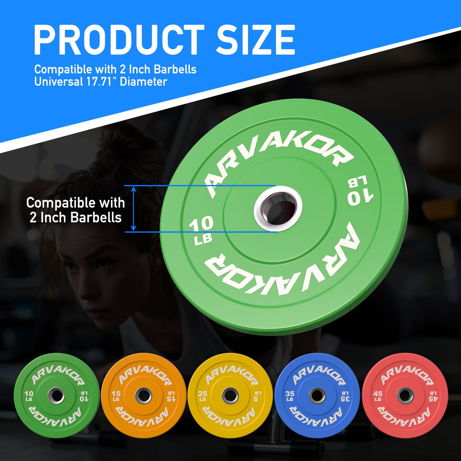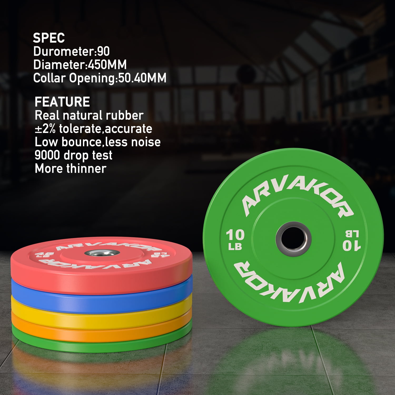 ARVAKOR Bumper Plate 2-inch, Color Coded Olympic Bumper Plate with Steel Hub, Bumper Weights Set with High Density Rubber Overview: Bumper plates, or just bumpers, are Olympic-sized weight plates that are made of thick, dense rubber for the purpose of allowing a loaded bar to be safely dropped without risk of damaging your lifting platform, the plates themselves, or the floor. High Density rubber plates with solid stainless steel insert can withstand repeated drops. They will not only protect any type of floors, but also protect your bars. Color coded based for easy identification. Weight is labeled in both pounds and kilograms. Good for strength training, weightlifting, crossfire, etc.