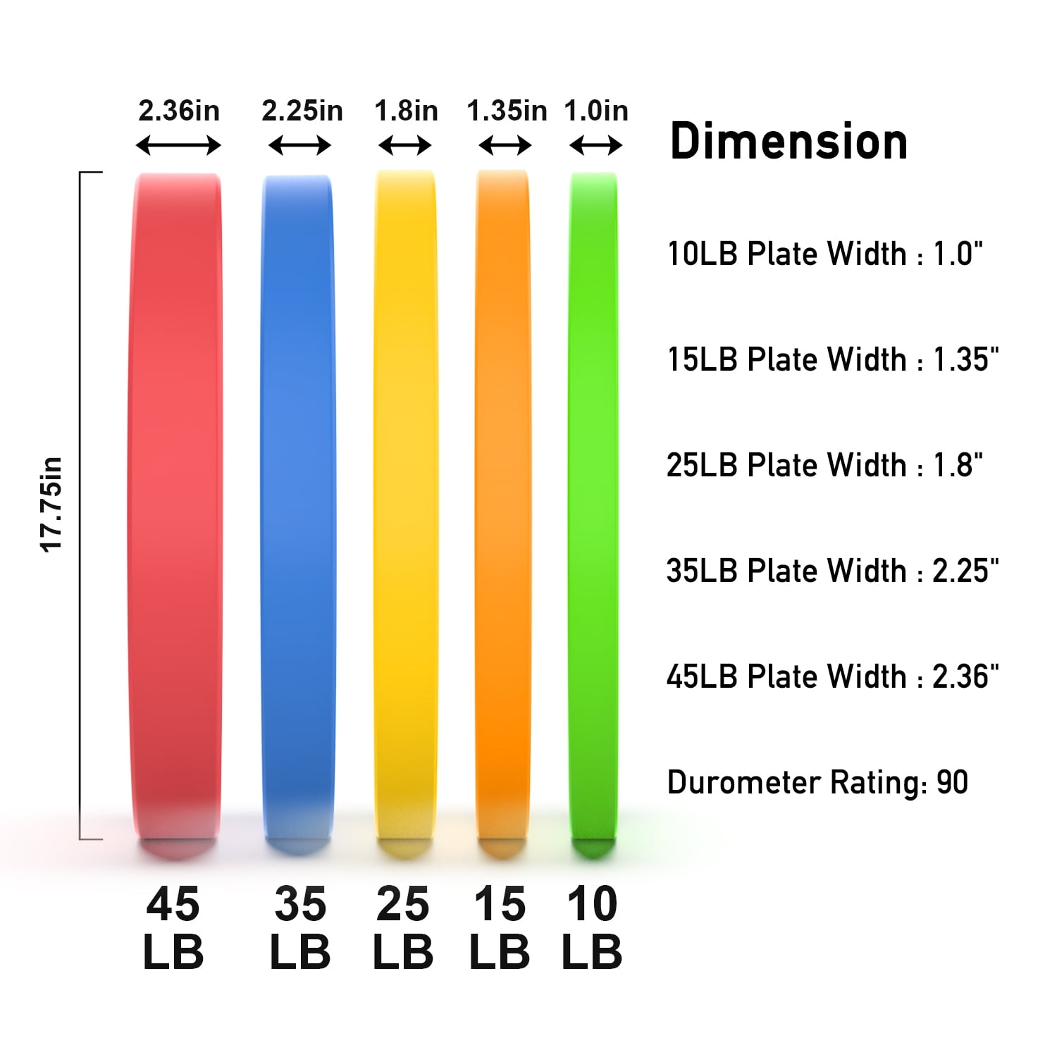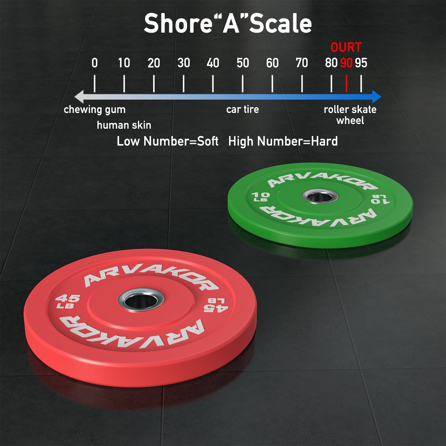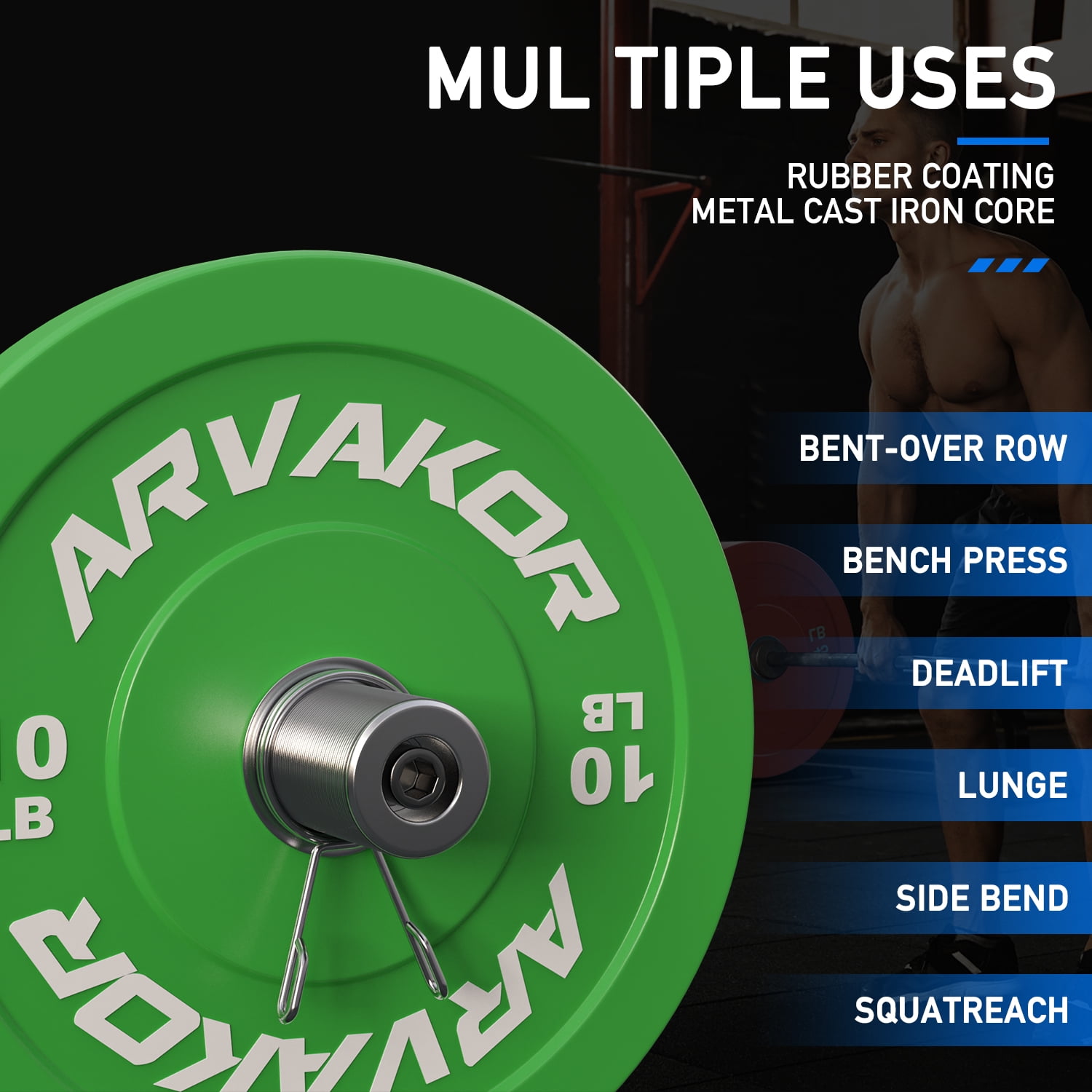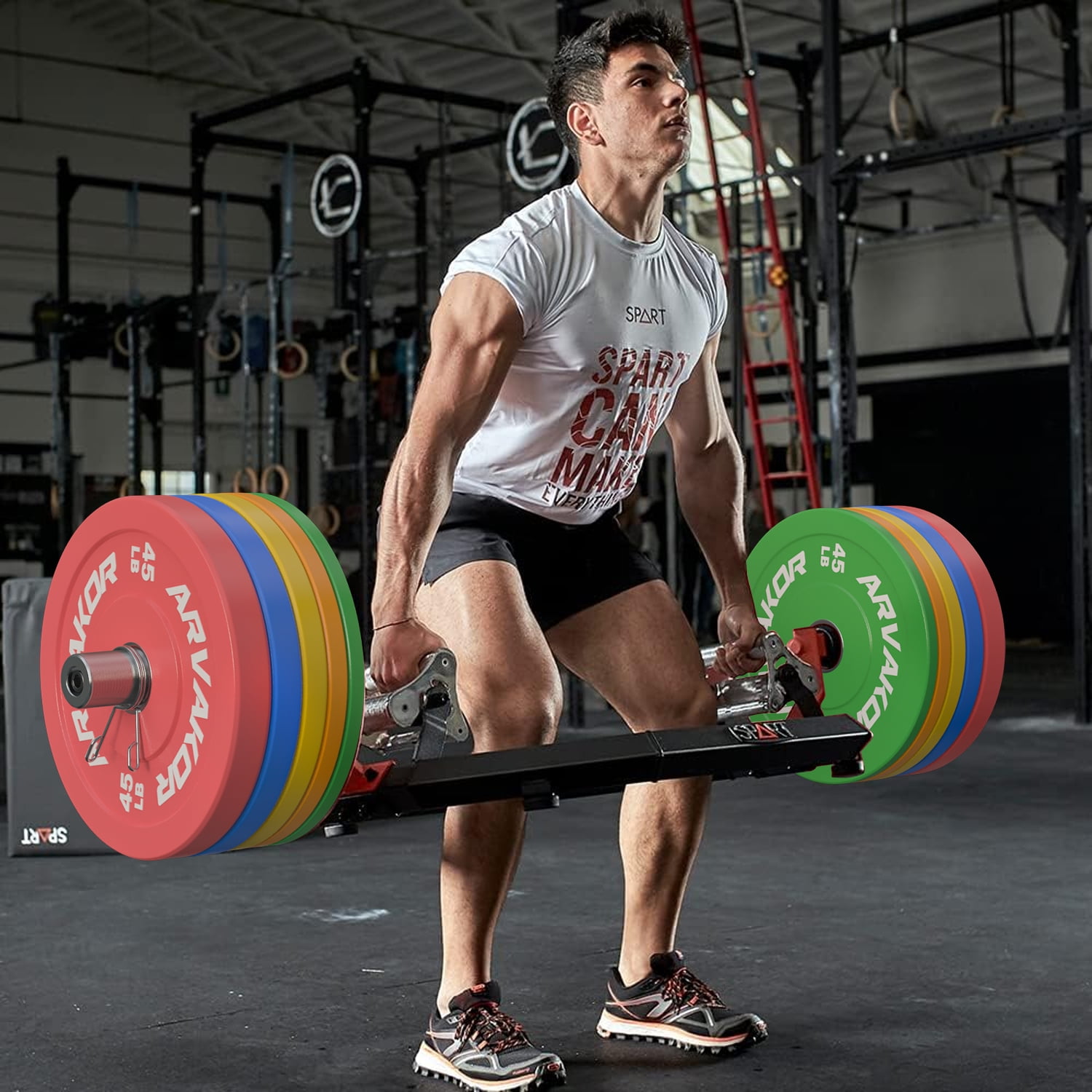 ARVAKOR Bumper Plate 2-inch, Color Coded Olympic Bumper Plate with Steel Hub, Bumper Weights Set with High Density Rubber Overview: Bumper plates, or just bumpers, are Olympic-sized weight plates that are made of thick, dense rubber for the purpose of allowing a loaded bar to be safely dropped without risk of damaging your lifting platform, the plates themselves, or the floor. High Density rubber plates with solid stainless steel insert can withstand repeated drops. They will not only protect any type of floors, but also protect your bars. Color coded based for easy identification. Weight is labeled in both pounds and kilograms. Good for strength training, weightlifting, crossfire, etc.