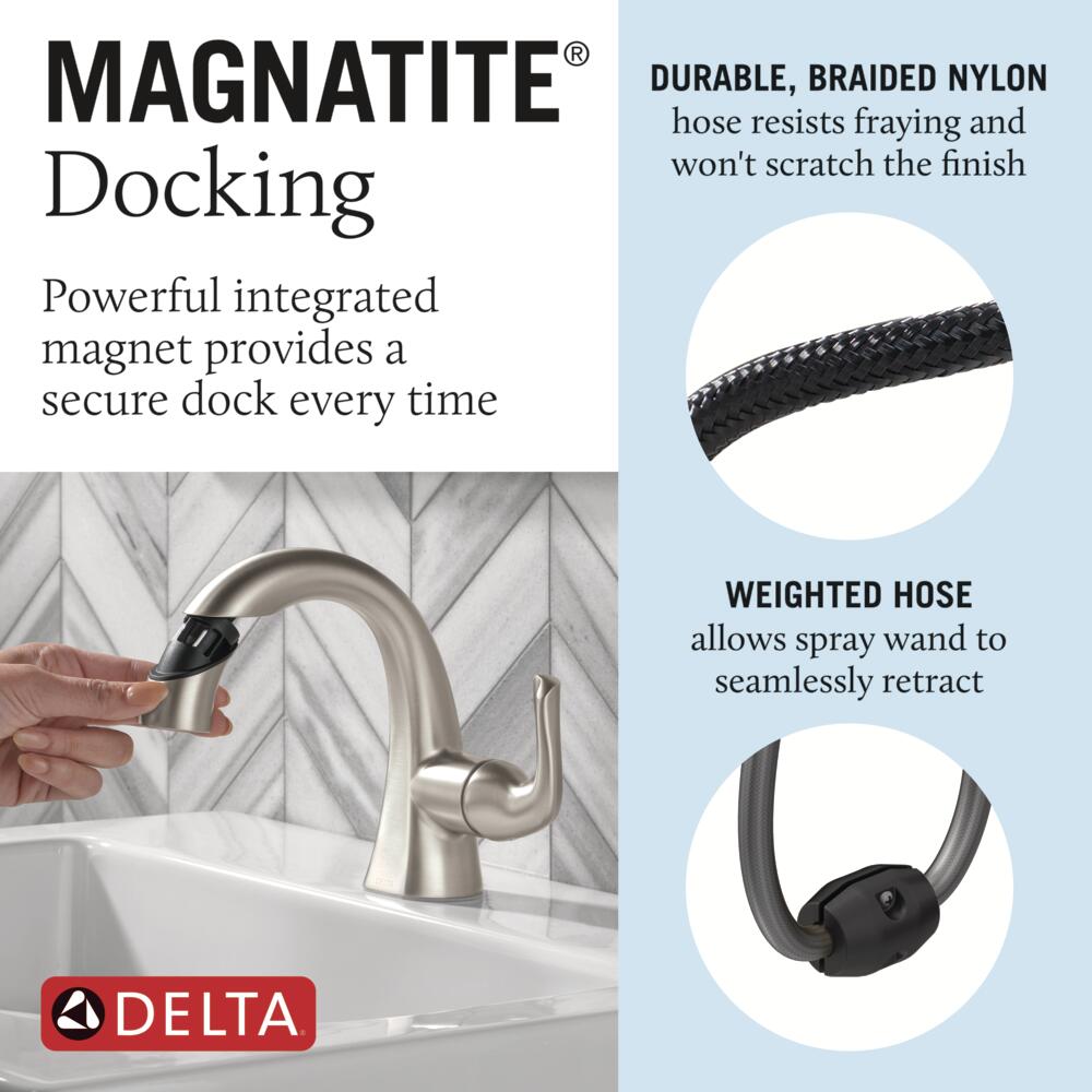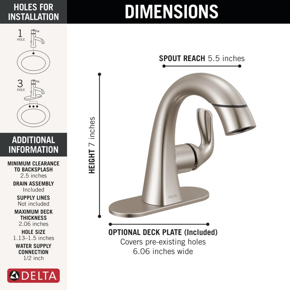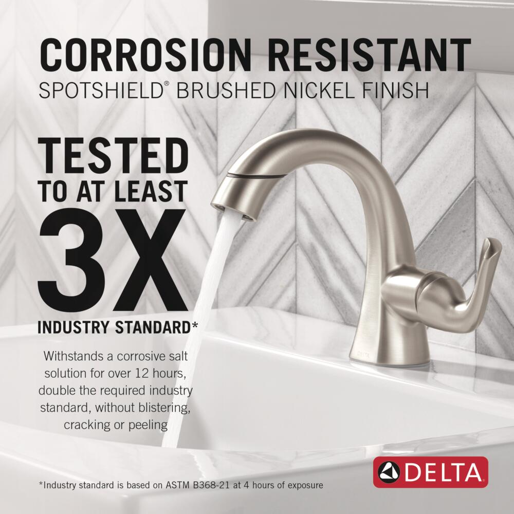 The fluid lines of the Arvo™ Bath Collection bring a delicate, serene look to the bath while an integrated pull-down spray wand simplifies cleanup. Delta® SpotShield® Technology helps to keep your faucet cleaner, longer by resisting water spots and fingerprints. You can install with confidence, knowing that Delta faucets are backed by our Lifetime Limited Warranty. Delta WaterSense labeled faucets, showers and toilets use at least 20% less water than the industry standard—saving you money without compromising performance.